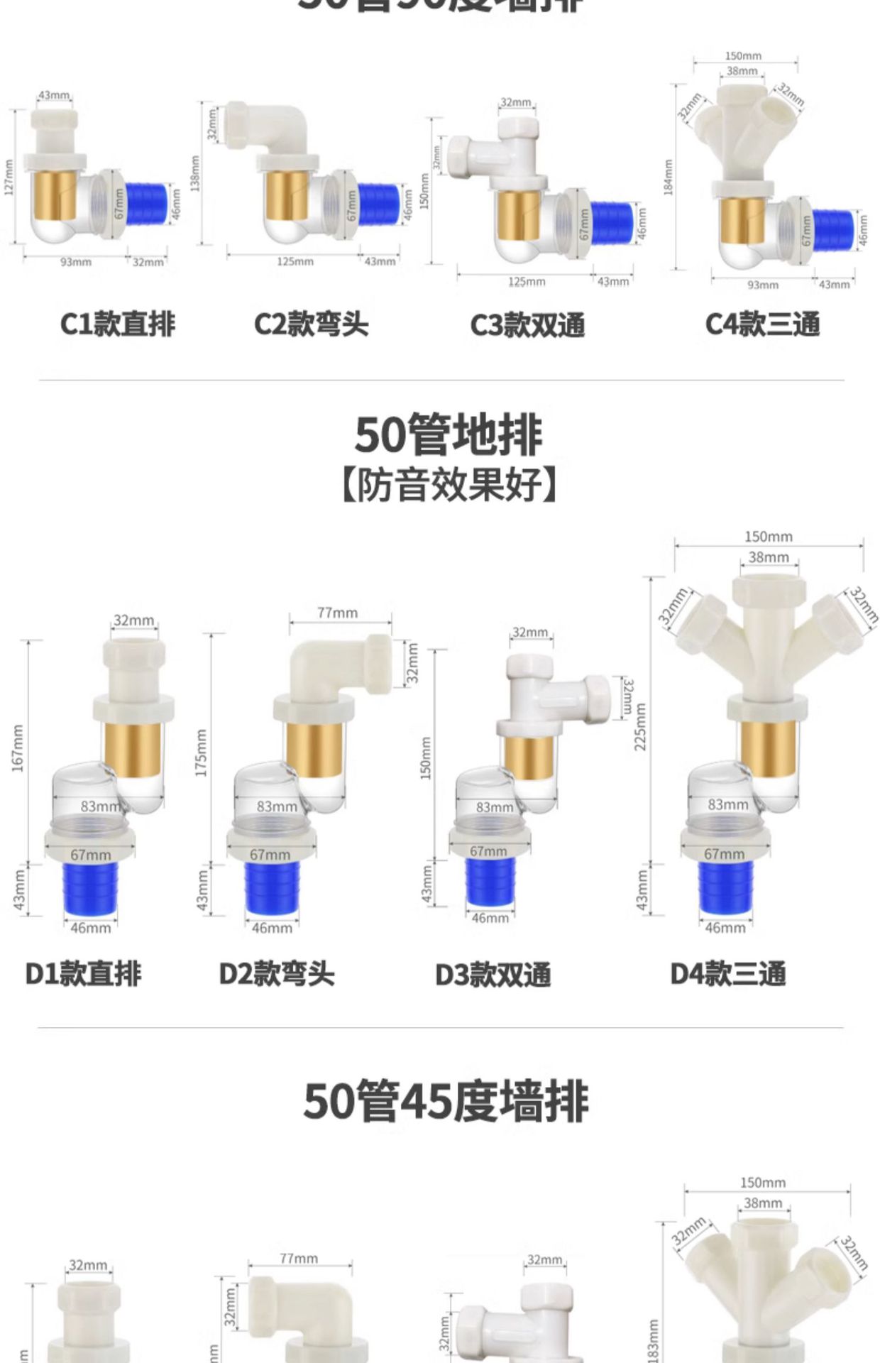 벽 배치 4590도 하수구 냄새 방지 주방 욕실 세탁기 역류 방지 밸브 3방향 조인트 통합 물 분배기스토어 가기