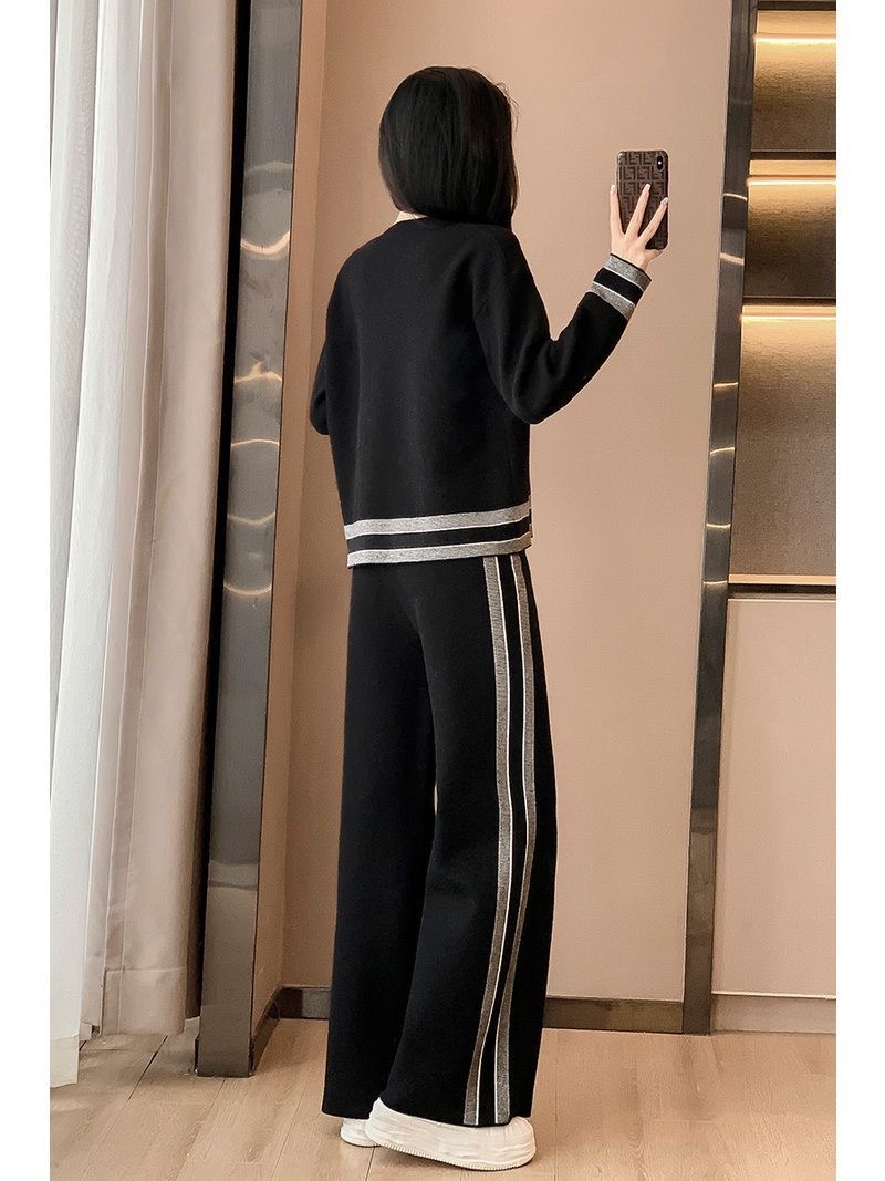 여성을위한 캐주얼 작은 향기로운 스웨터 스포츠 정장 2024 봄, 가을 새로운 패션 대형 와이드 레그 바지 여성을위한 투피스 세트