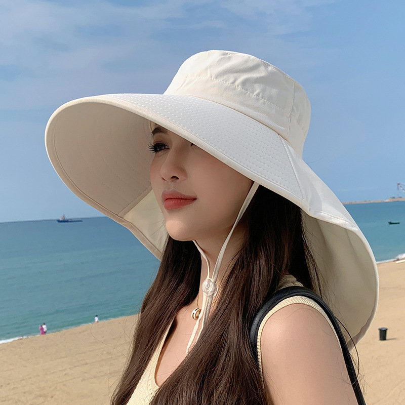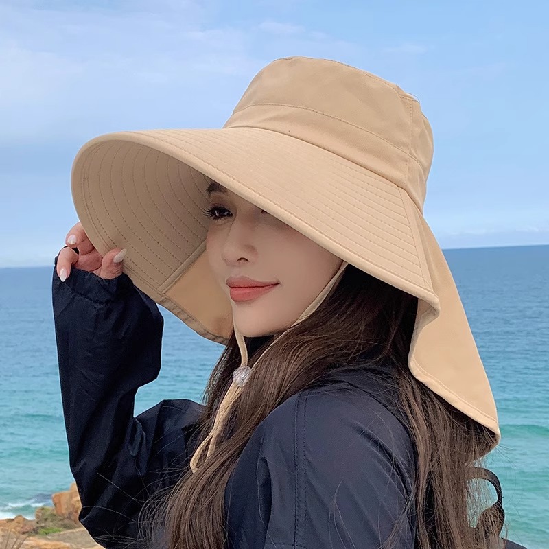 봄철 여성용 자외선 차단 모자, 패셔너블한 목 보호 숄, 어부 모자, 넓은 챙, 포니테일 구멍 포함, 야외용 통기성 차양 모자