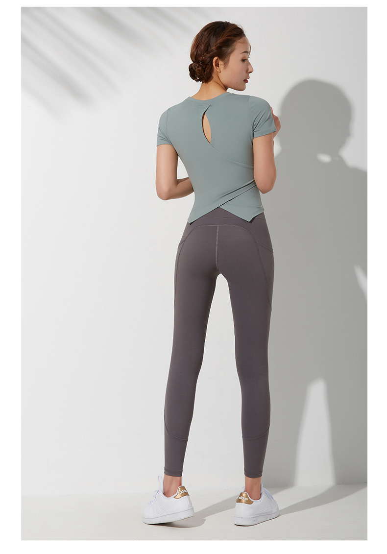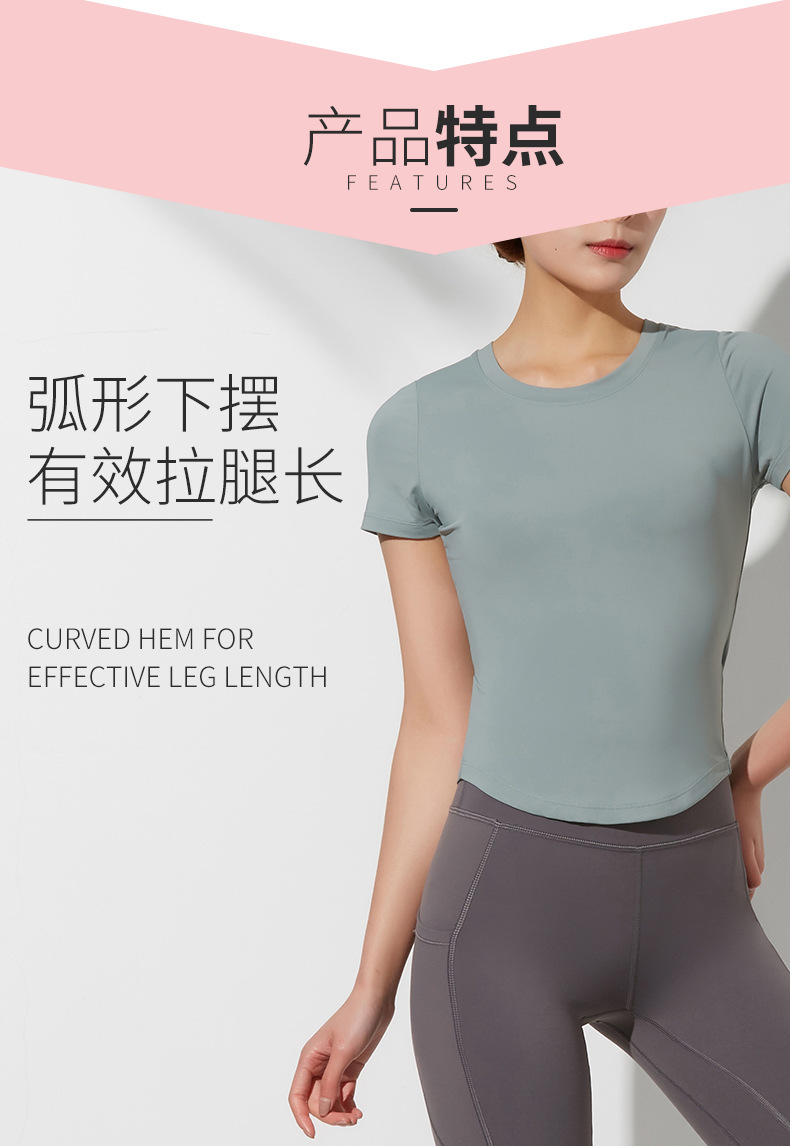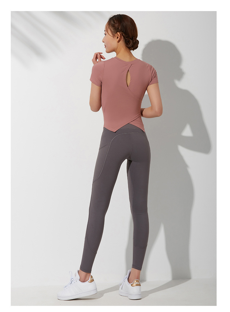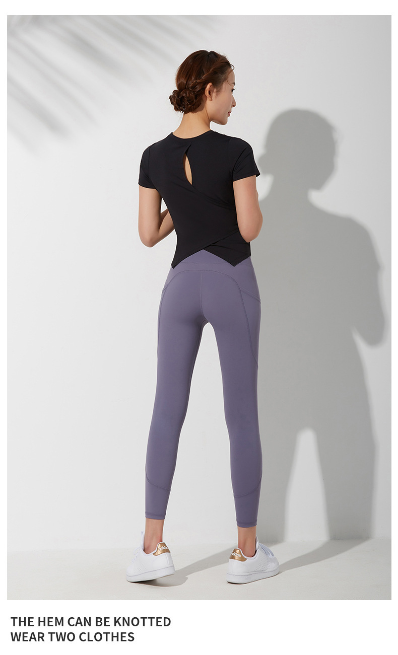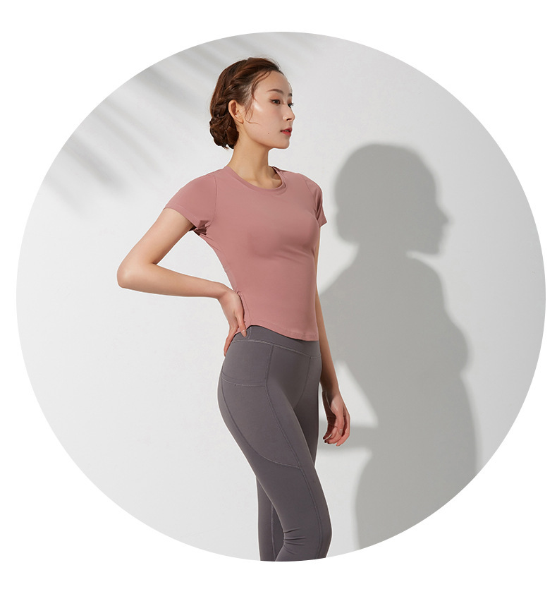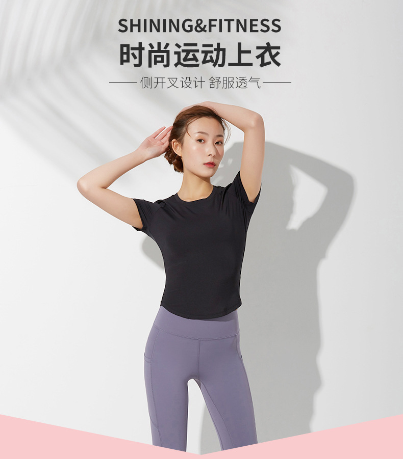 봄과 여름 2025 새로운 사이드 스플릿 요가 짧은 소매 여성의 원활한 피부 친화적 인 스포츠 최고의 여성 크로스 스티칭 피트니스 세트