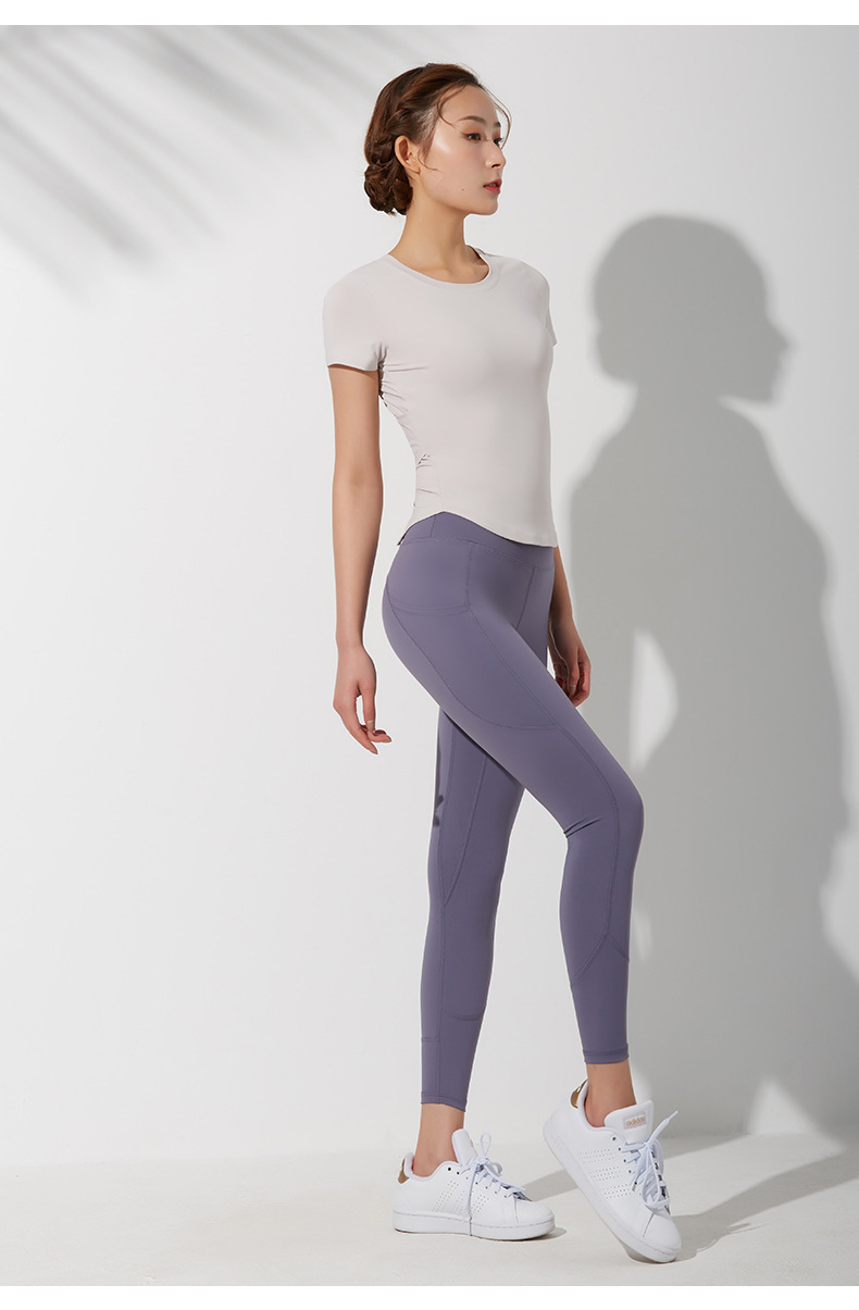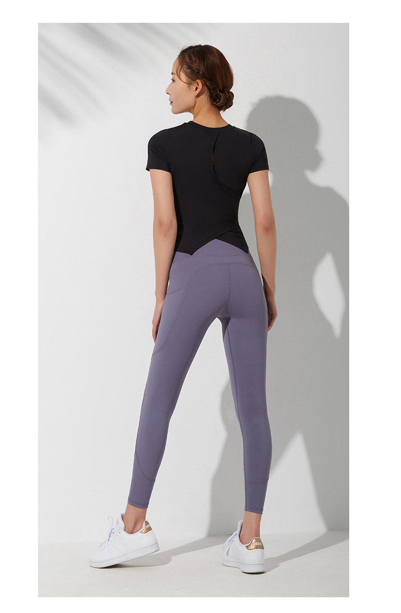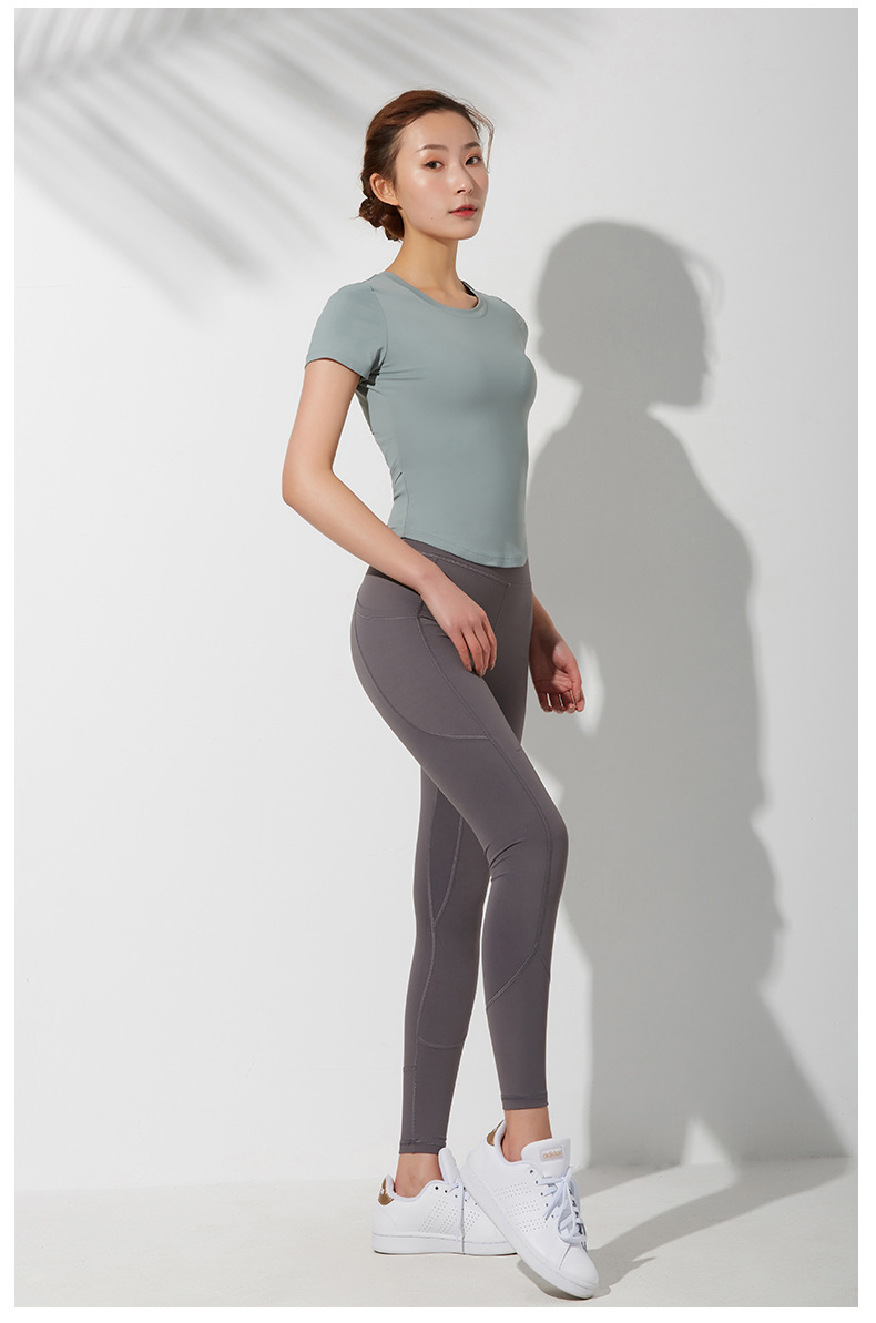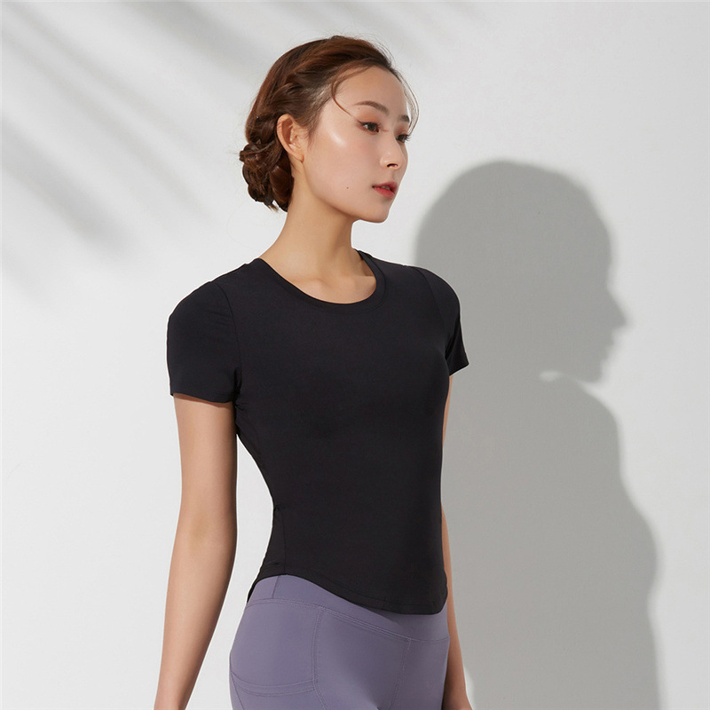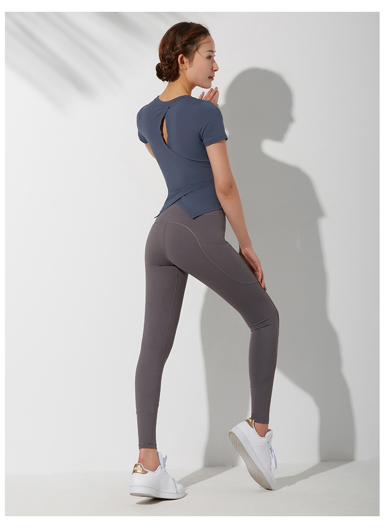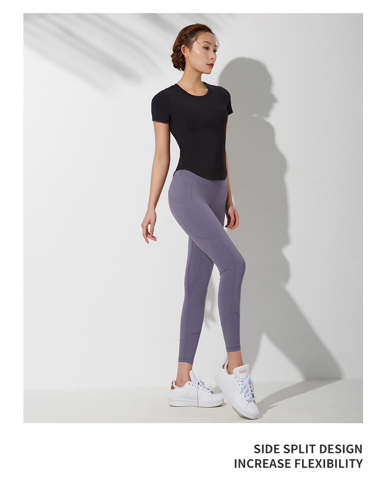 봄과 여름 2025 새로운 사이드 스플릿 요가 짧은 소매 여성의 원활한 피부 친화적 인 스포츠 최고의 여성 크로스 스티칭 피트니스 세트