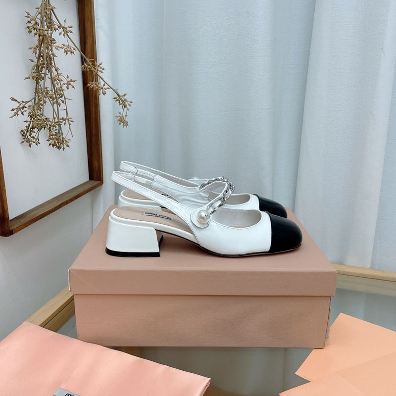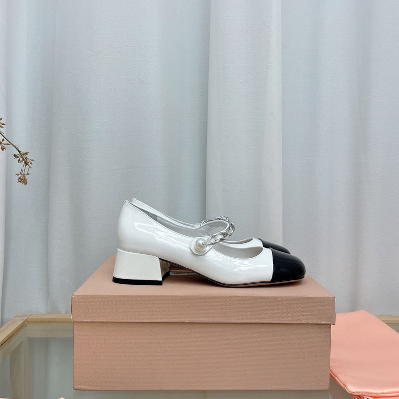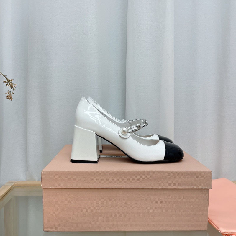 광저우 고품질 miu 컬러 매칭 스퀘어 토 체인 진주 발가락 두꺼운 굽 정품 가죽 바닥 메리 제인 신발 여성용스토어 가기