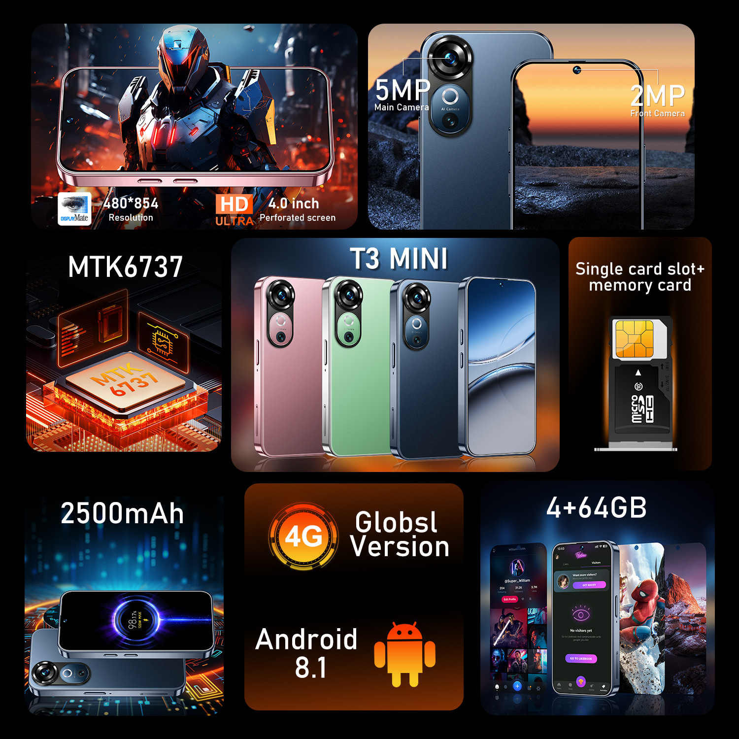 새로운 미니 T3 미니 국경 휴대 전화 4G 안드로이드 8.1 대외 무역 어린이 학생 작은 스마트 폰