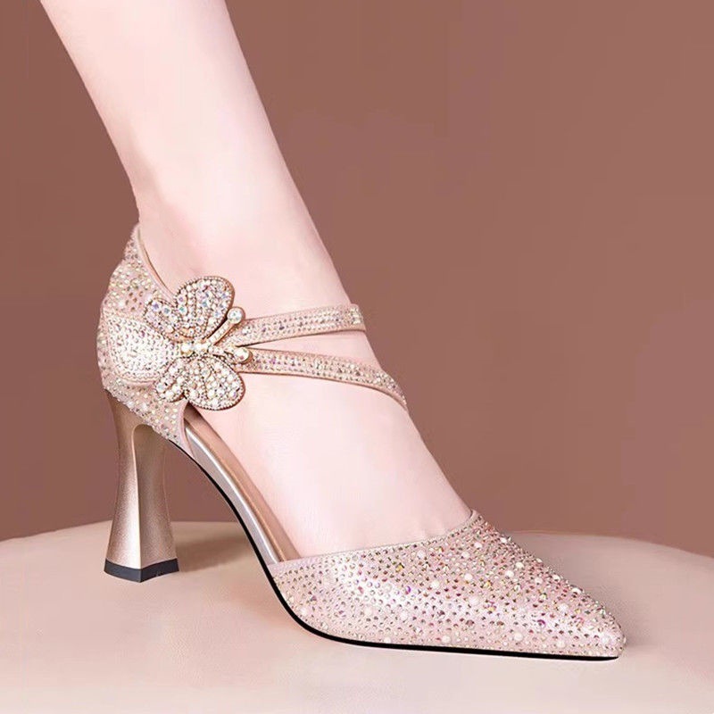 Baotou 섹시한 두꺼운 굽 샌들 여성 여름 하이힐 2025 새로운 패션 나비 라인 석과 치파오 백 힐 싱글 신발