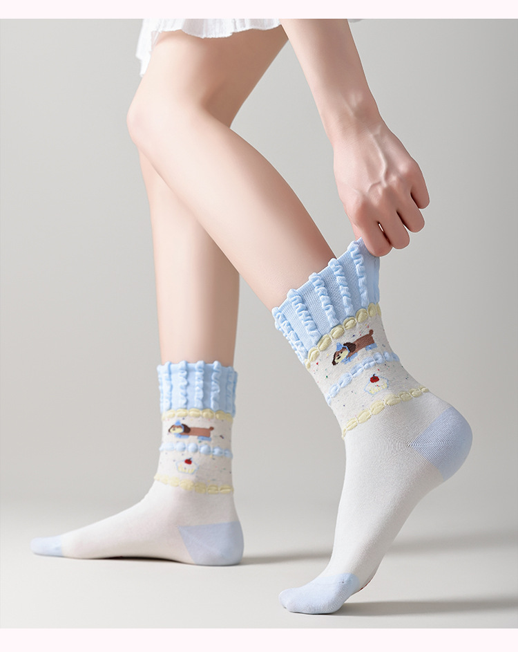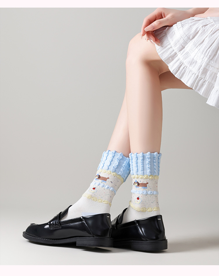 【30% off 클리어런스】여름용 얇은 양말, 여성용 러그양말, 만화 강아지 양말, 무봉제 보풀방지 면 양말, 중간 길이 양말