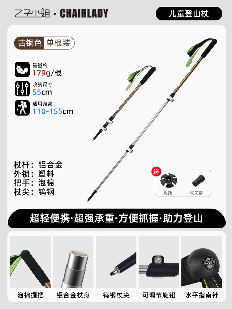 • 【나침반 포함】 아동용 신축 지팡이 - 브론즈 색상 - 신장 155cm 이하