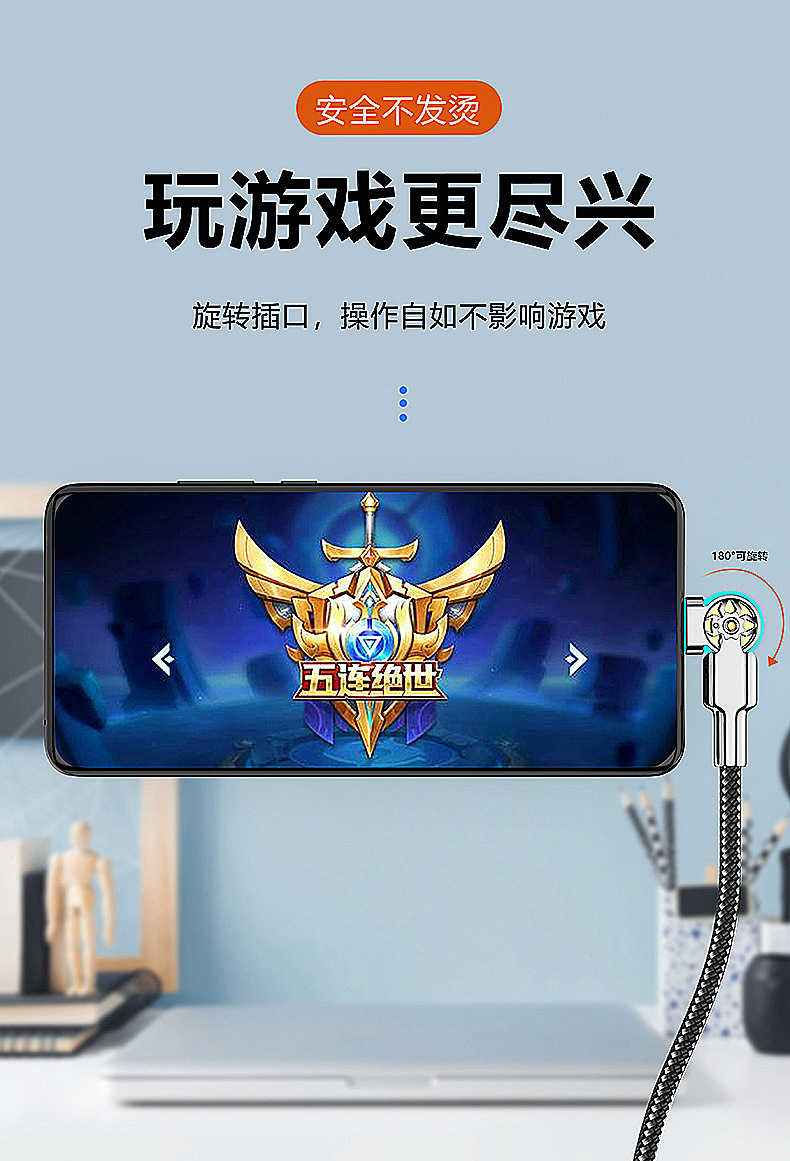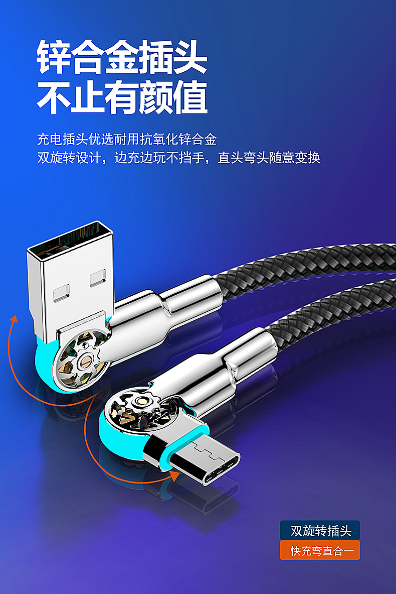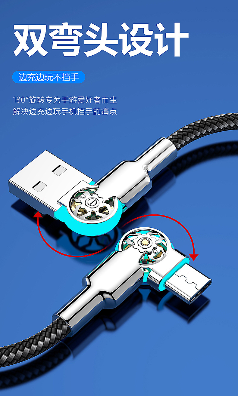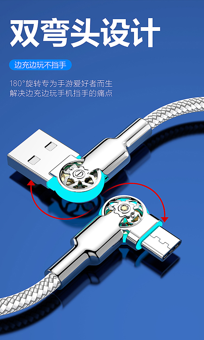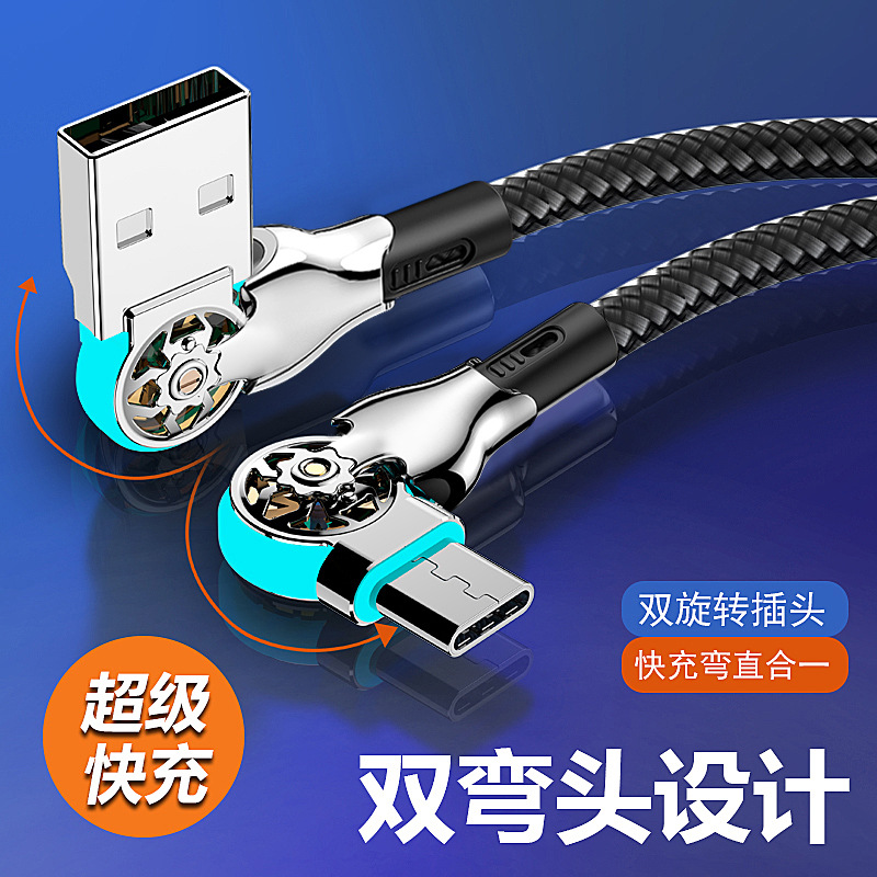 애플 안드로이드 충전 라인을위한 가벼운 확장 형-c 빠른 충전 데이터 라인 휴대 전화 자동차로 회전하는 이중 팔꿈치