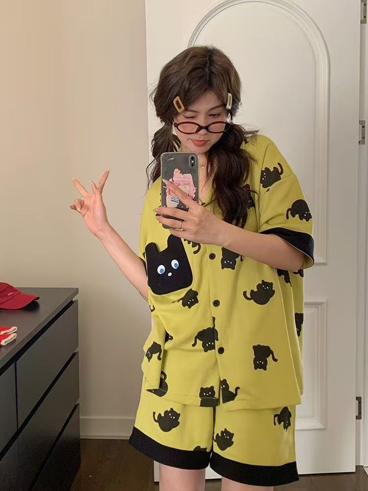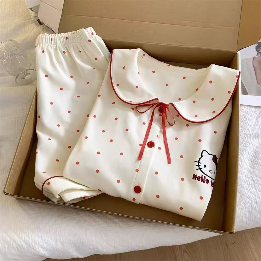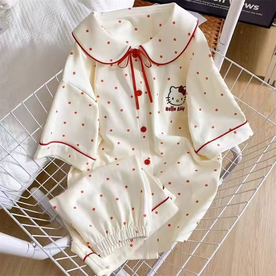 2025 핫 스타일 귀여운 순수하고 달콤한 빨간색 물방울 무늬 KT 고양이 잠옷 여성 여름 착용 가능한 홈웨어 세트스토어 가기