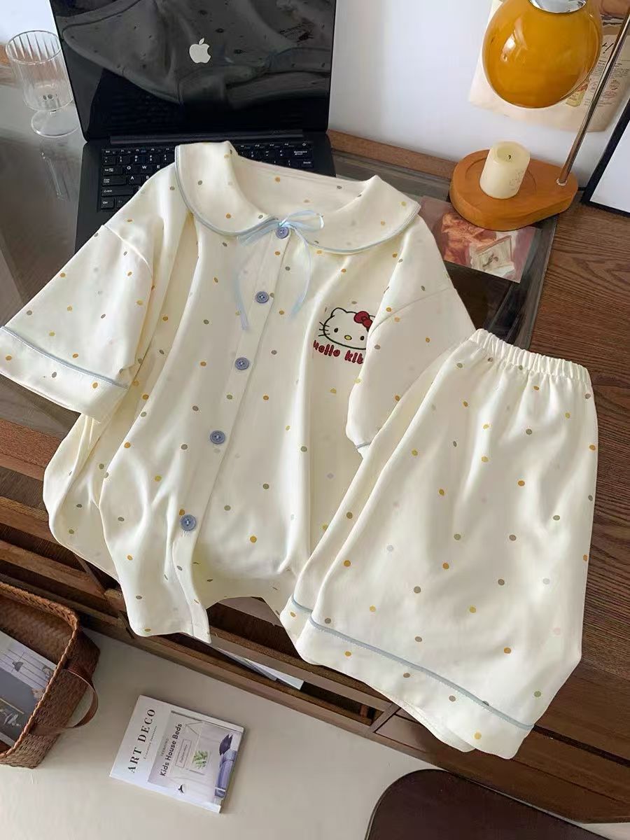 2025 핫 스타일 귀여운 순수하고 달콤한 빨간색 물방울 무늬 KT 고양이 잠옷 여성 여름 착용 가능한 홈웨어 세트
