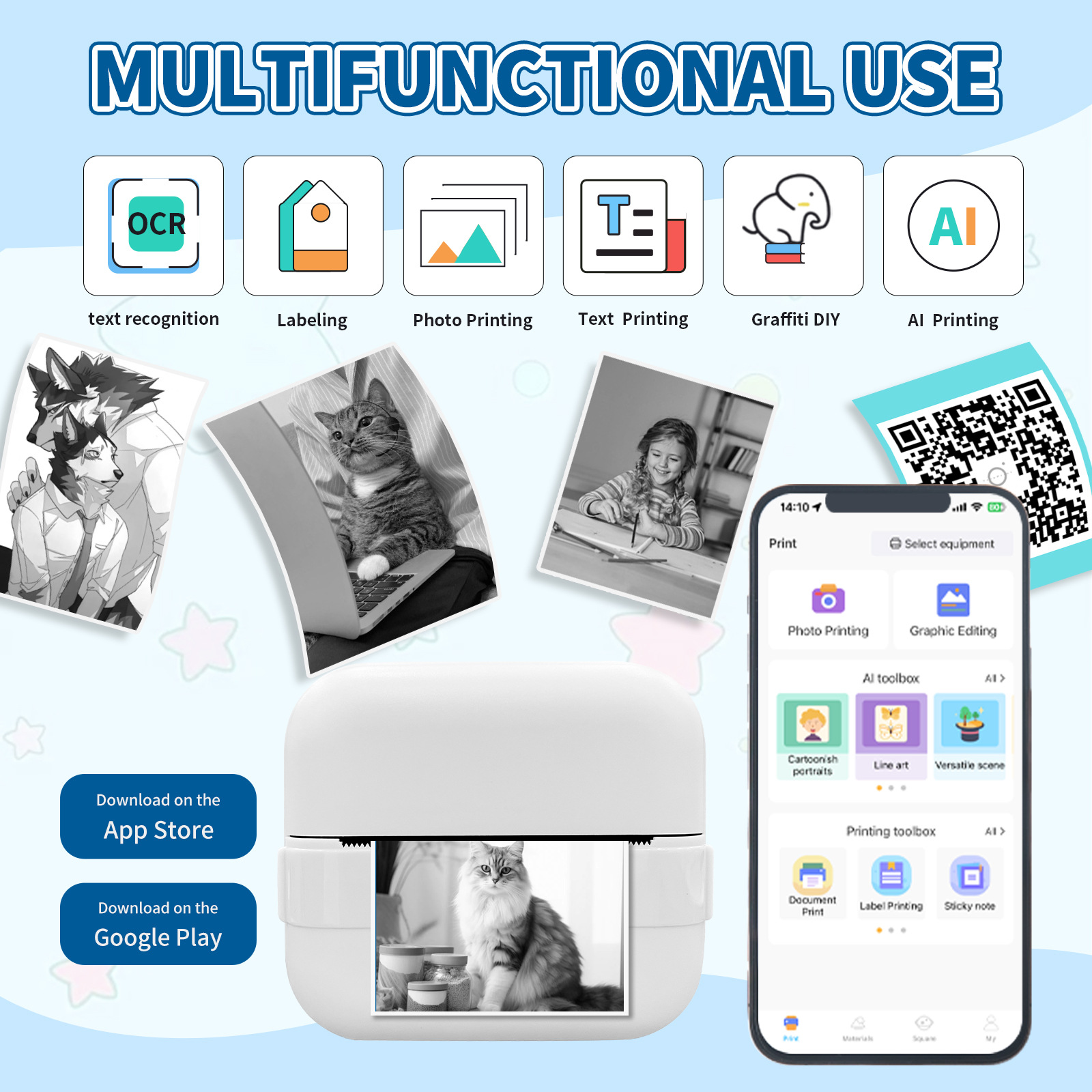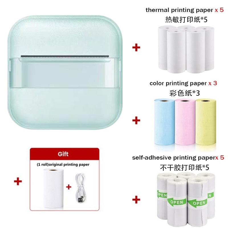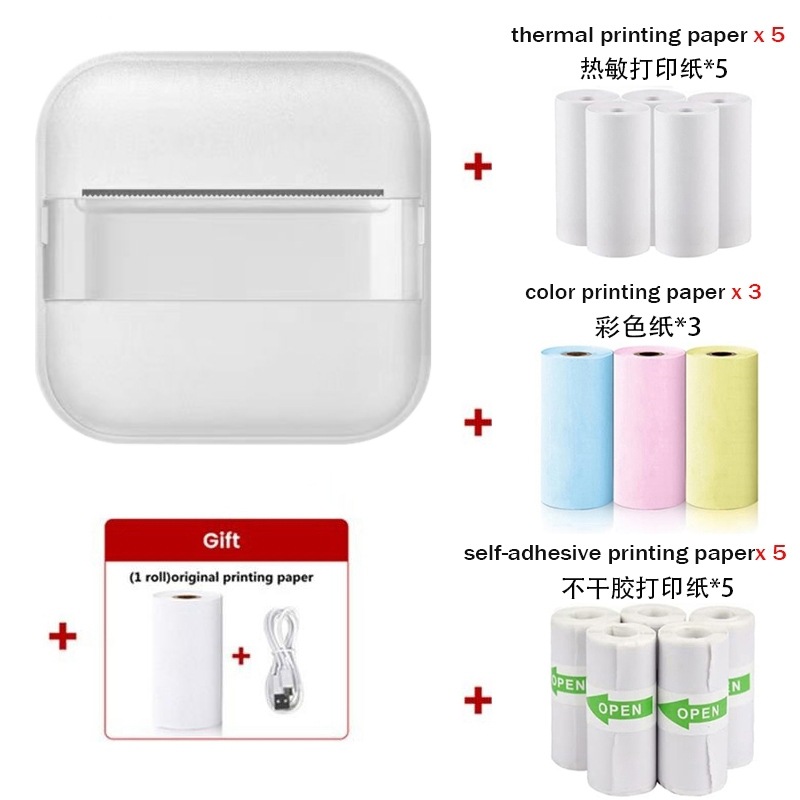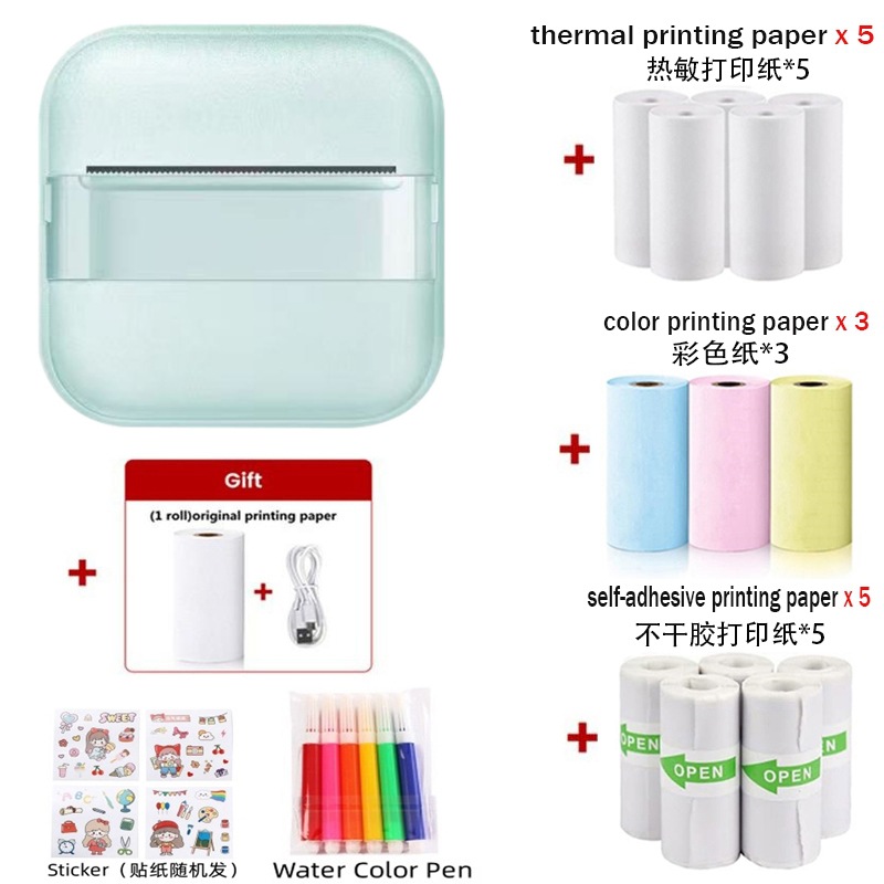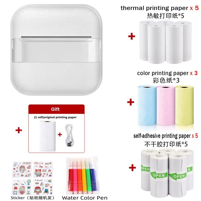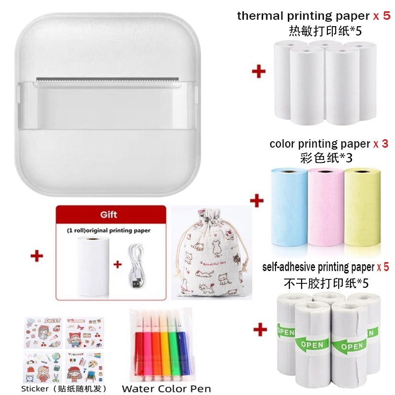 打印机1台+【自带1卷热敏纸+5卷热敏纸+5卷不干胶+3卷彩色纸+6支水彩笔+贴纸】为一整套。