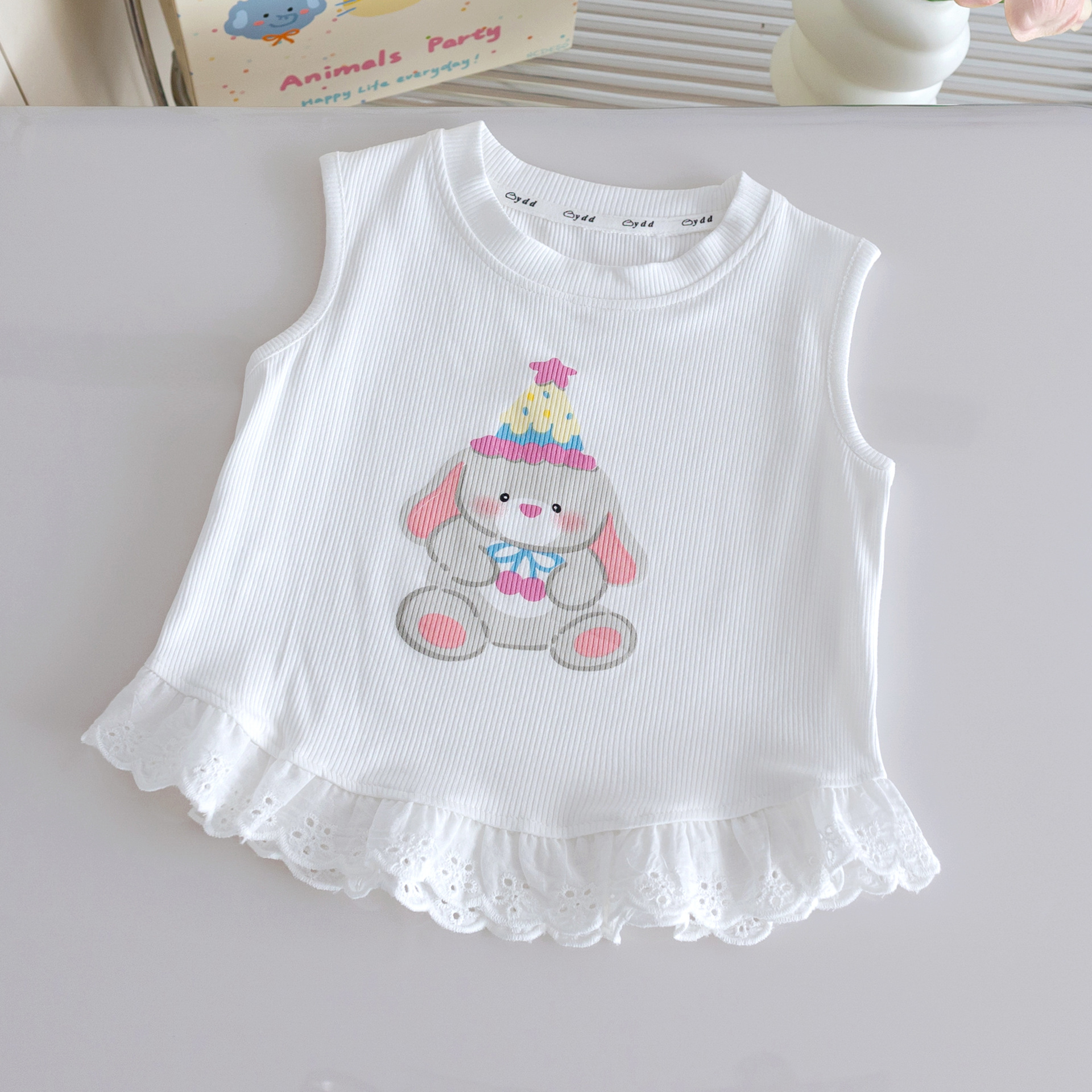 여자 만화 조끼 25 여름 새로운 여성의 보물 한국식 귀여운 곰 인쇄 스티칭 레이스 올 매치 탑스토어 가기