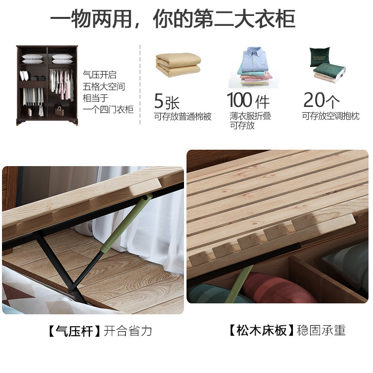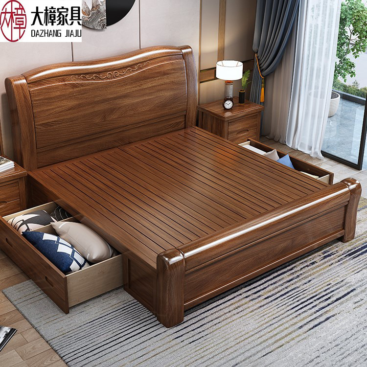 호두나무 새로운 중국 스타일 1.8m 마스터 침실 침대 현대적인 단순 1.5M 더블 원목 침대 싱글 하이 박스 수납 침대