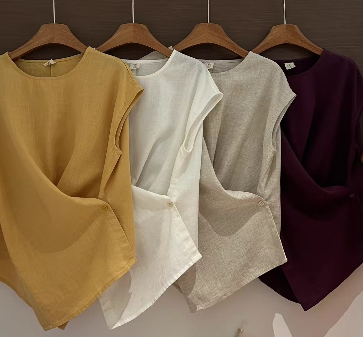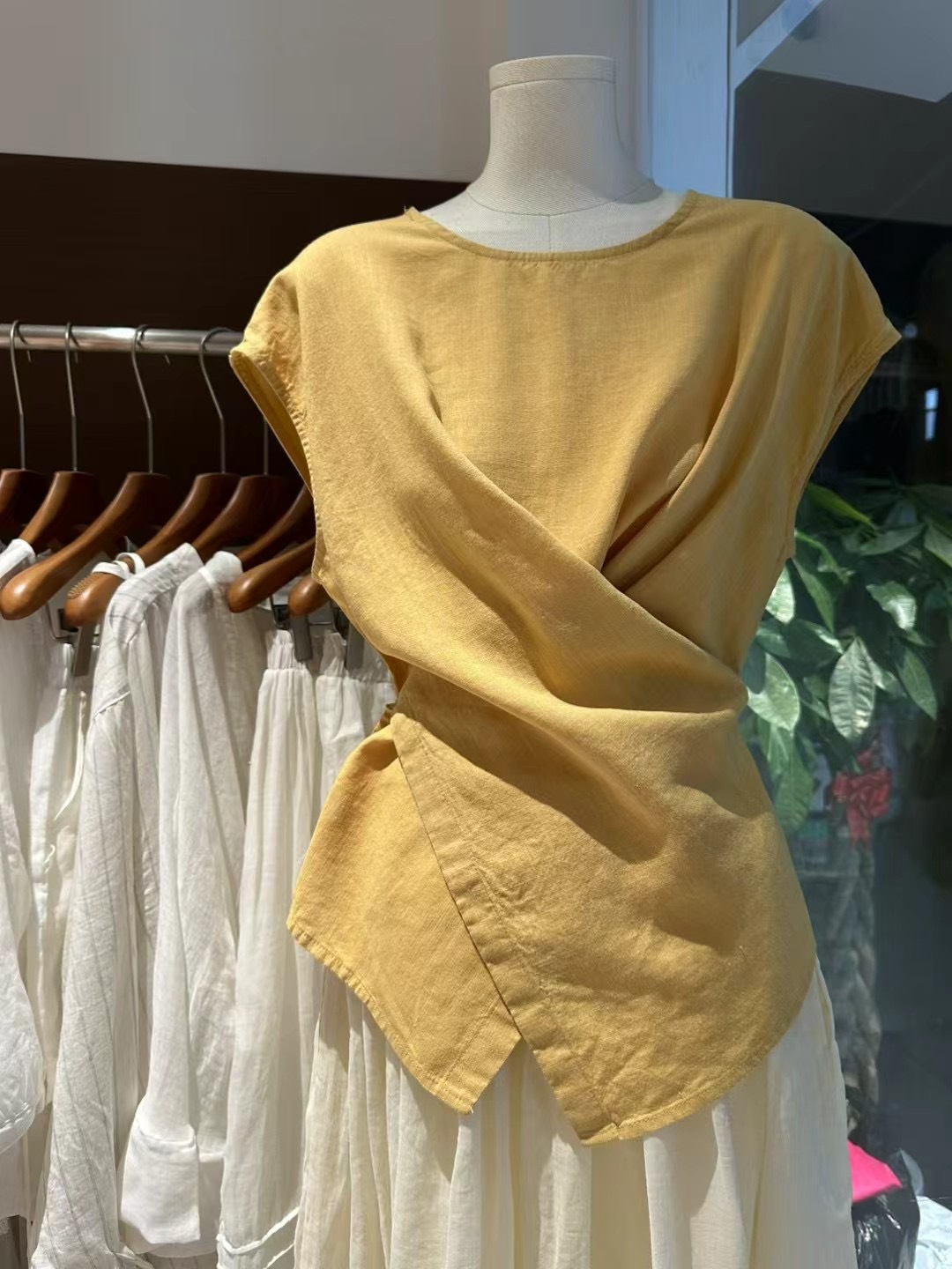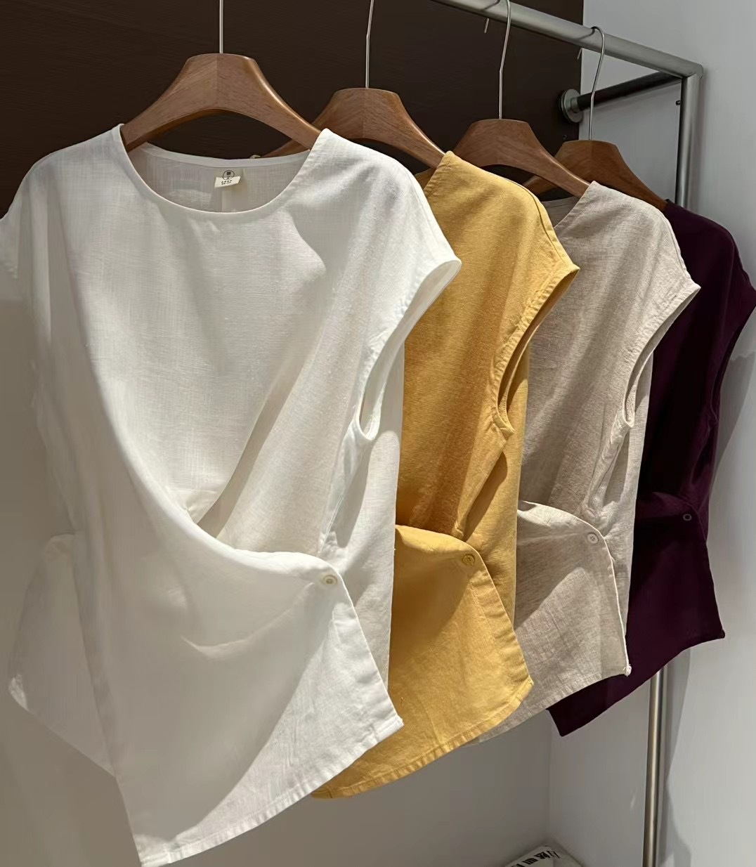 불규칙한 크로스 버클 작은 플라이 슬리브 리넨 셔츠 여성의 2025 여름 새로운 스타일 세련된 캐주얼 루즈 탑스토어 가기