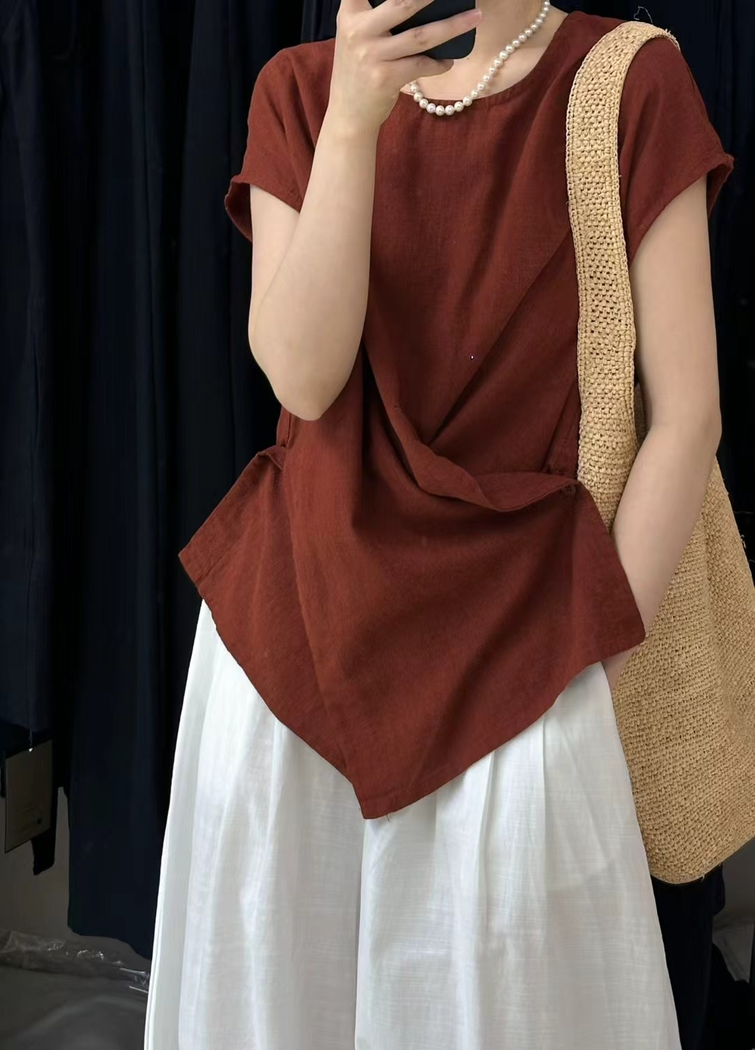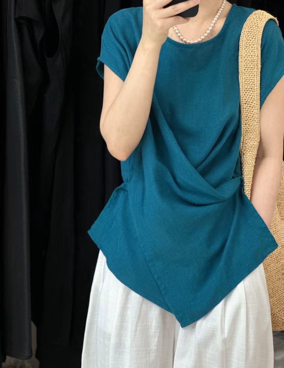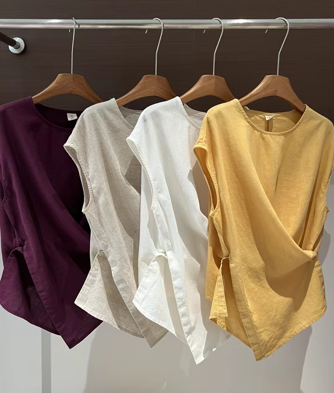 불규칙한 크로스 버클 작은 플라이 슬리브 리넨 셔츠 여성의 2025 여름 새로운 스타일 세련된 캐주얼 루즈 탑스토어 가기