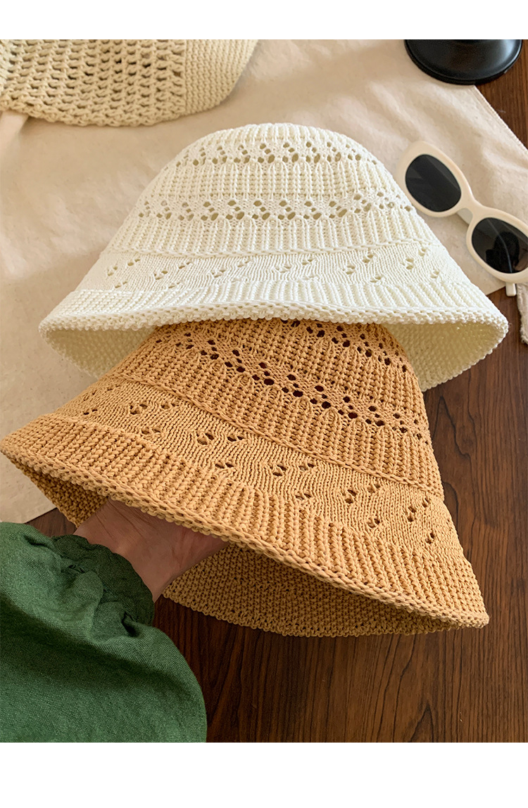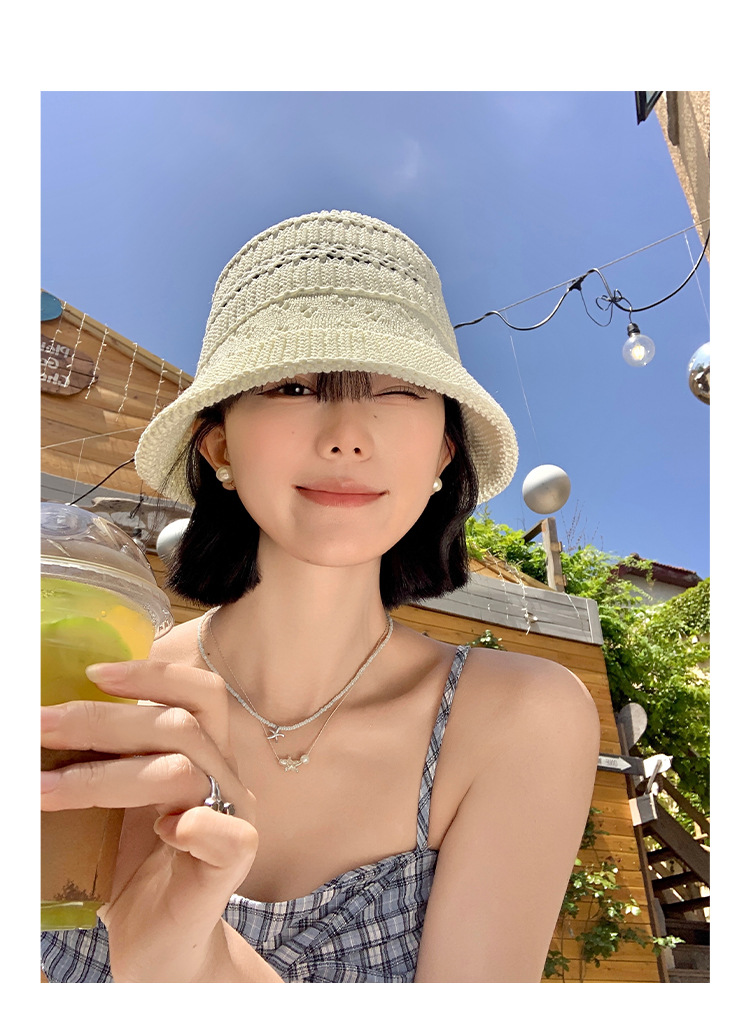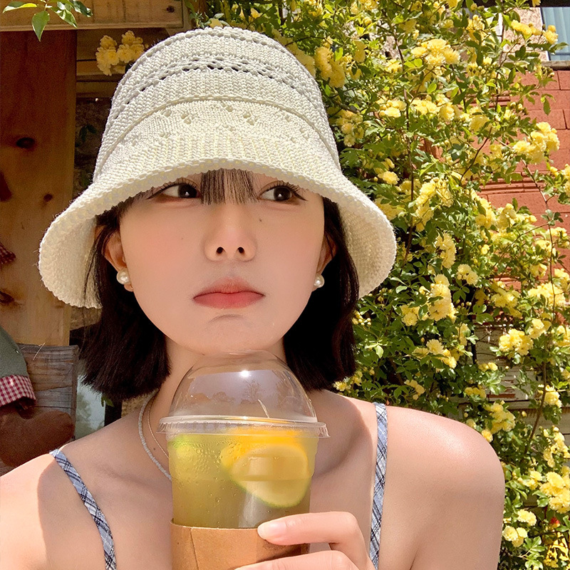 여성을위한 일본 중공 베이지 어부 모자 여름 야외 태양 보호 모자 손으로 짠 분지 모자 통기성 태양 양동이 모자