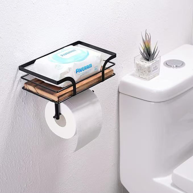 화장실 벽에 있는 원목 다기능 수납선반, 변기 옆에 있는 종이타월 화분 수납선반, 목재 수건 수납선반스토어 가기