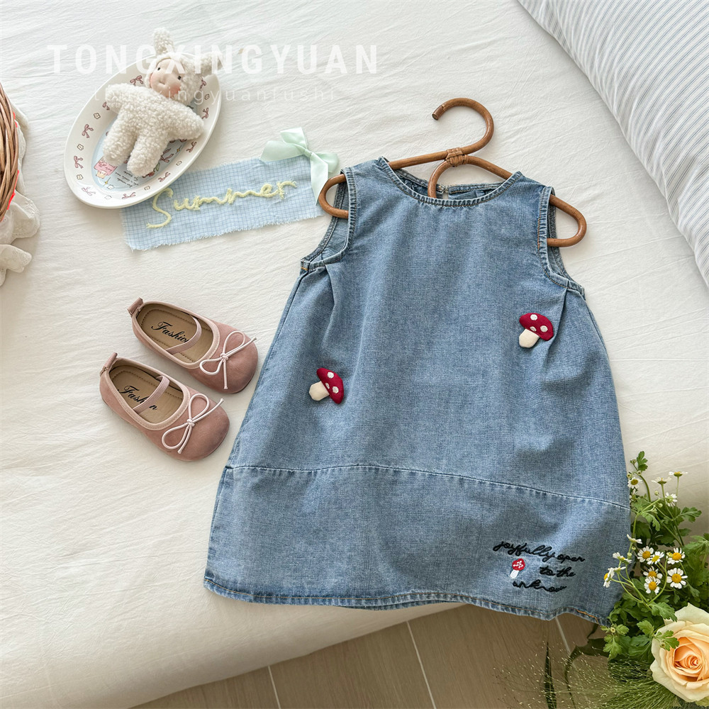 작은 버섯 한국 아동복 소녀 서양식 한국식 여름 원피스 데님 원피스 귀여운 조끼 스커트 원피스스토어 가기