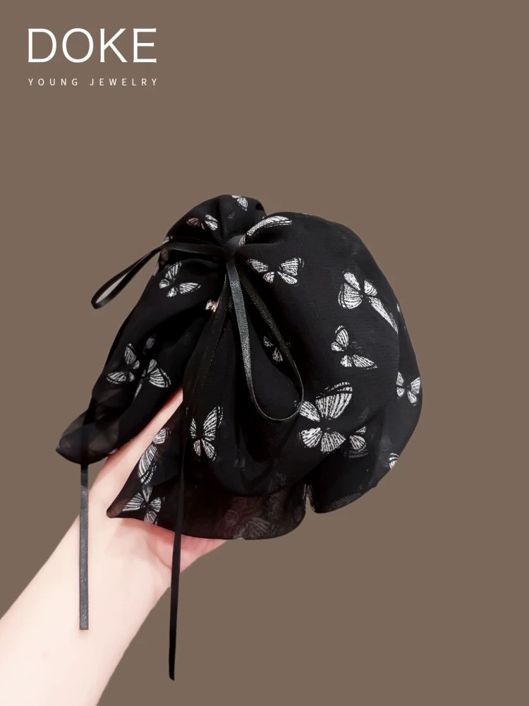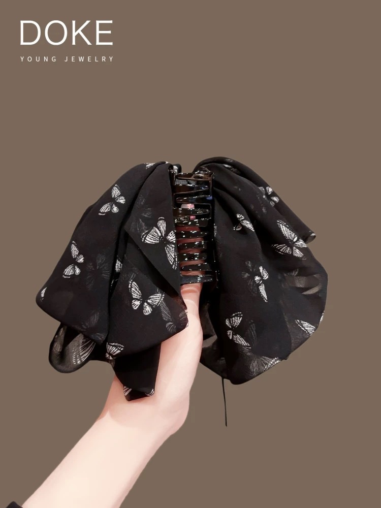 쉬폰 프린트 리본 포니테일 클립, 고급 헤어 클립, 샤크 클립, 우아한 헤어 액세서리스토어 가기