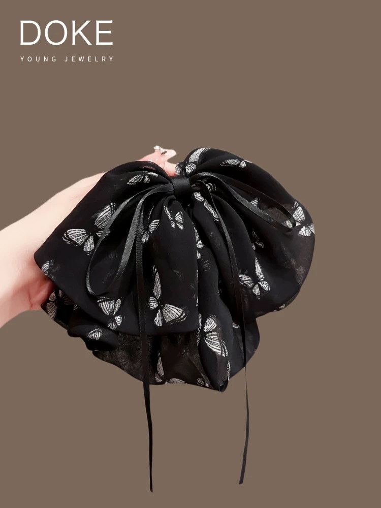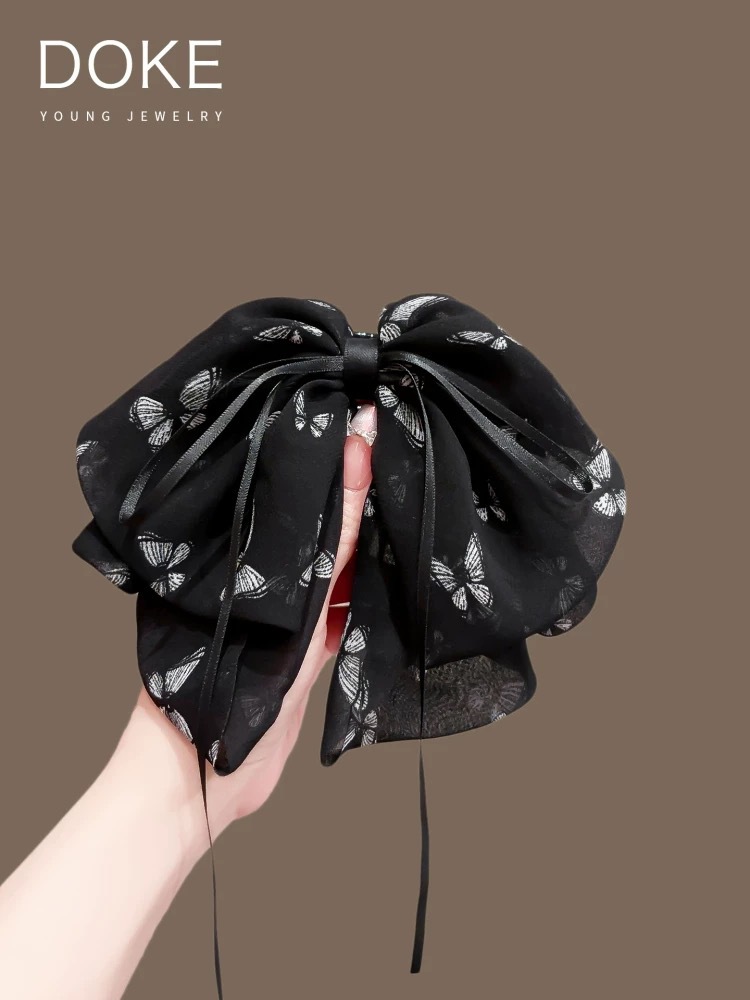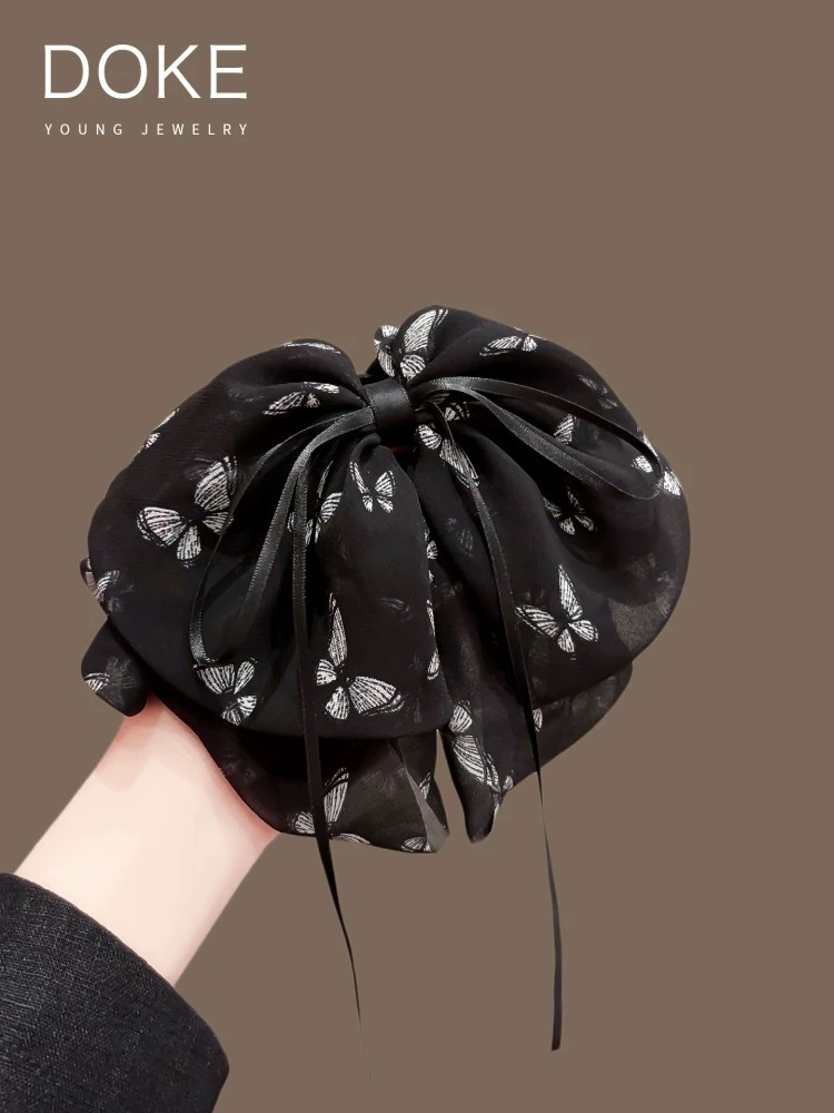 쉬폰 프린트 리본 포니테일 클립, 고급 헤어 클립, 샤크 클립, 우아한 헤어 액세서리