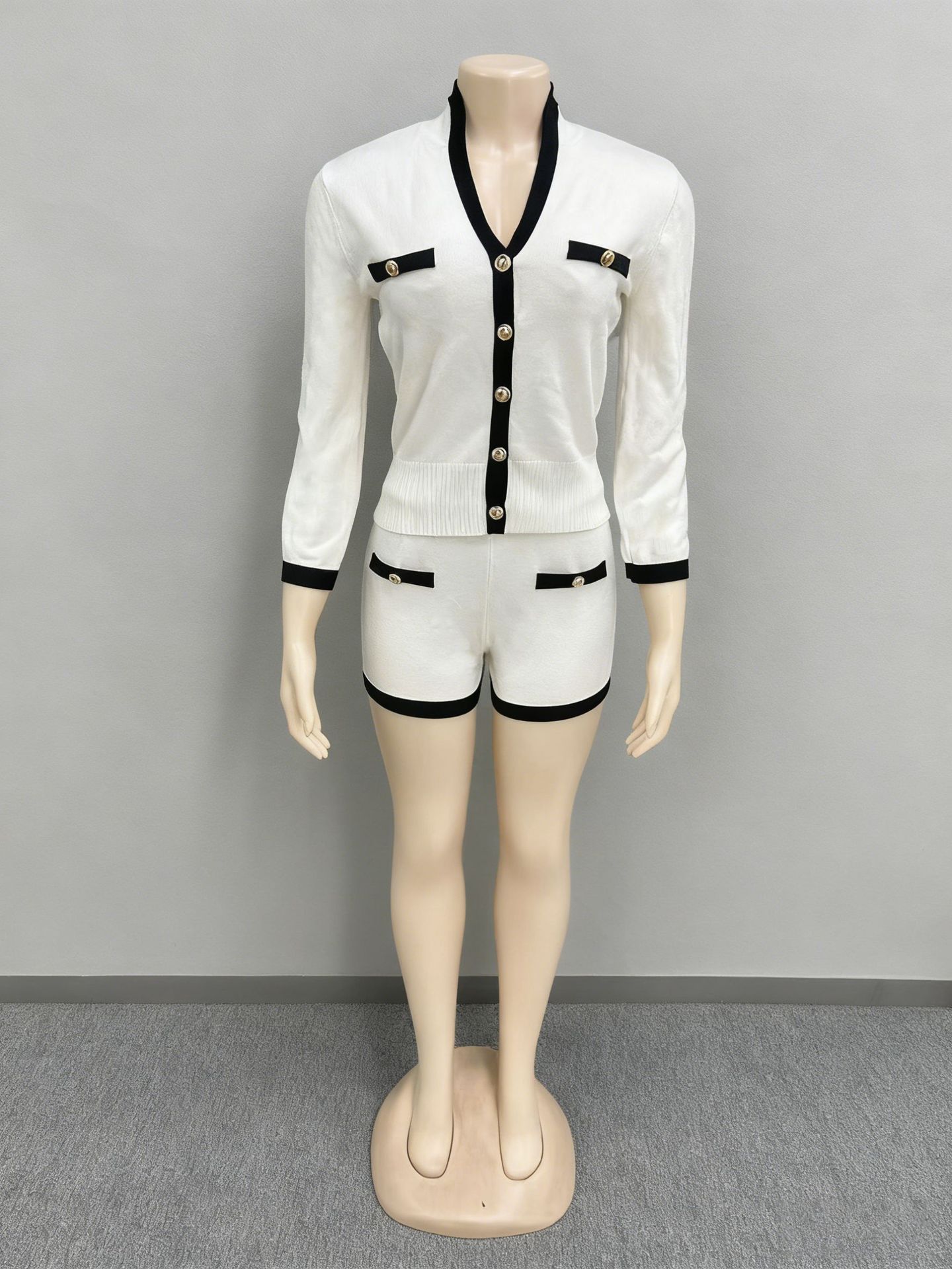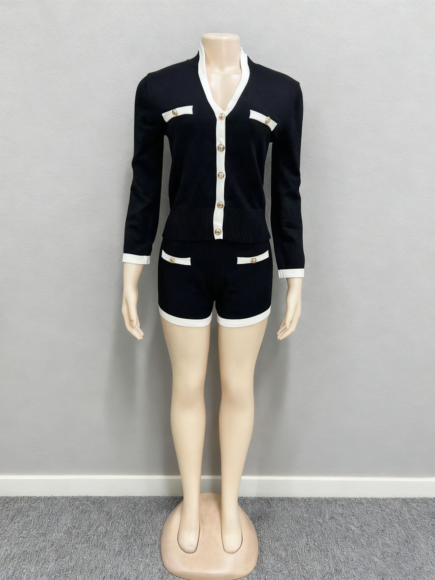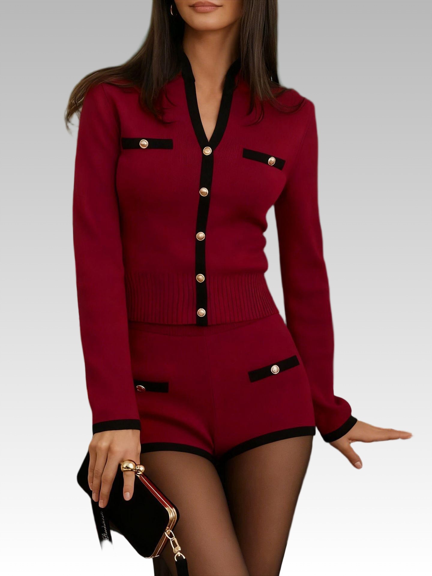 유럽과 미국의 여성 대비 컬러 싱글 브레스트 긴팔 스레드 V 넥 카디건 탑 반바지 2 피스 세트 통근 우아한 세트