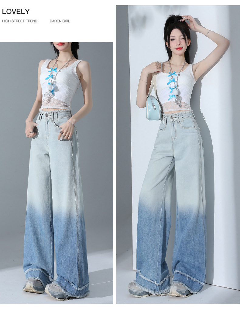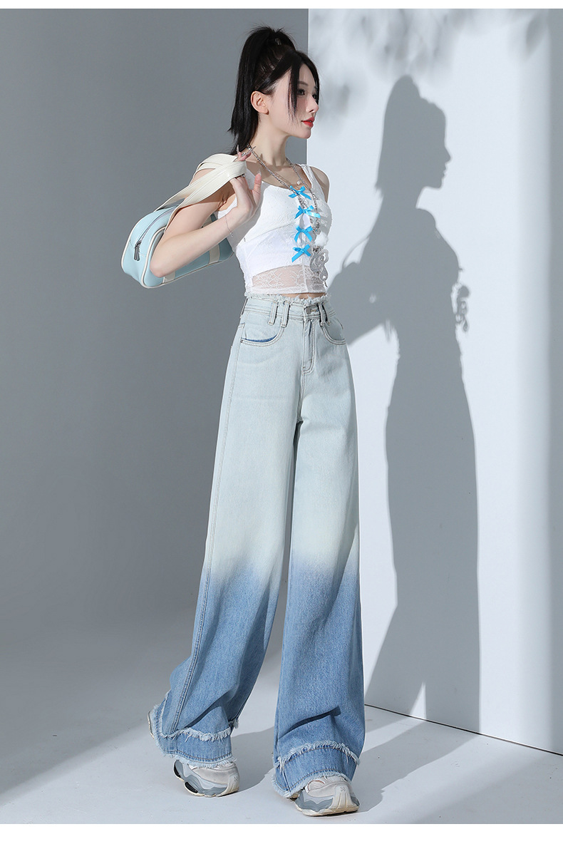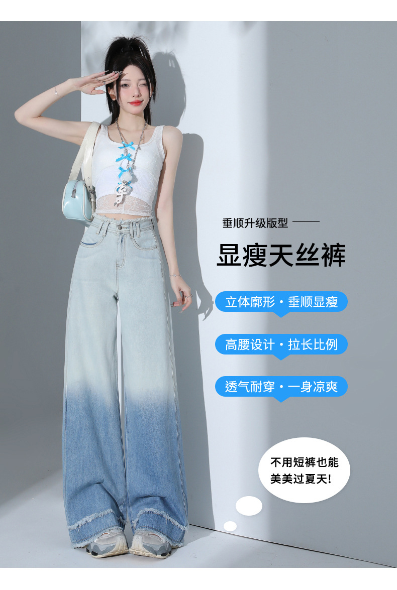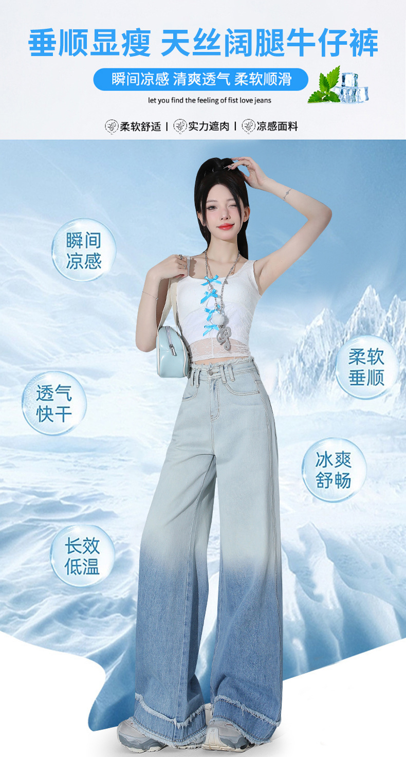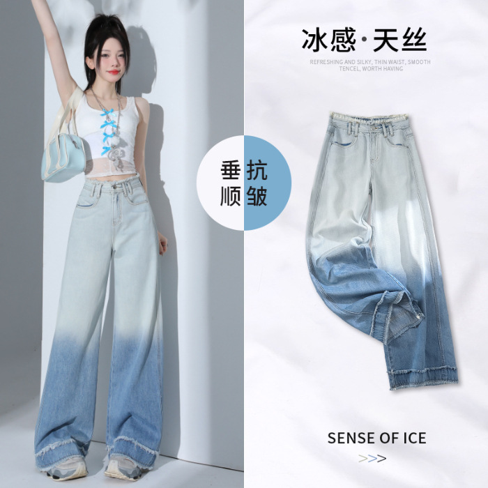 5599 텐셀 그라데이션 라이트 블루 와이드 레그 청바지 여성 여름 로우 엣지 디자인 하이 웨이스트 드레이프 루즈 팬츠
