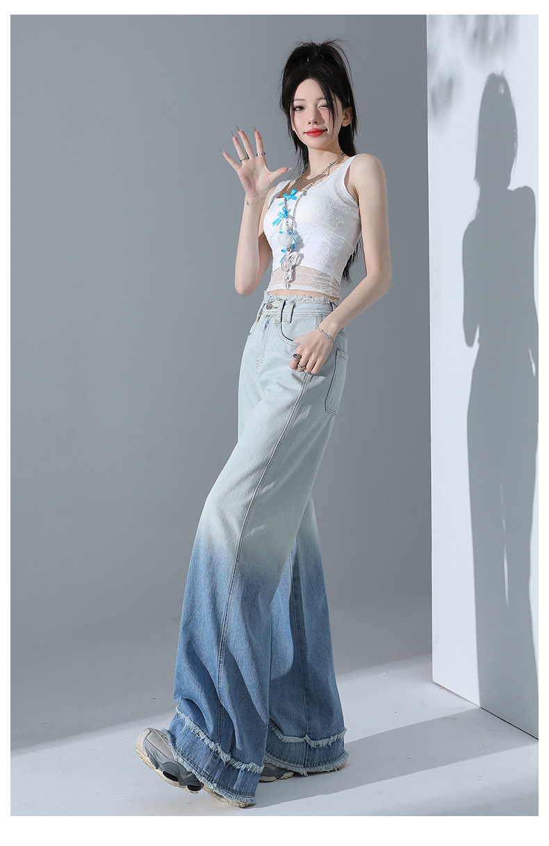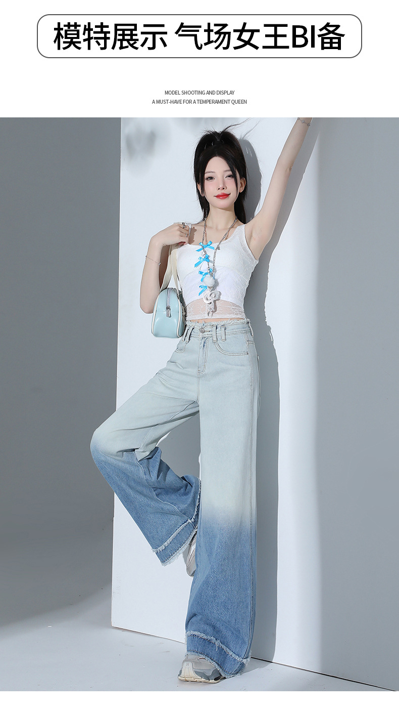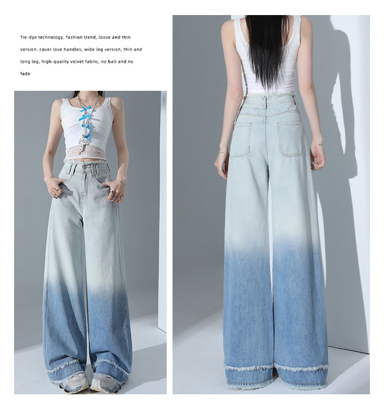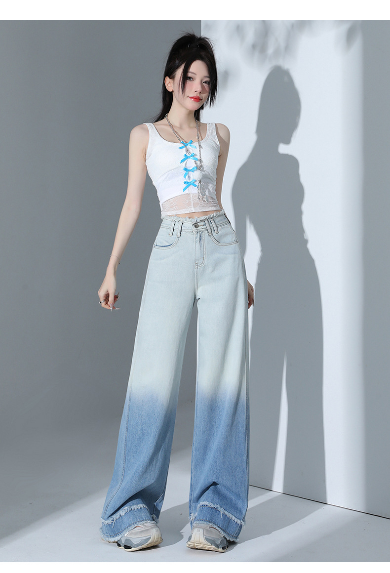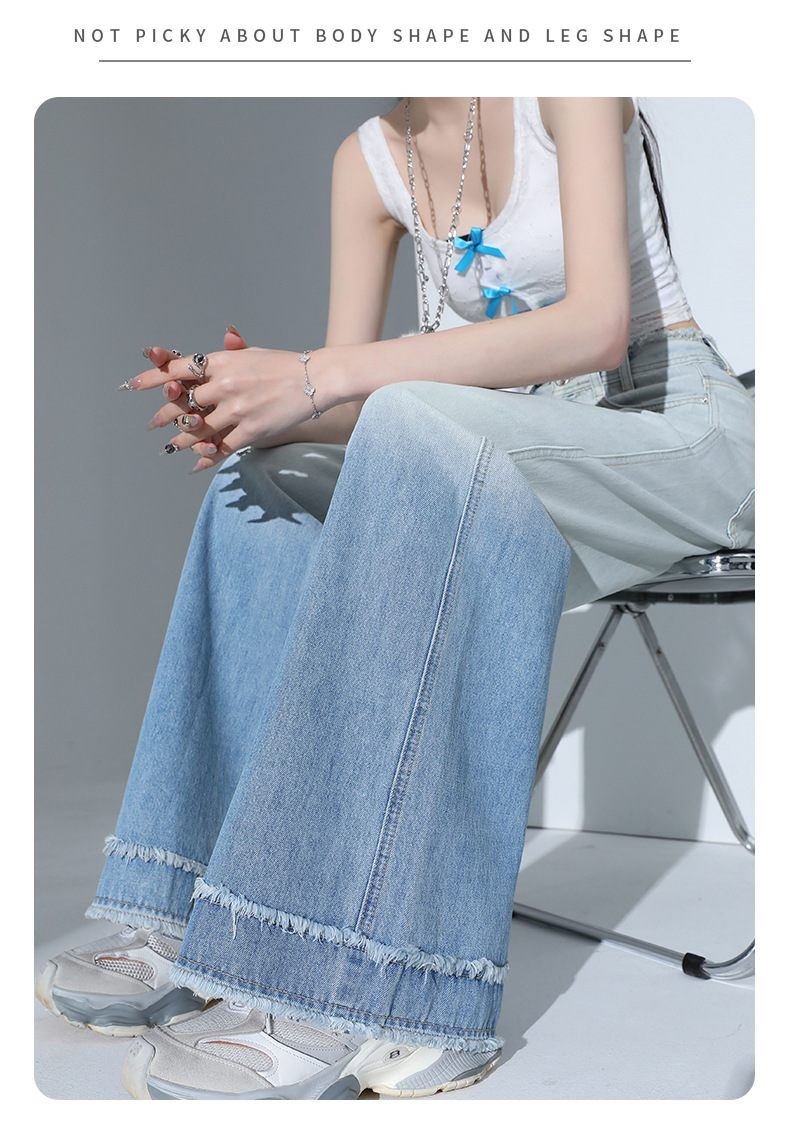 5599 텐셀 그라데이션 라이트 블루 와이드 레그 청바지 여성 여름 로우 엣지 디자인 하이 웨이스트 드레이프 루즈 팬츠