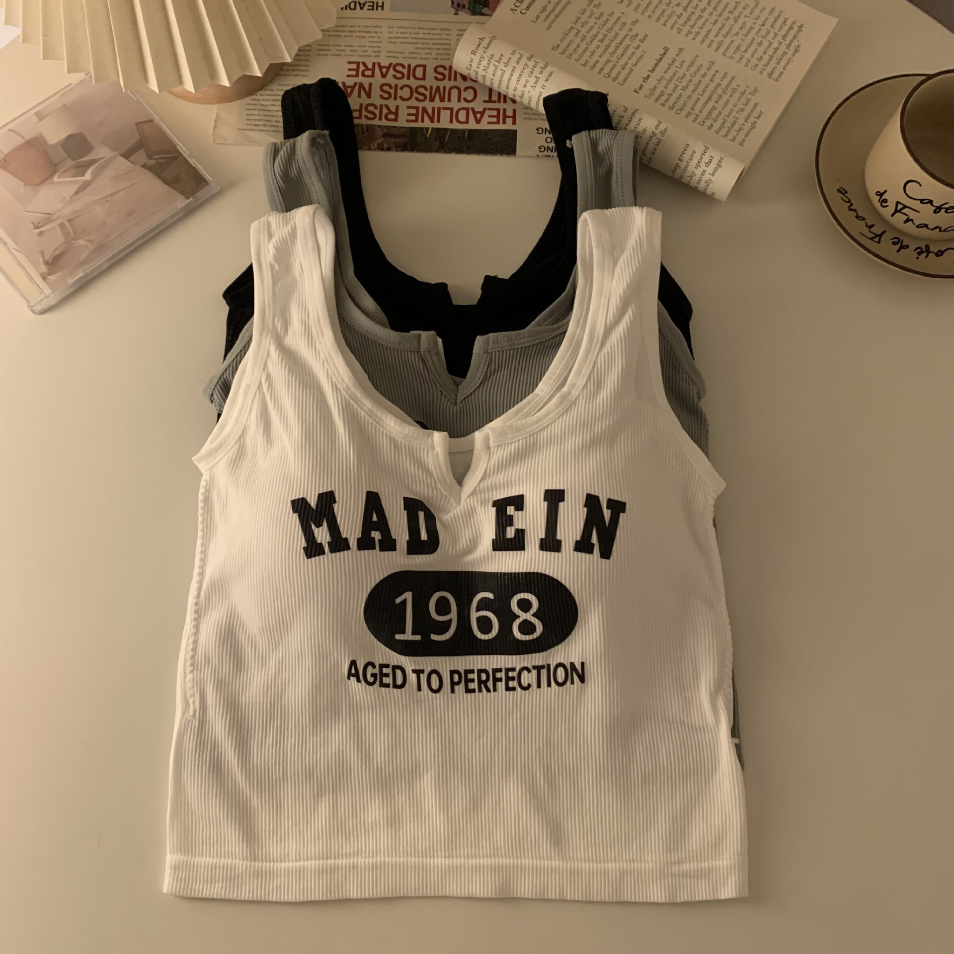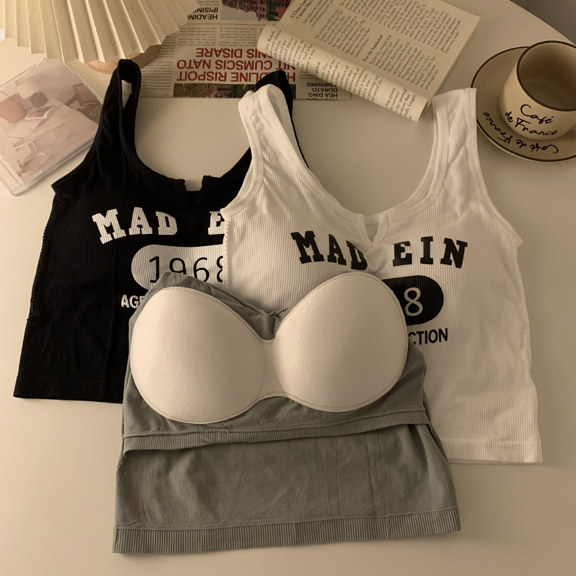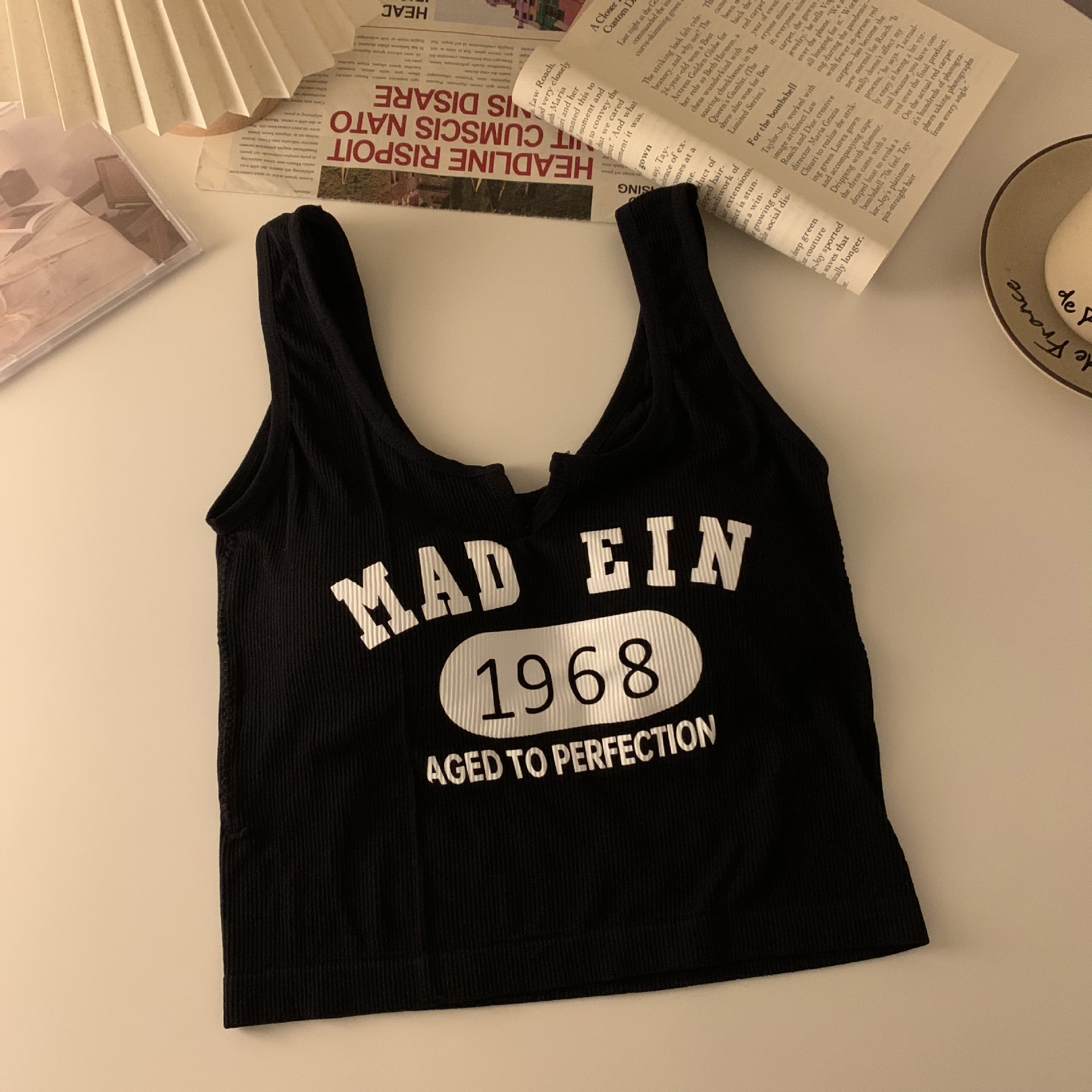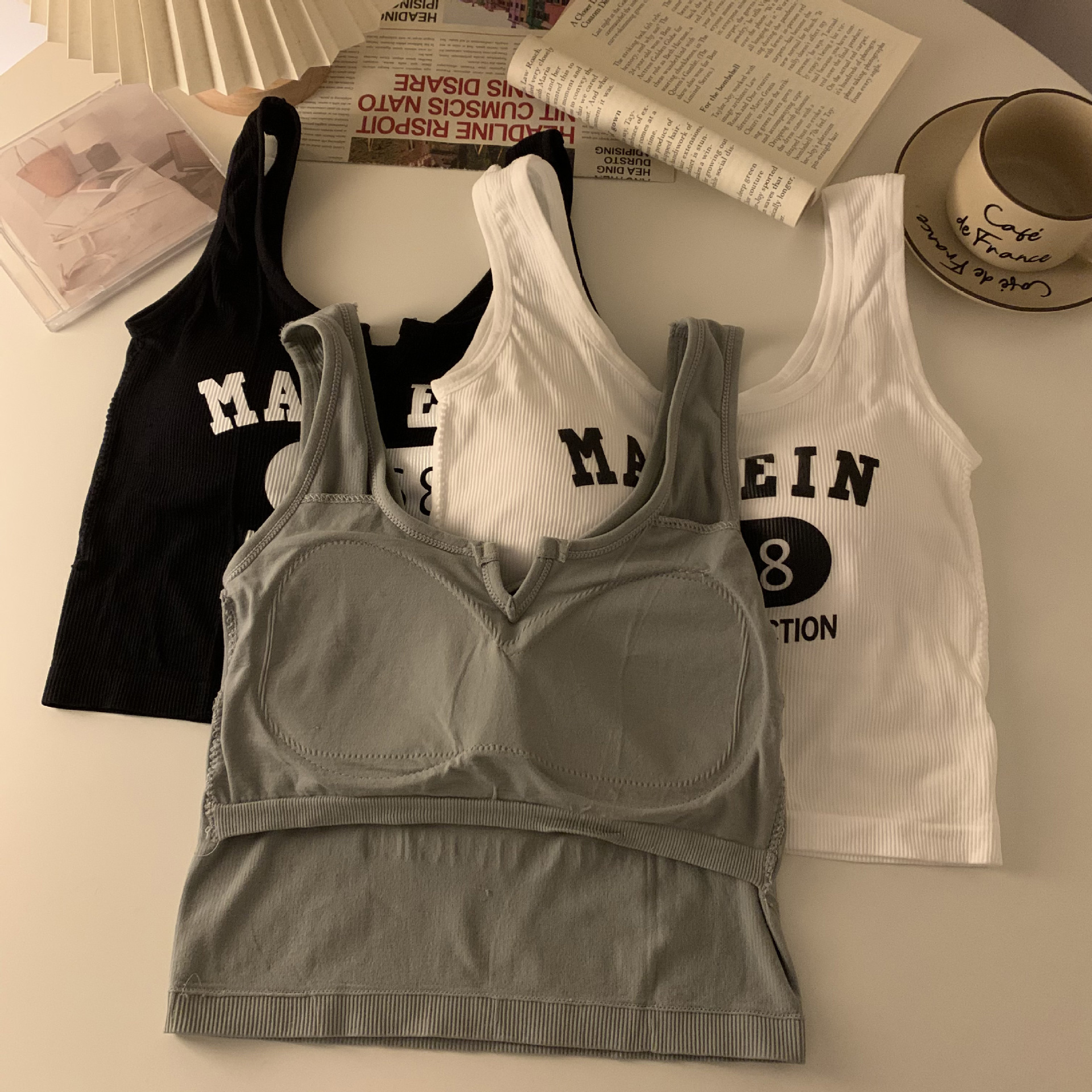 한국식 아름다운 등 일체형 고정컵 패셔너블하고 캐주얼하며 활용도가 높은 레터조끼, 앞가슴에 작은 V 디자인으로 가슴을 감싸주는 베이스레이어
