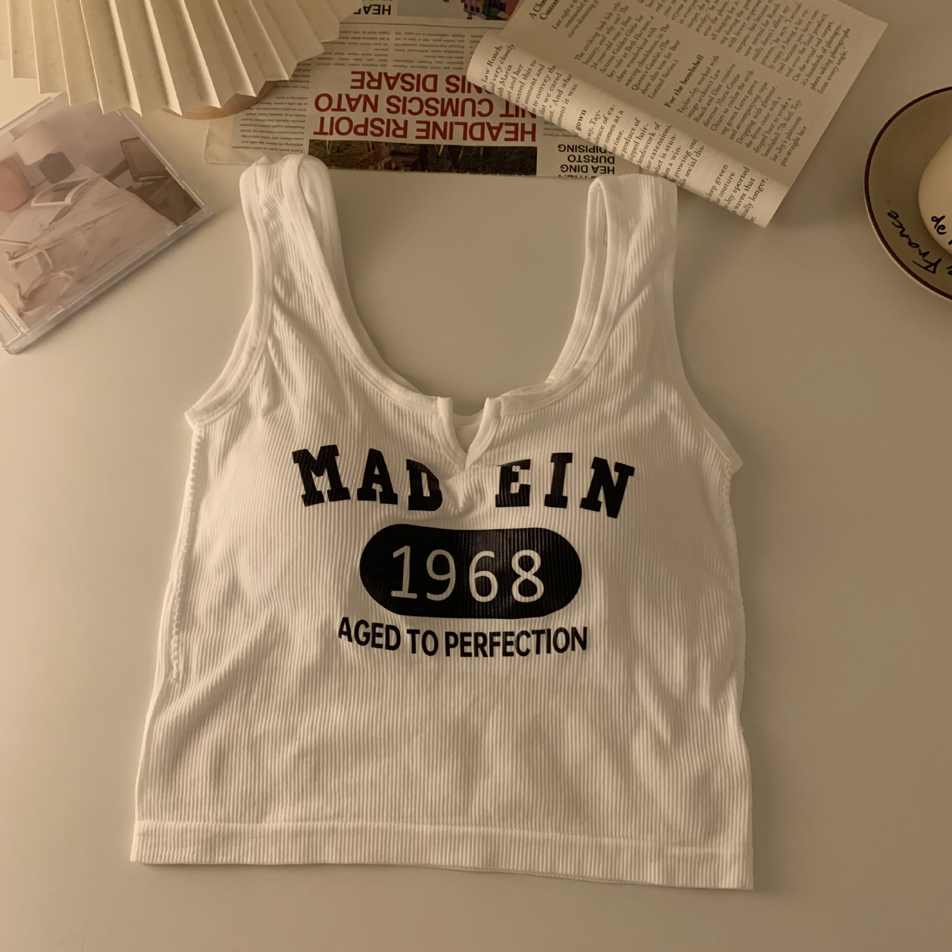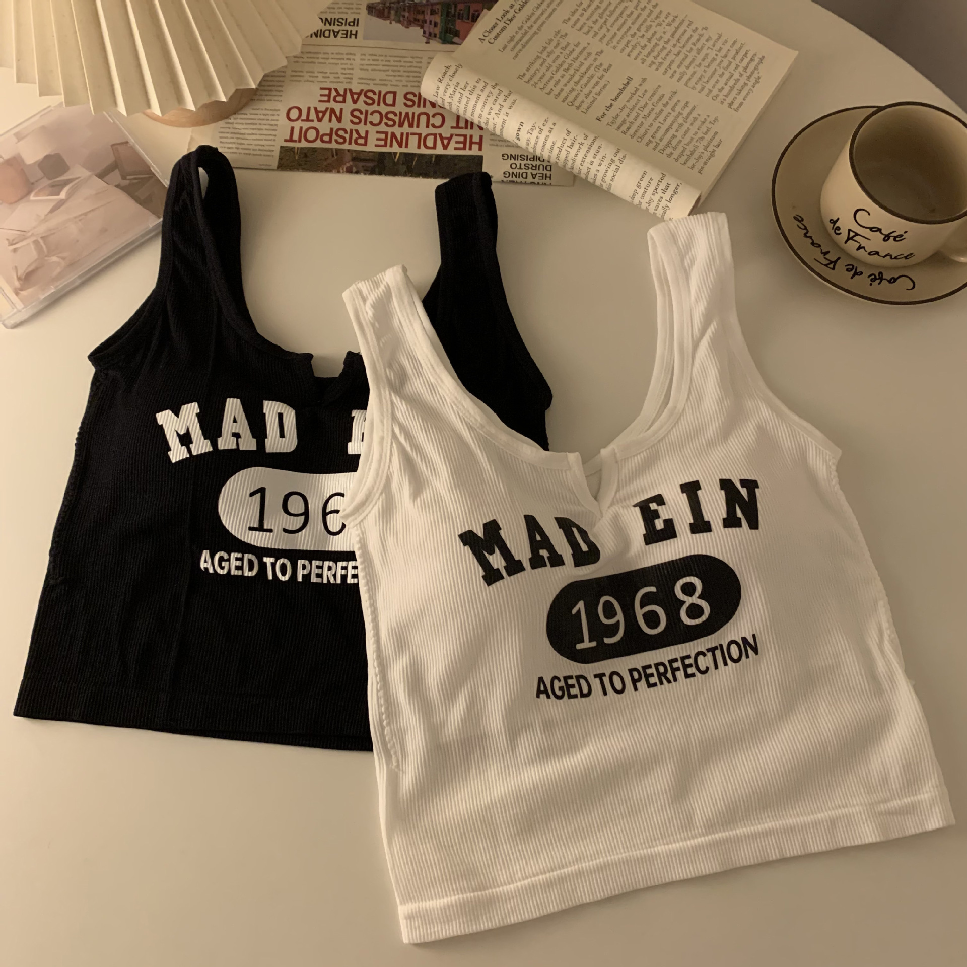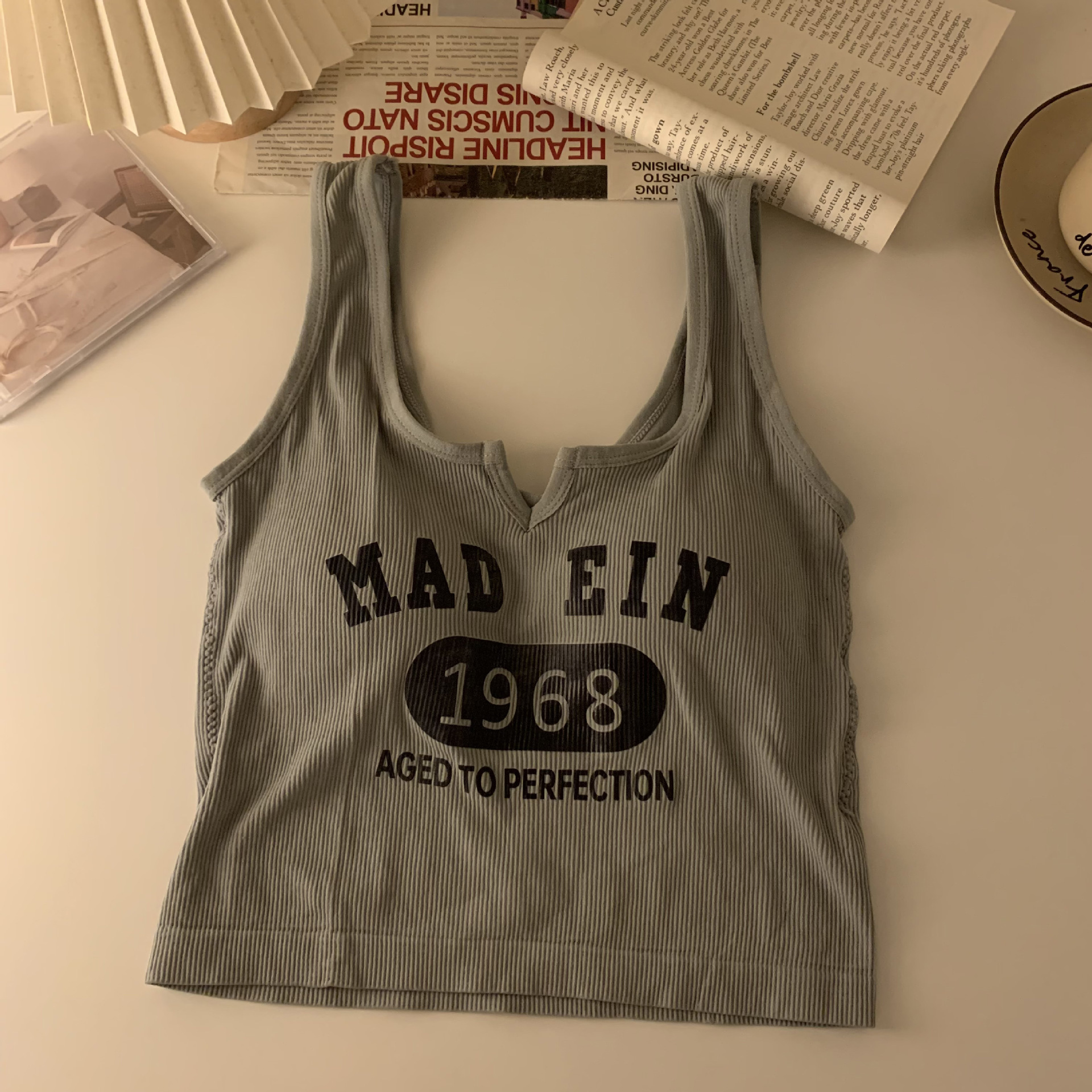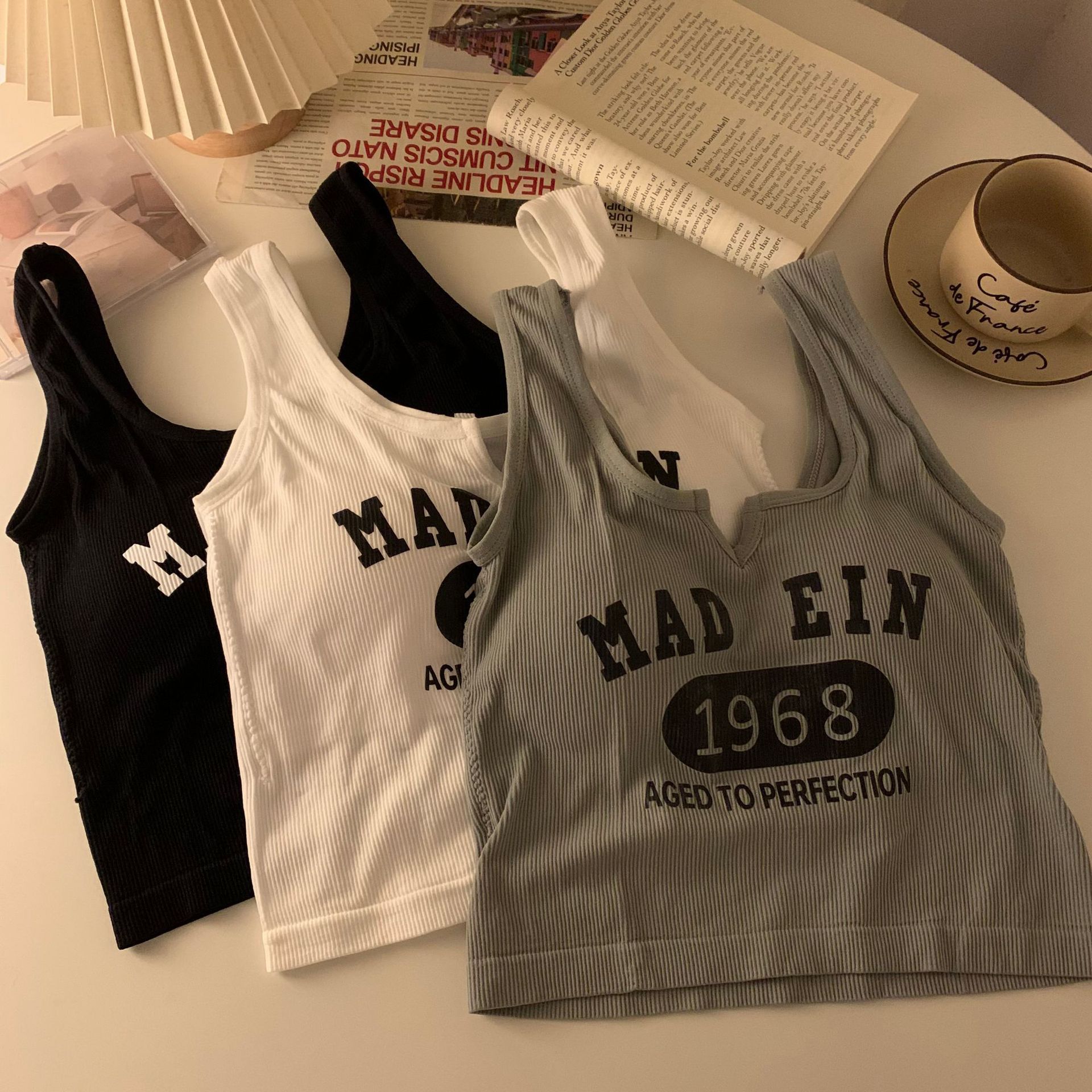 한국식 아름다운 등 일체형 고정컵 패셔너블하고 캐주얼하며 활용도가 높은 레터조끼, 앞가슴에 작은 V 디자인으로 가슴을 감싸주는 베이스레이어