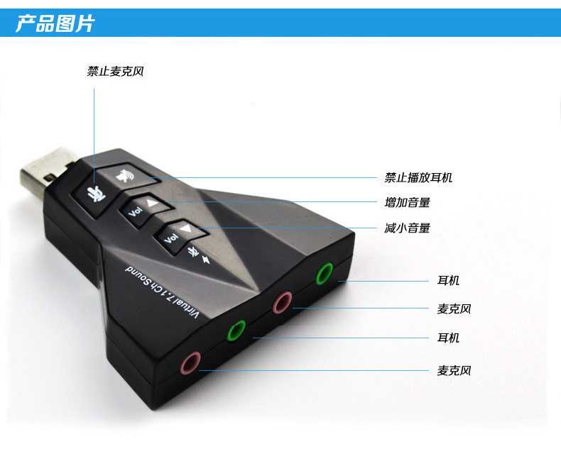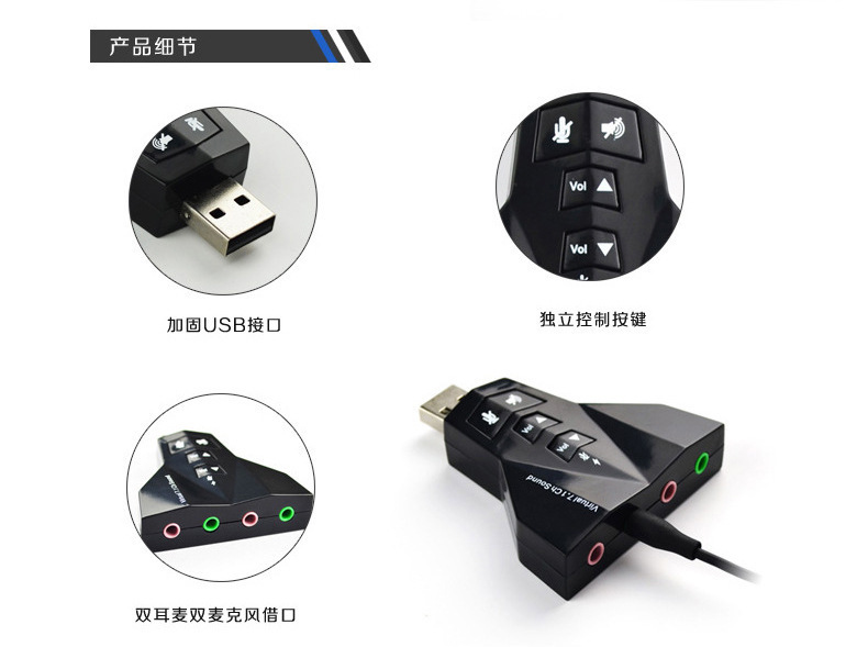 • USB-7.1 사운드 카드 알루미늄 헤드(케이블 단일 구멍 투인원)