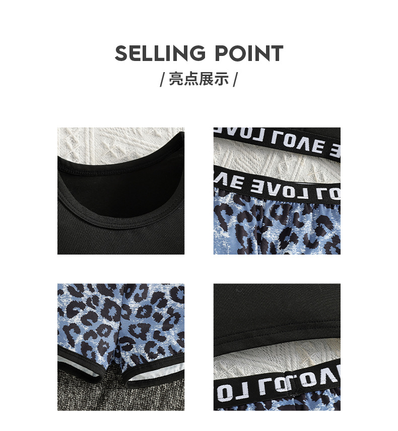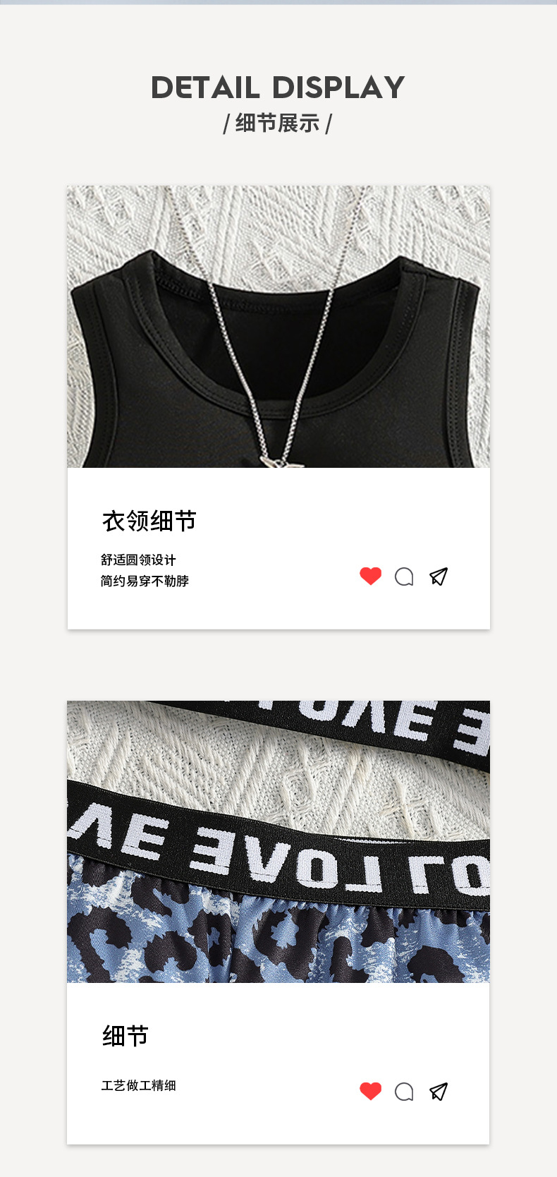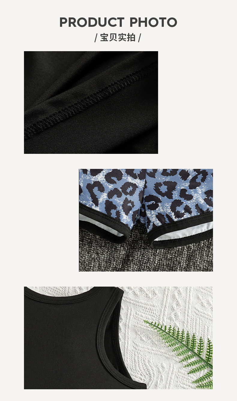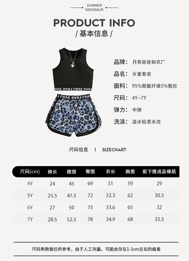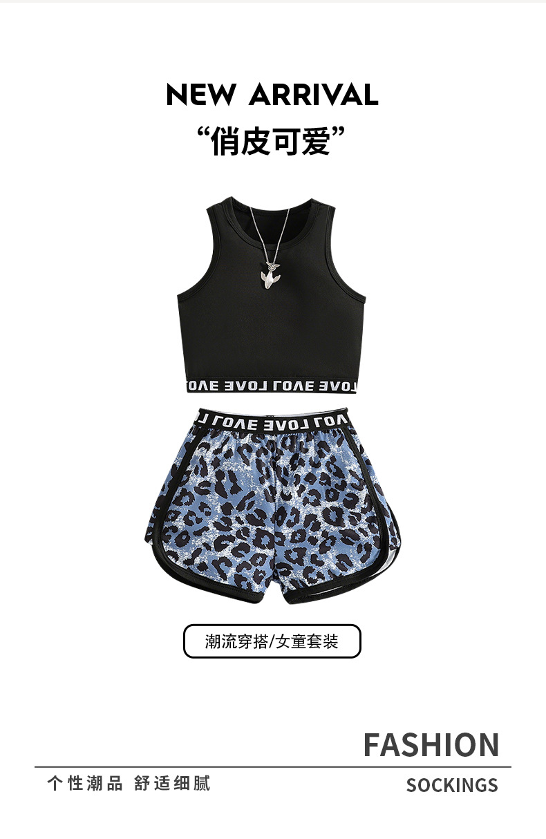 대외 무역 소녀 스포츠 정장 검은 조끼 탑 스포츠 편지 웨빙 레오파드 반바지 어린이 여름 정장스토어 가기
