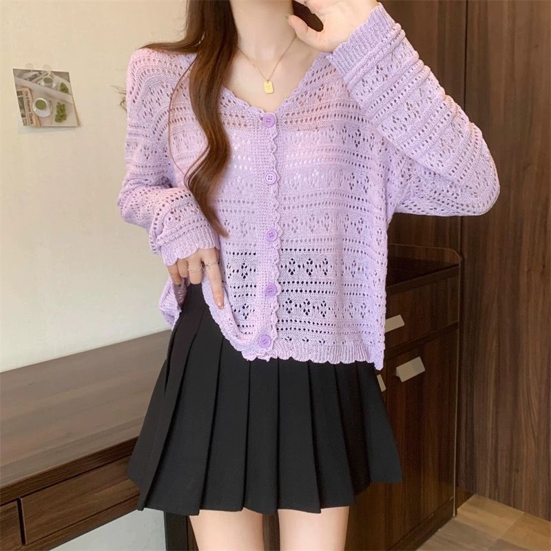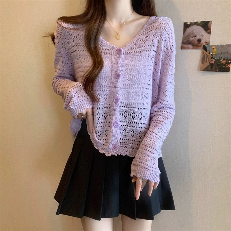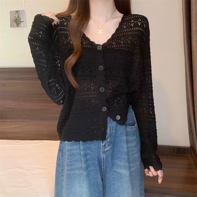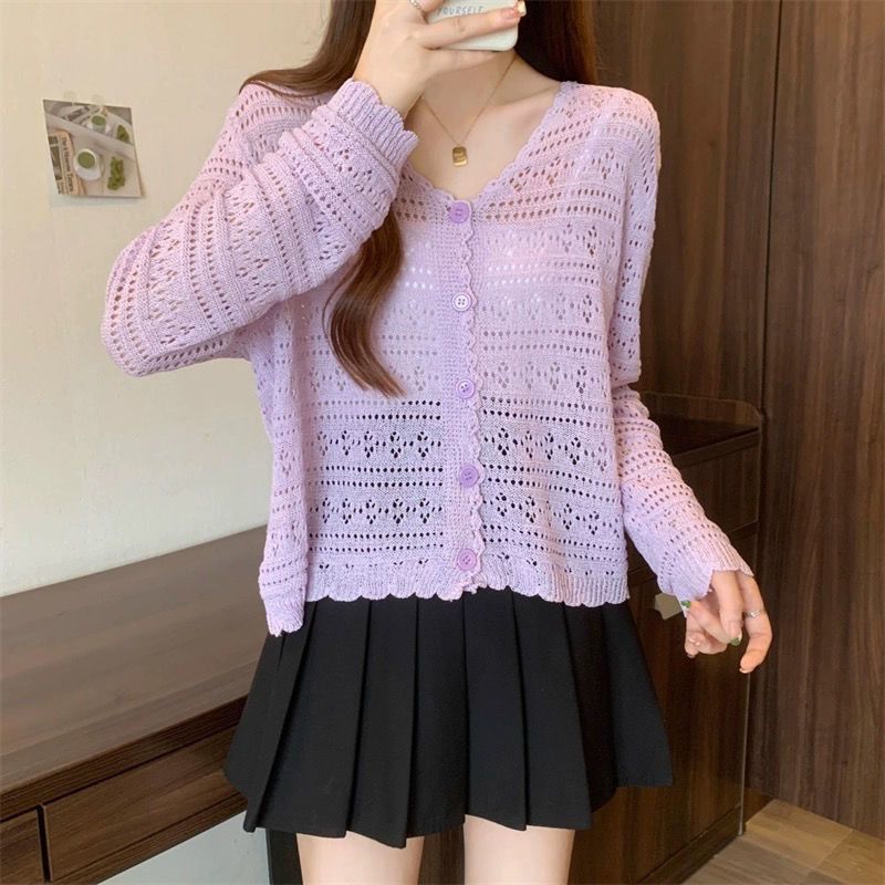 여름 할로우 니트 카디건 새로운 여성용 얇은 칼라 얇은 코트 에어컨 목도리 선 스크린 긴 소매 짧은 탑스토어 가기