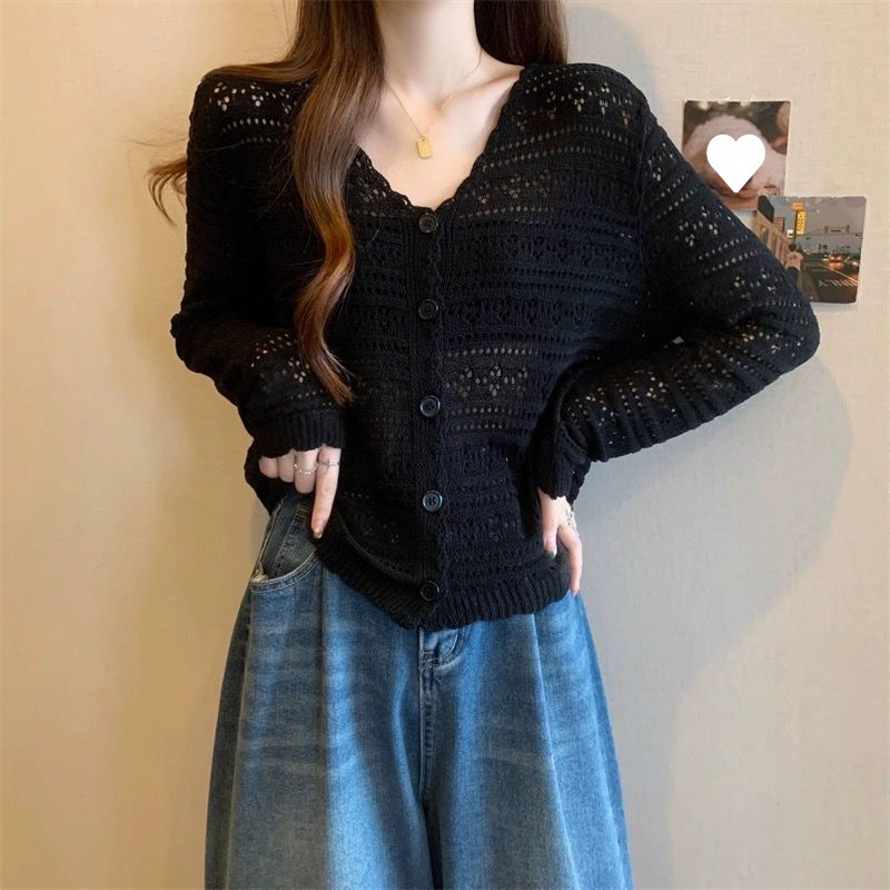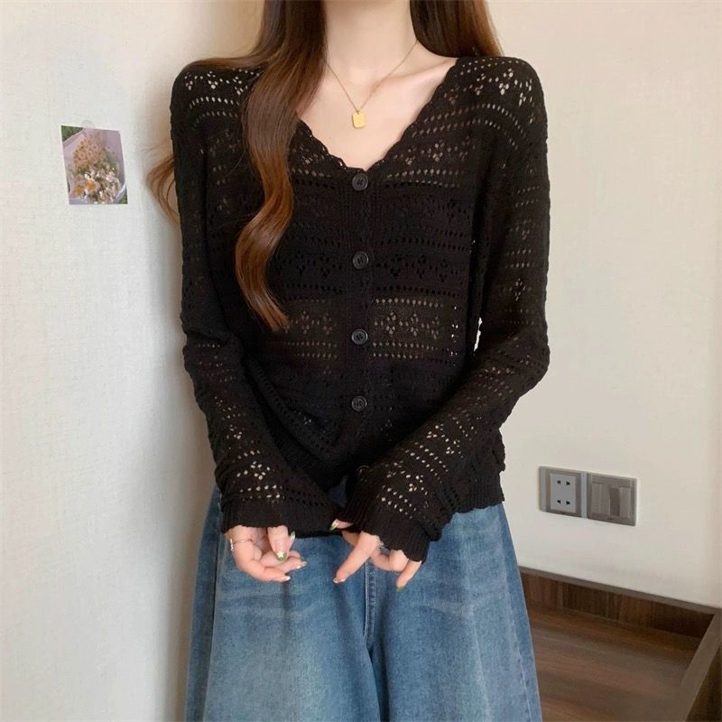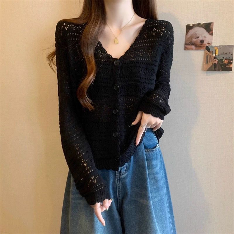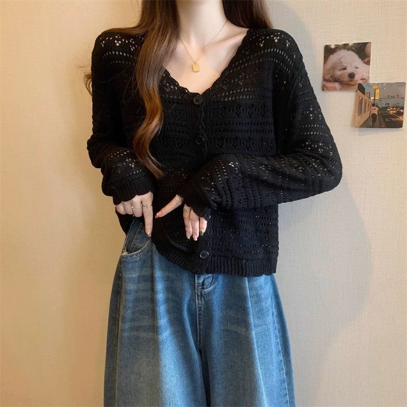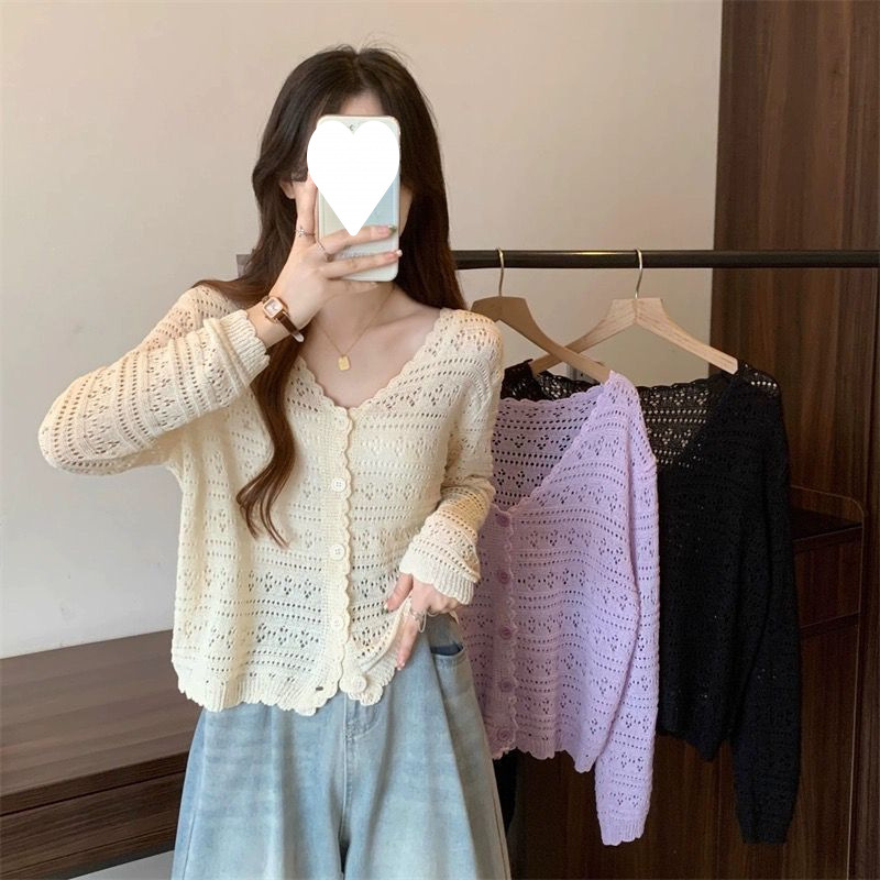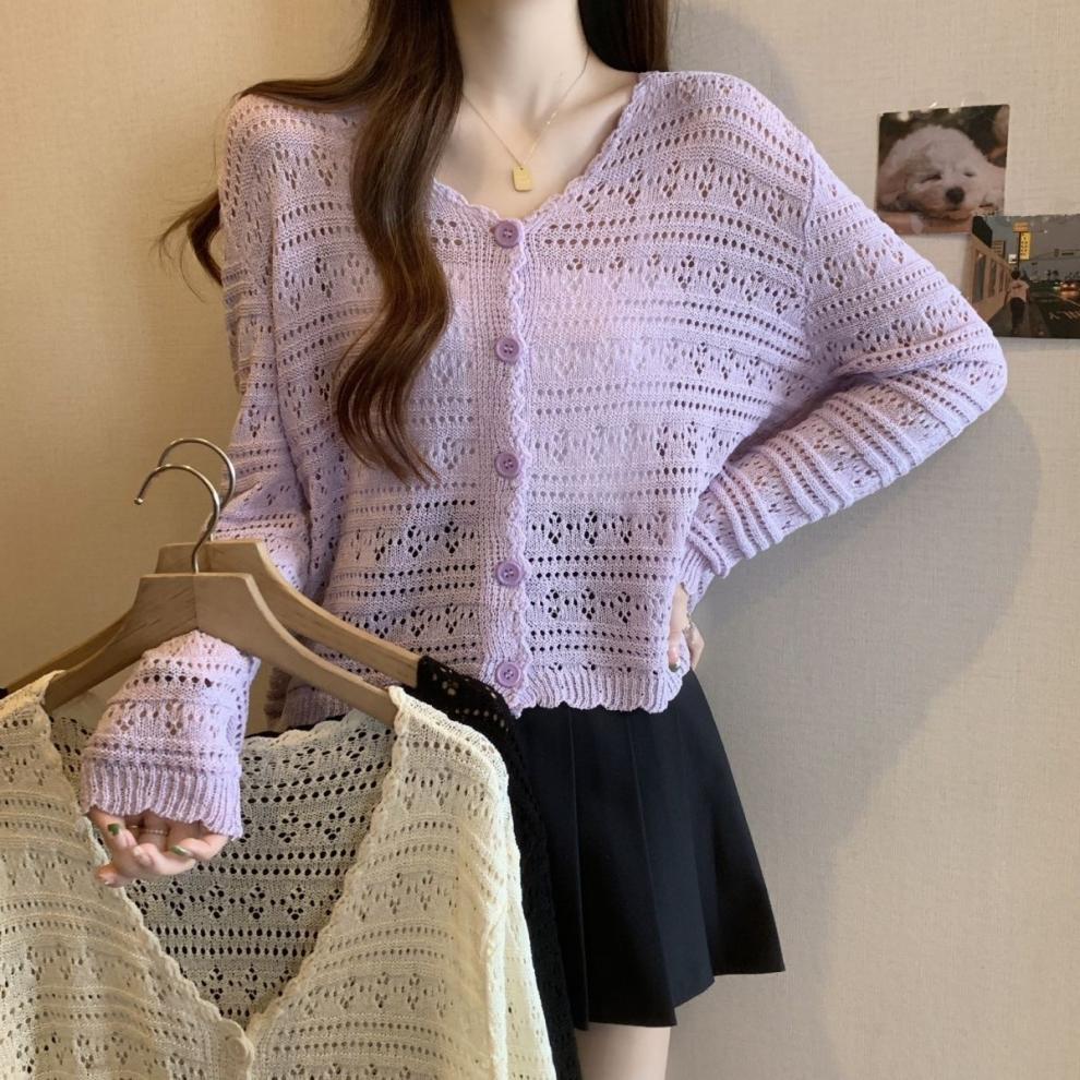 여름 할로우 니트 카디건 새로운 여성용 얇은 칼라 얇은 코트 에어컨 목도리 선 스크린 긴 소매 짧은 탑