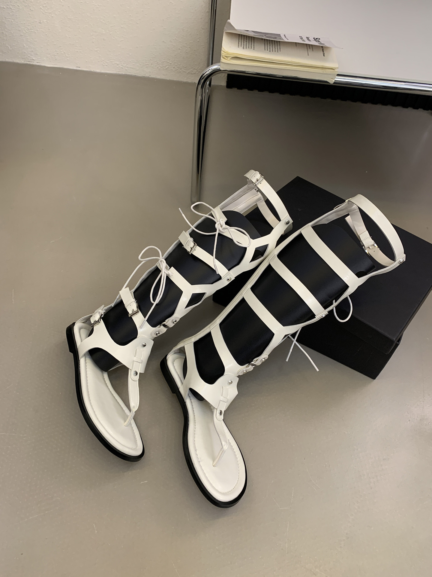 2025년 신상 여름 하이탑 스트랩 로마 샌들, 스퀘어 토 플립플롭, 플랫 바닥 보헤미안 비치 롱 샌들 여성용