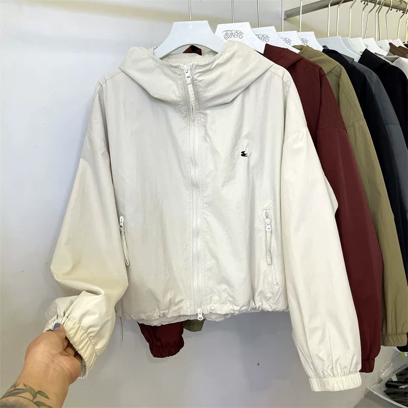 Q6J 스포츠 캐주얼 스타일 스탠드 칼라 후드 긴팔 재킷 여성용 더블 지퍼 드로스트링 밑단 솔리드 컬러 재킷 쇼트 아우터