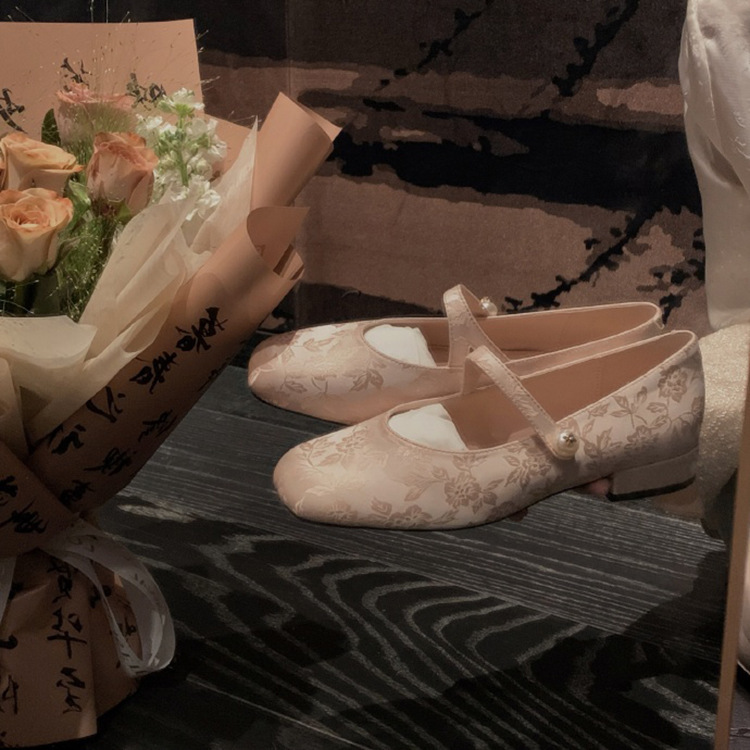 새로운 양가죽 중국풍 신상 여성용 구두, 스커트와 함께 착용하는 진주 실크 자카드 스트랩 스퀘어토 메리제인 슈즈스토어 가기