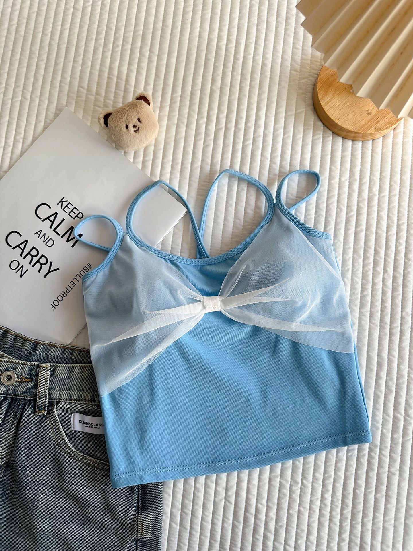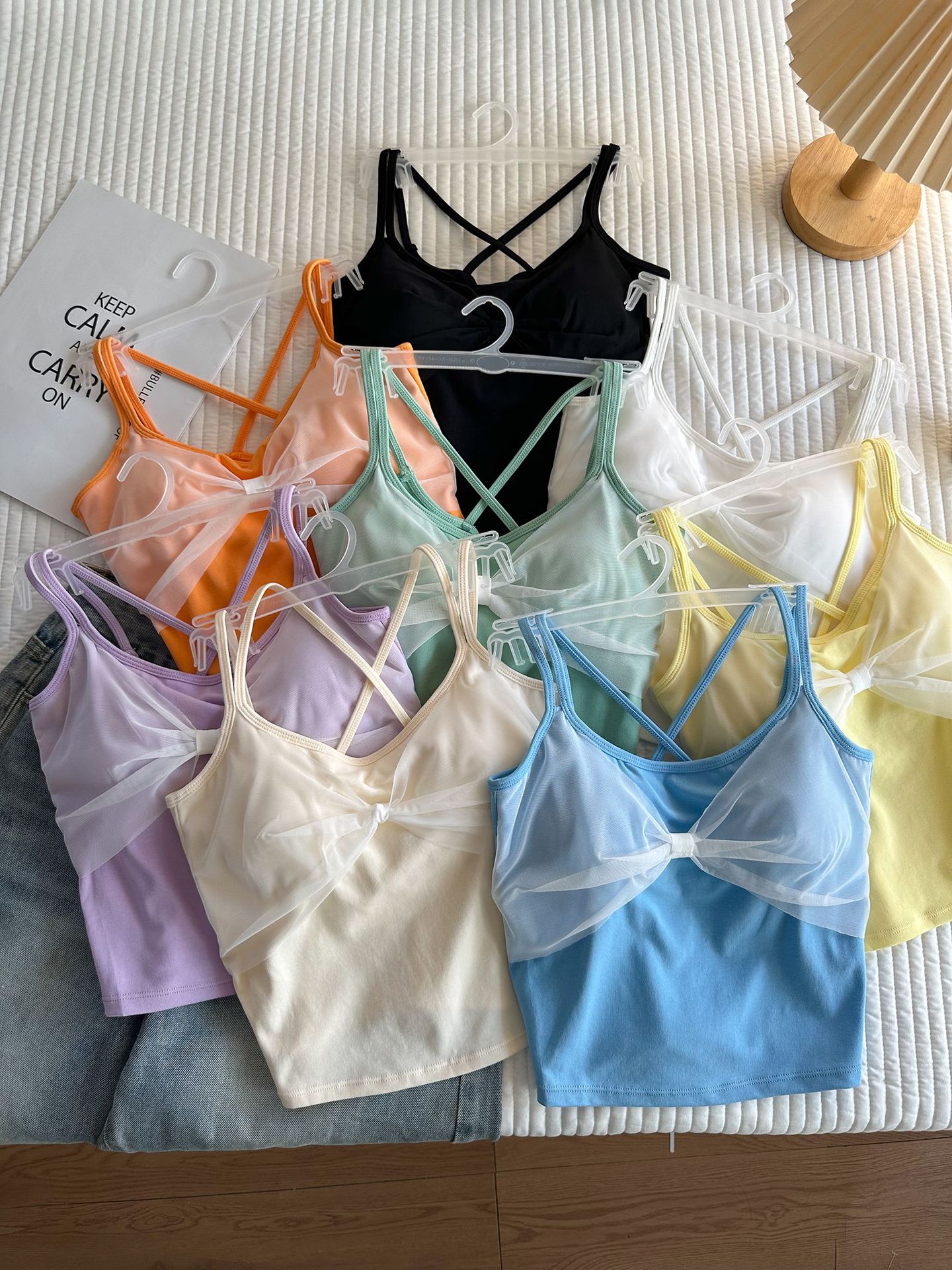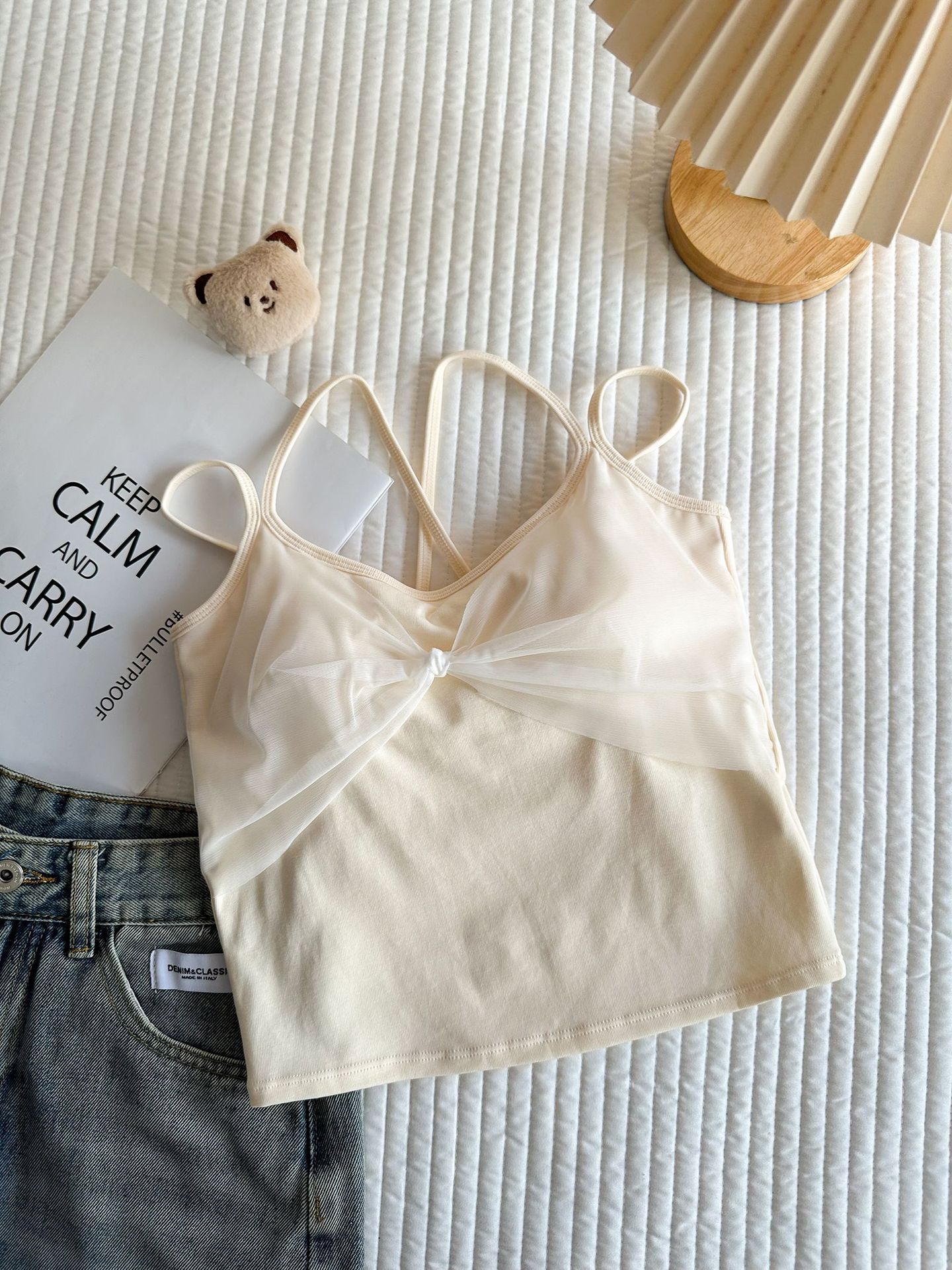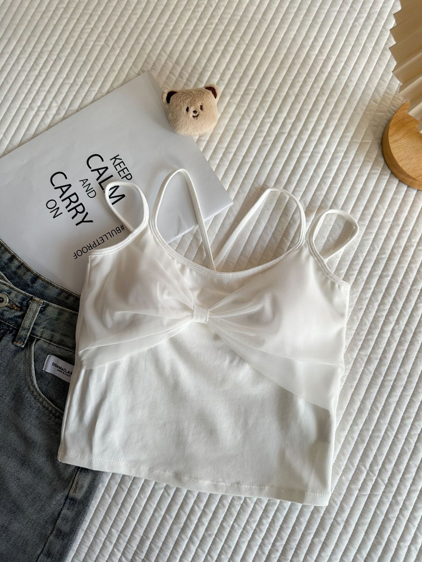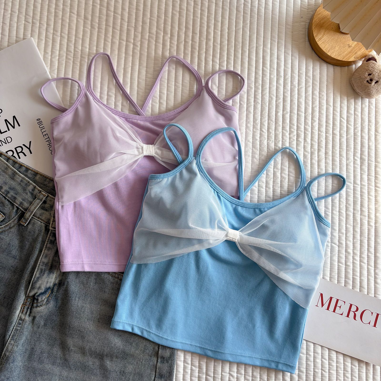 Pure Desire 더블 숄더 스트랩 레이스 보우 캐미솔 고정 컵 여름 도파민 아름다운 등 짧은 아우터 탑