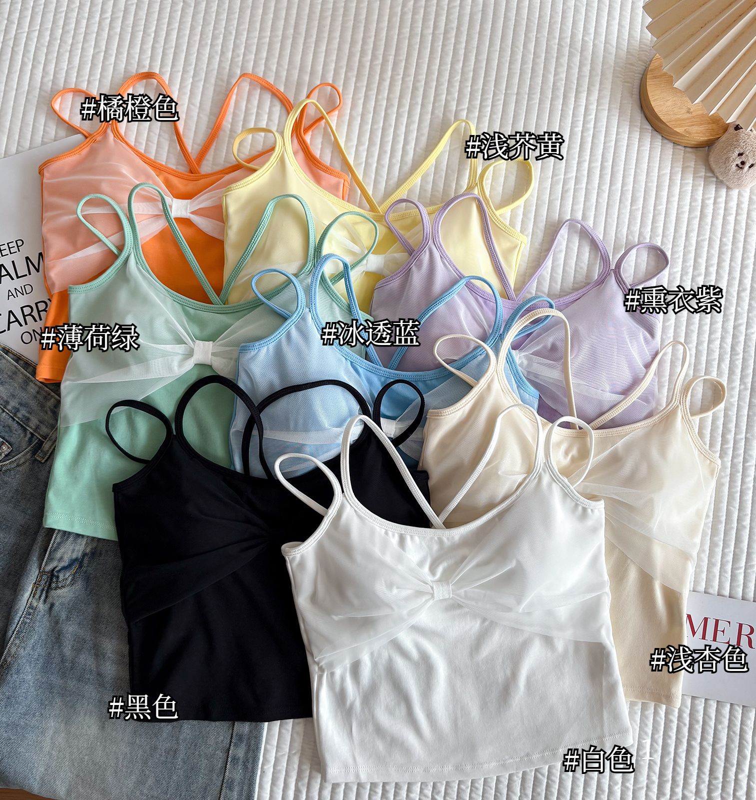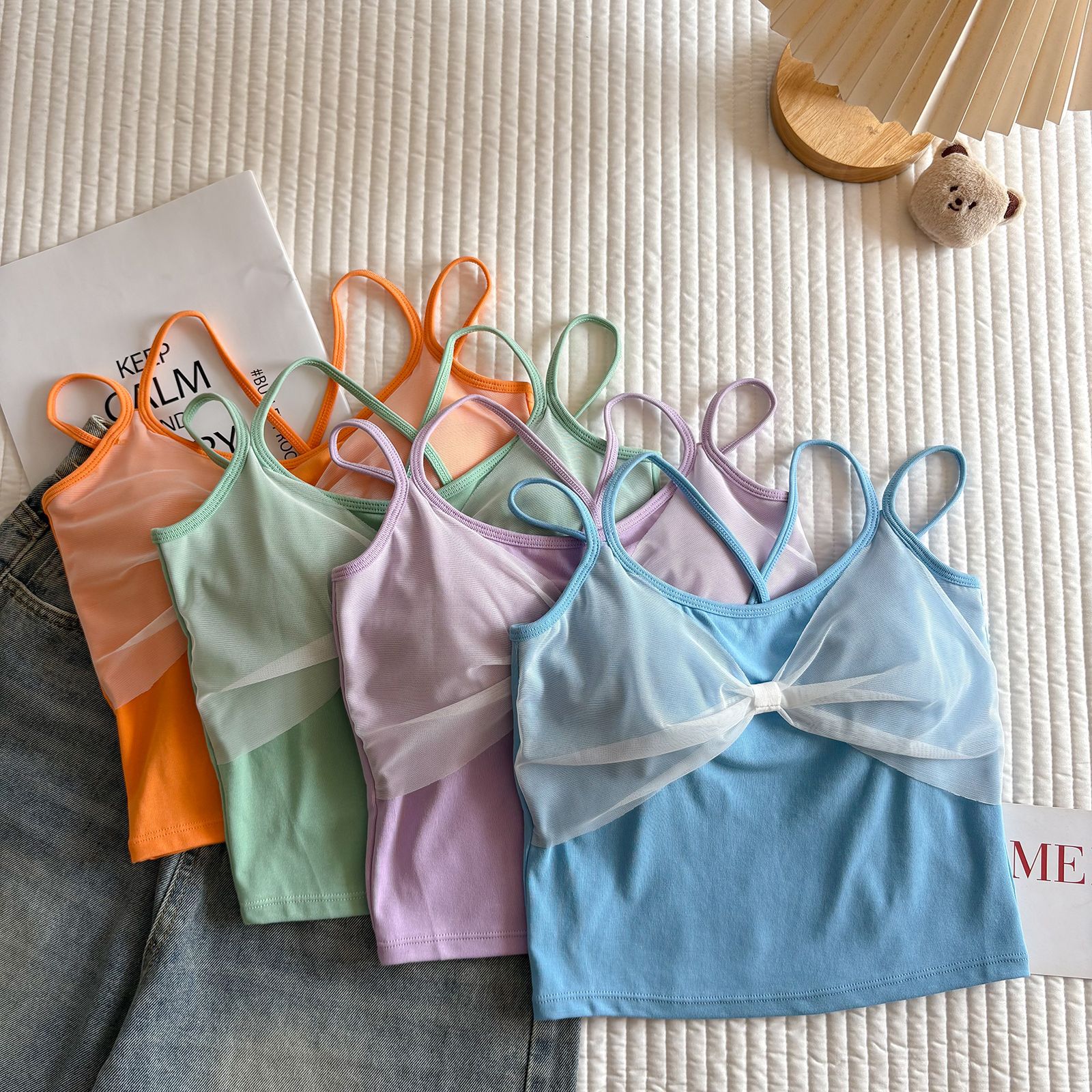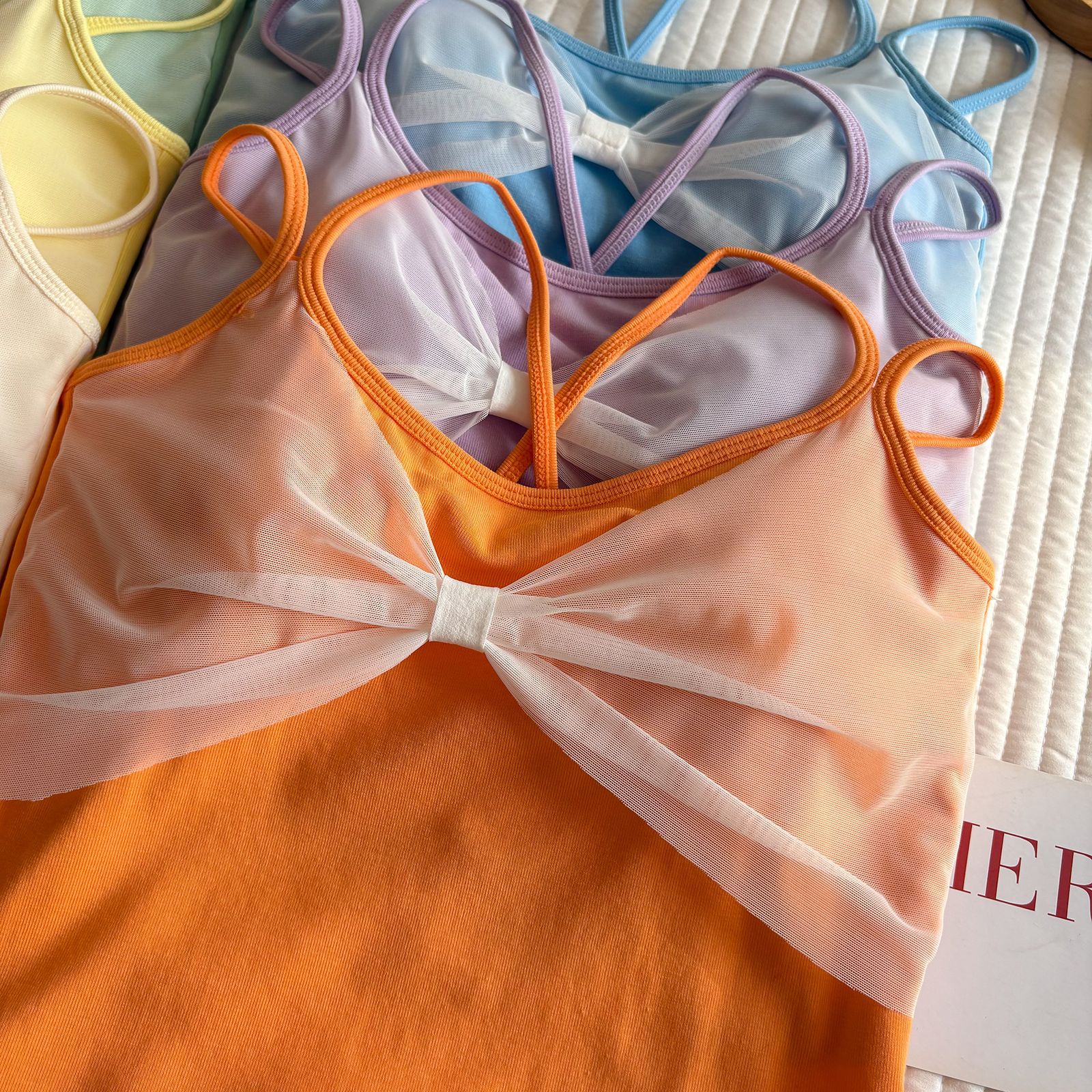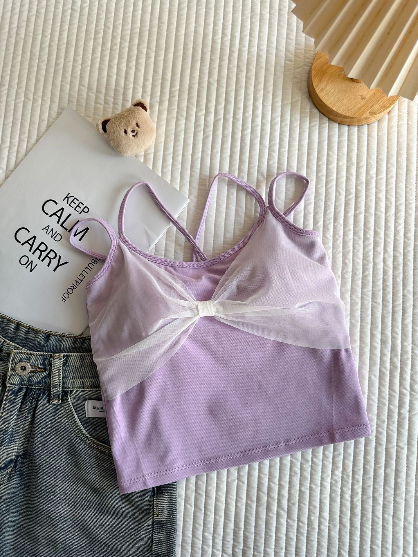 Pure Desire 더블 숄더 스트랩 레이스 보우 캐미솔 고정 컵 여름 도파민 아름다운 등 짧은 아우터 탑