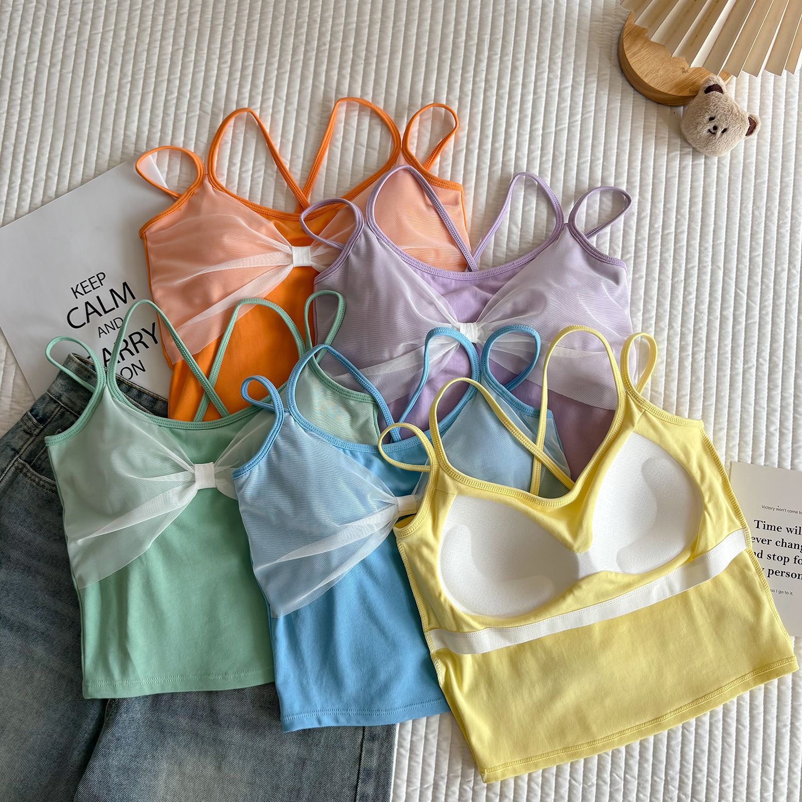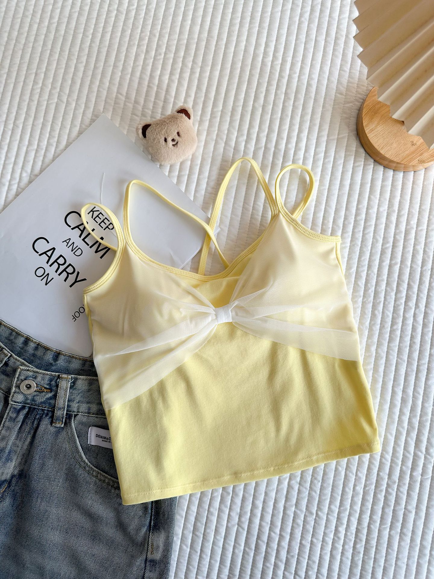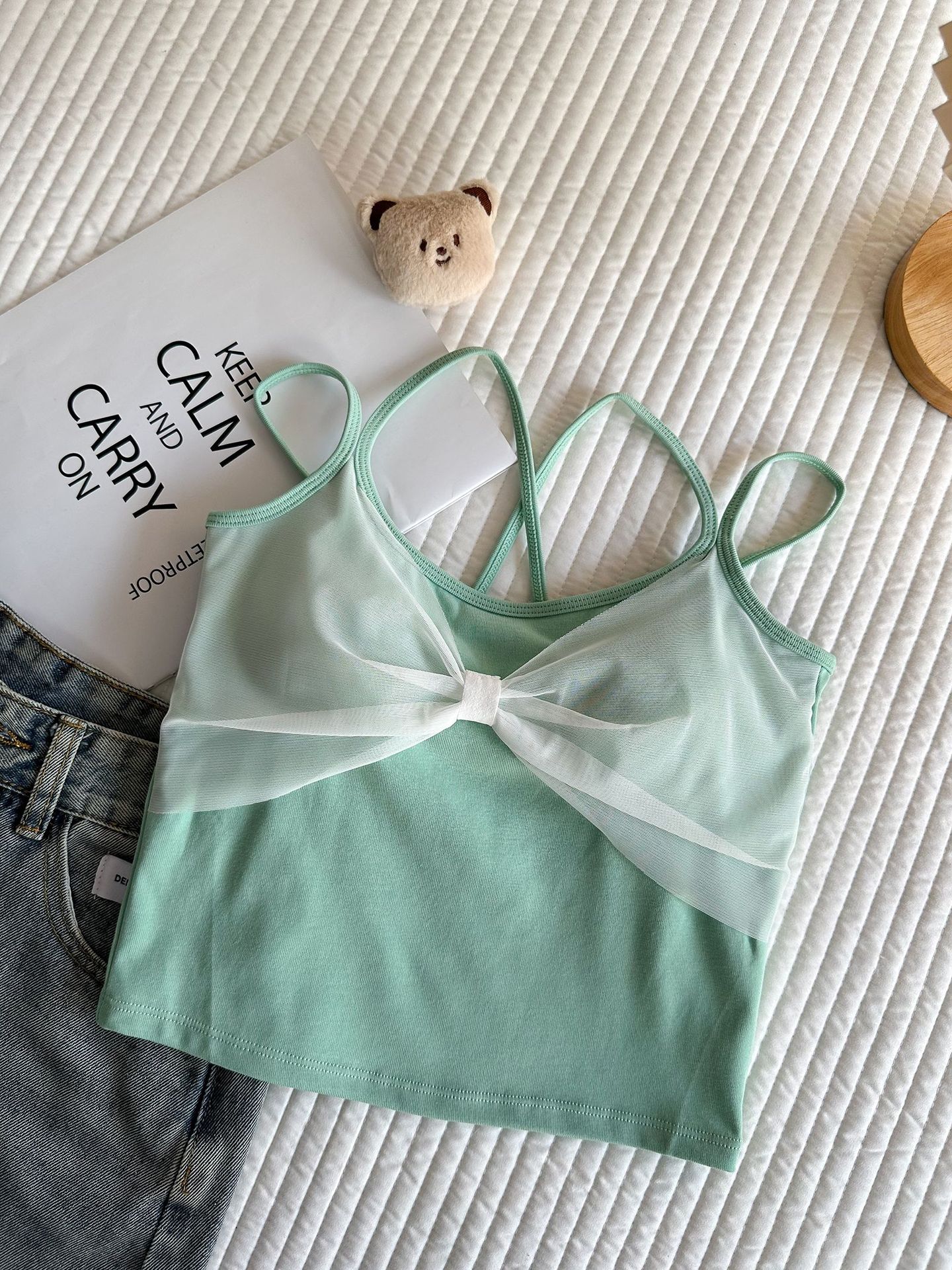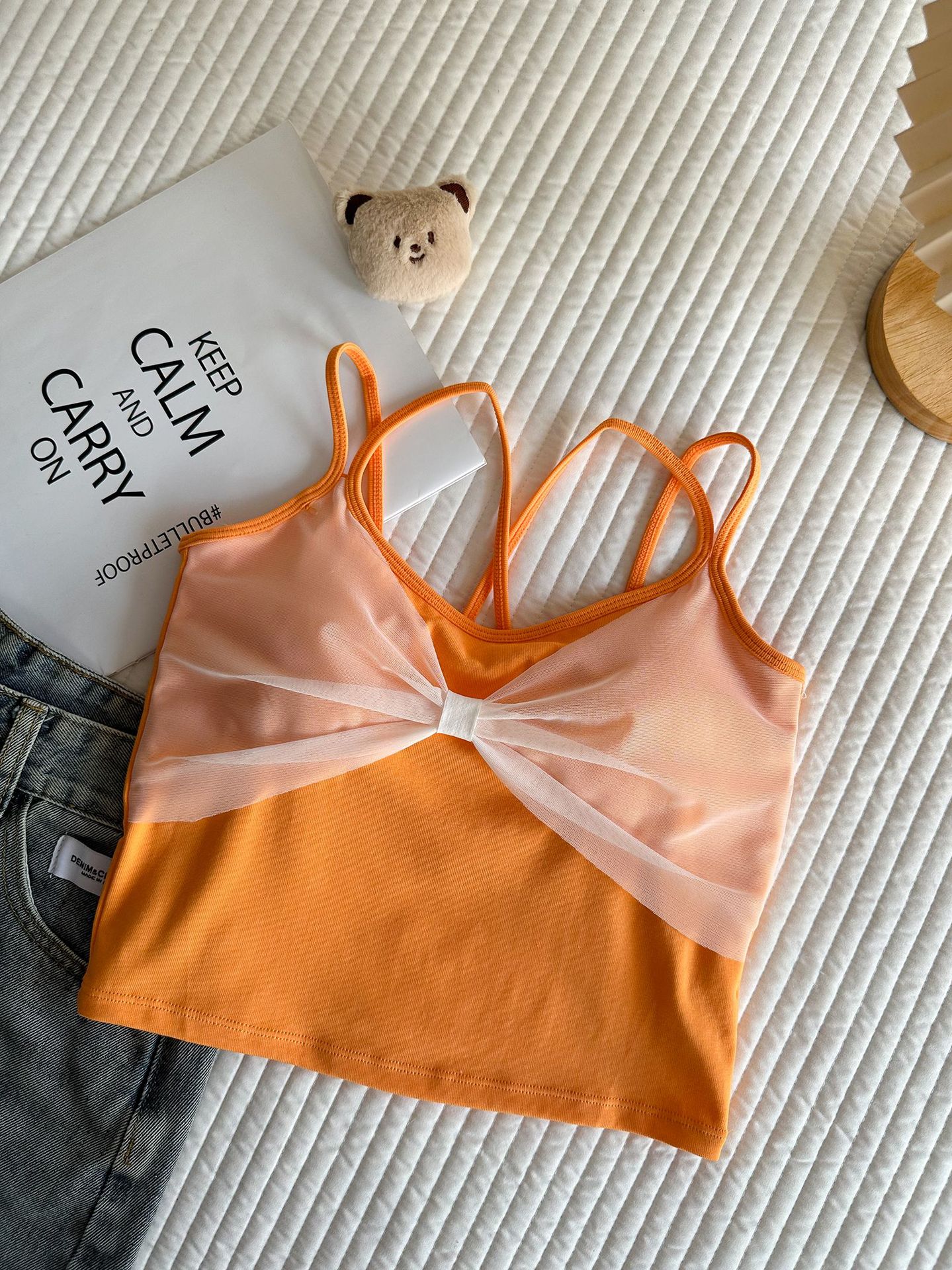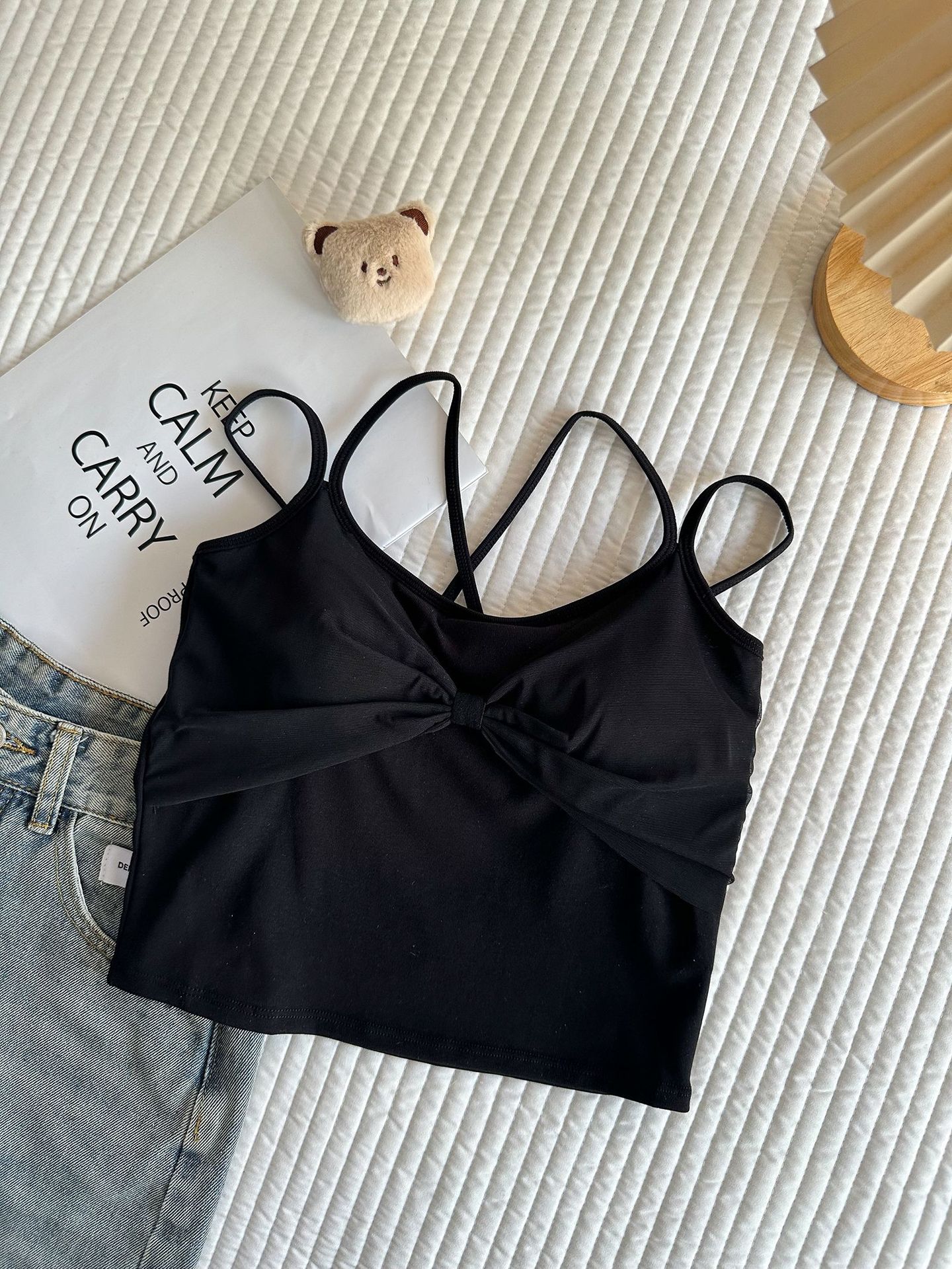 Pure Desire 더블 숄더 스트랩 레이스 보우 캐미솔 고정 컵 여름 도파민 아름다운 등 짧은 아우터 탑