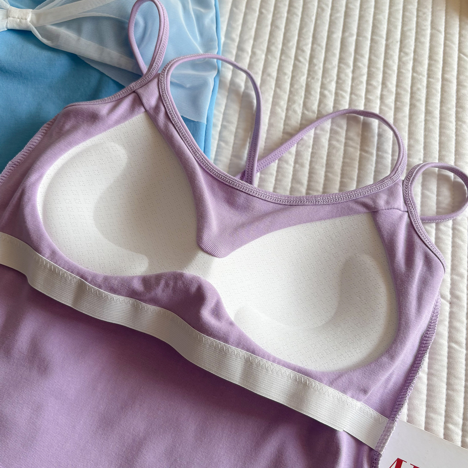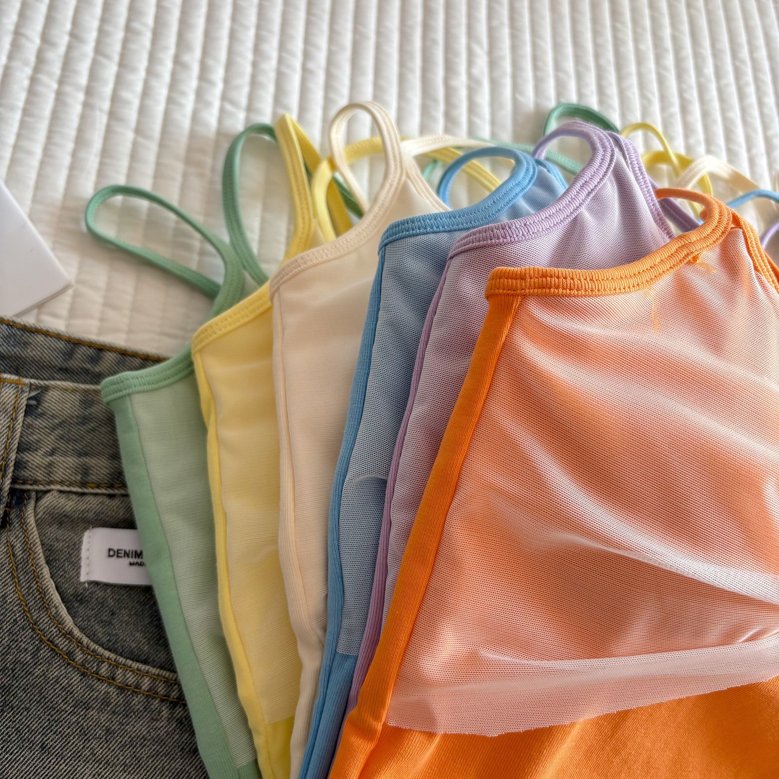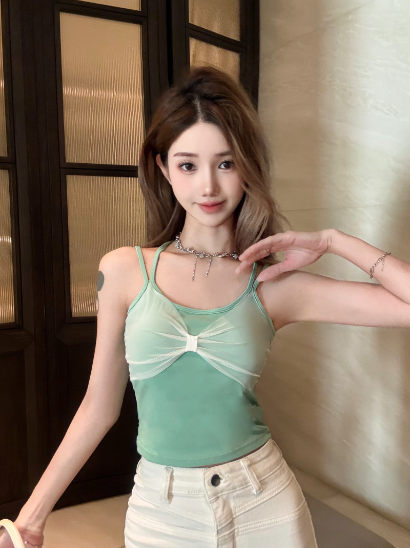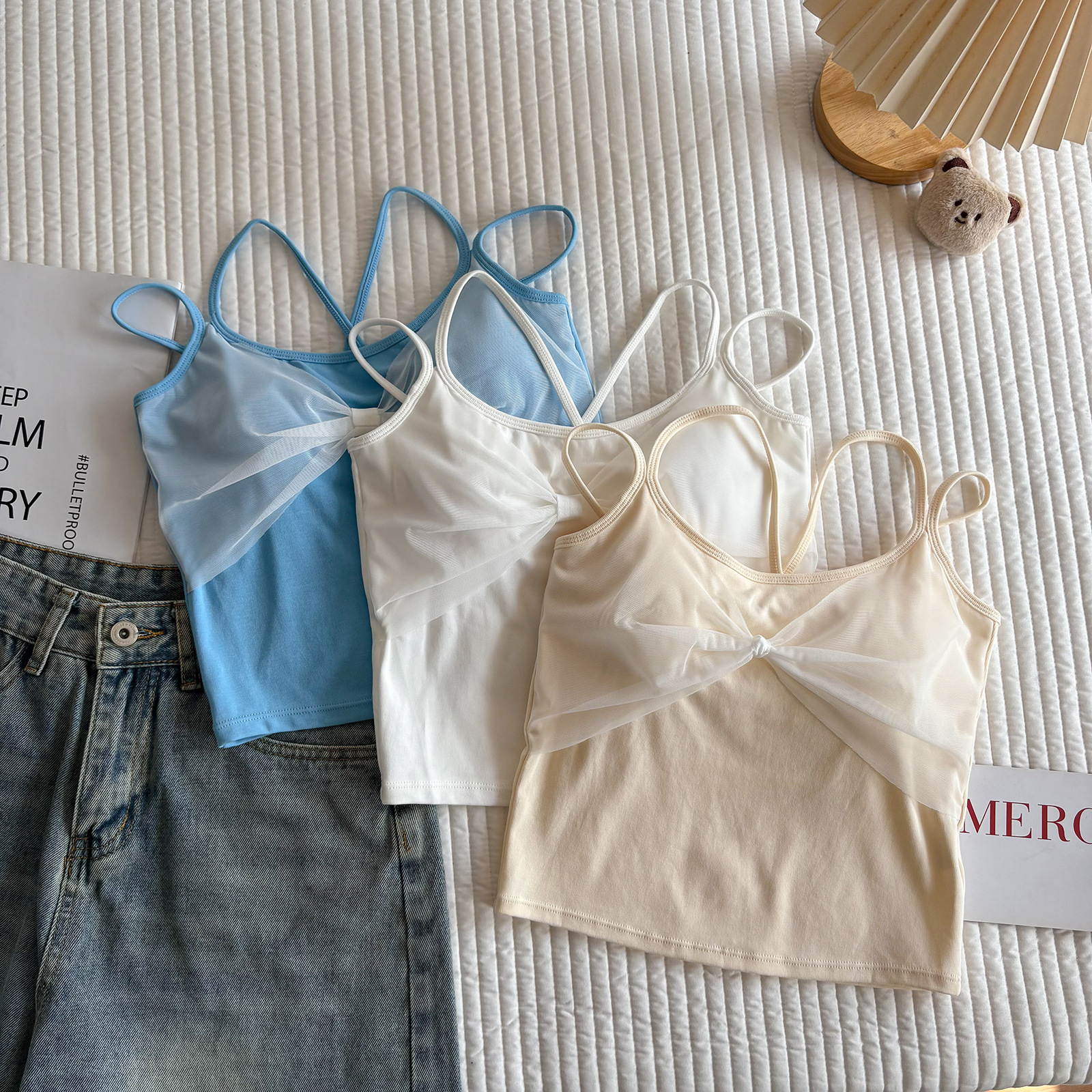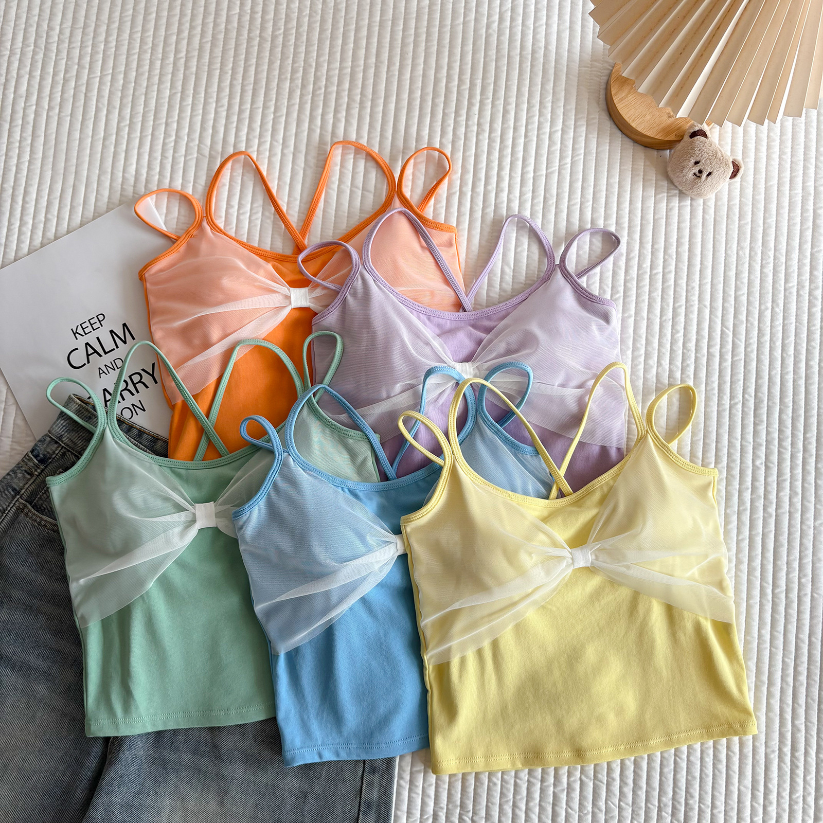 Pure Desire 더블 숄더 스트랩 레이스 보우 캐미솔 고정 컵 여름 도파민 아름다운 등 짧은 아우터 탑