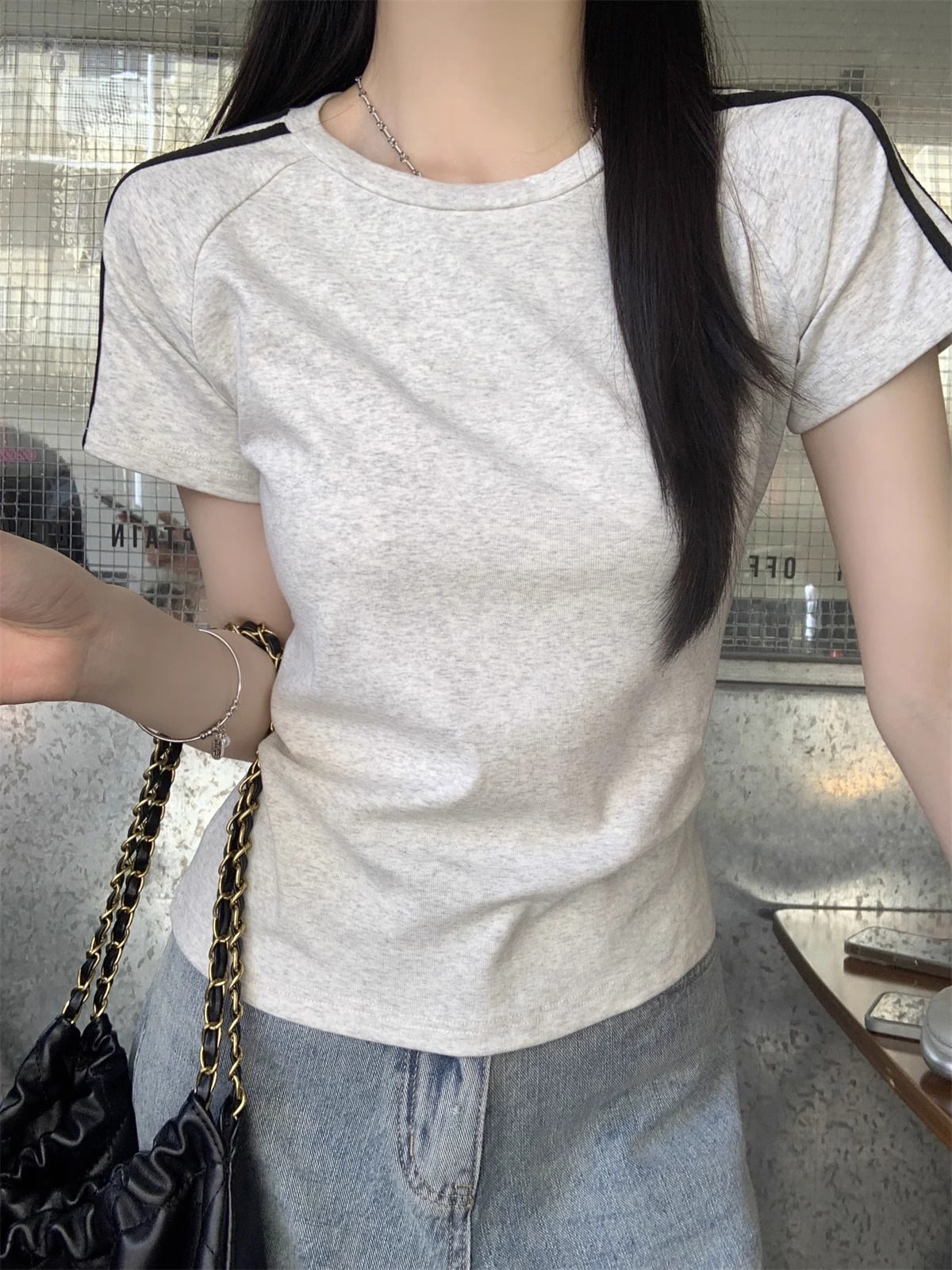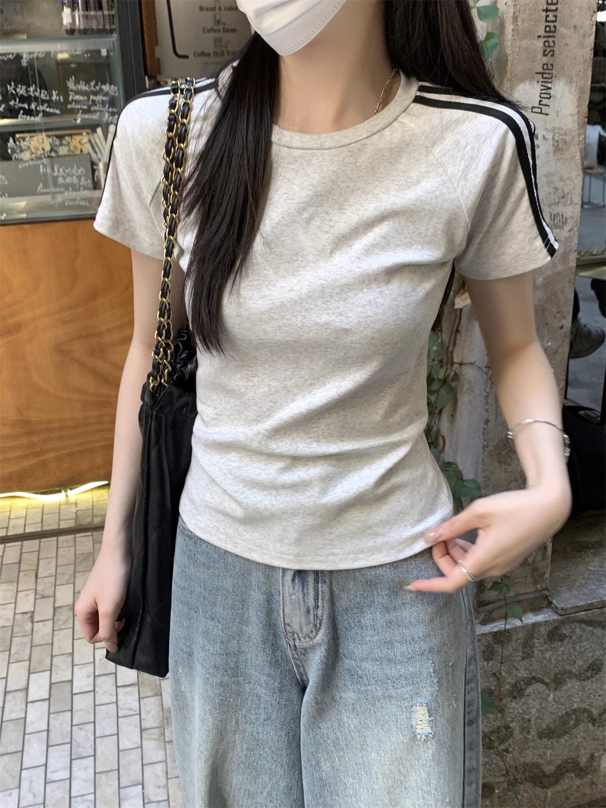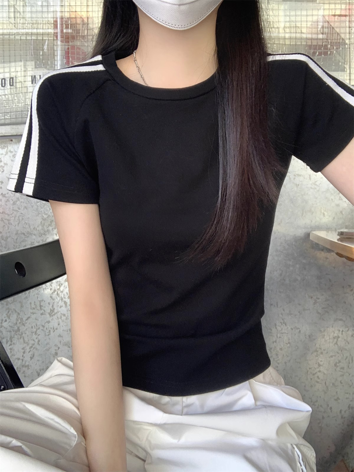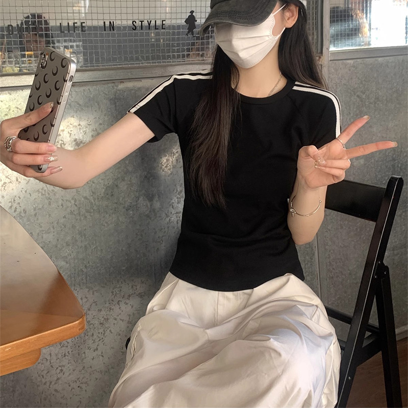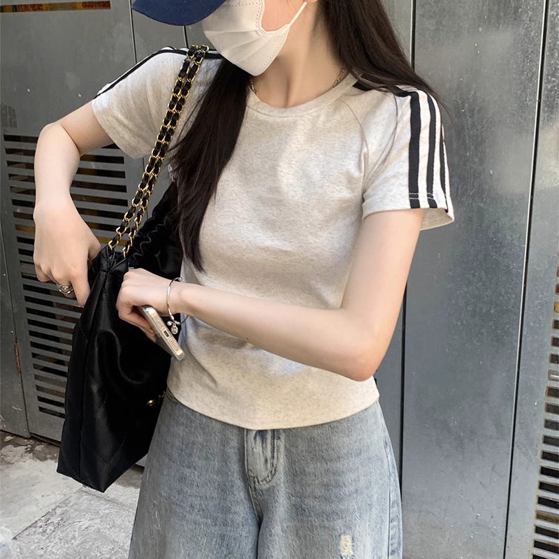여름 디자인 핫걸 슬림 스트라이프 오른쪽 어깨 반팔 티셔츠 여성용 짧은 탑 작은 슬리밍 바닥 셔츠스토어 가기
