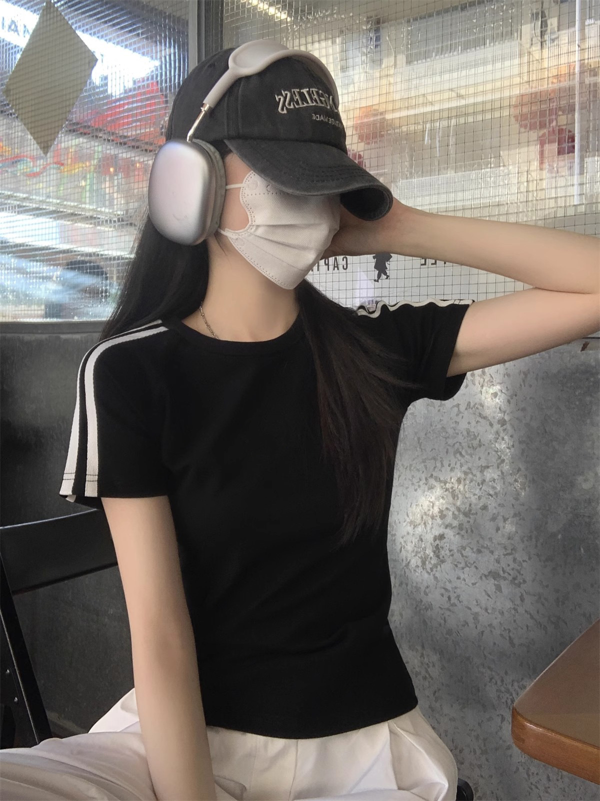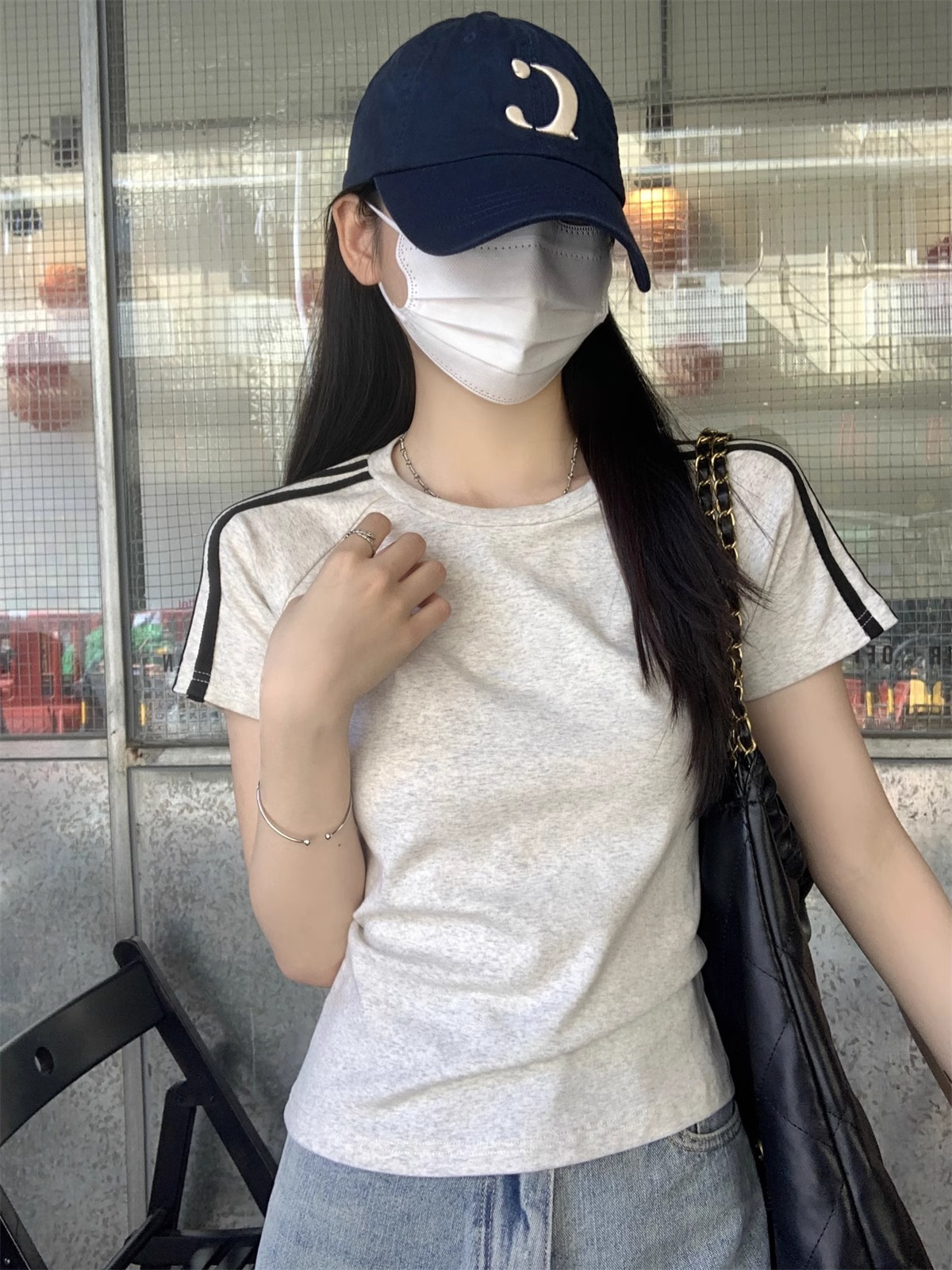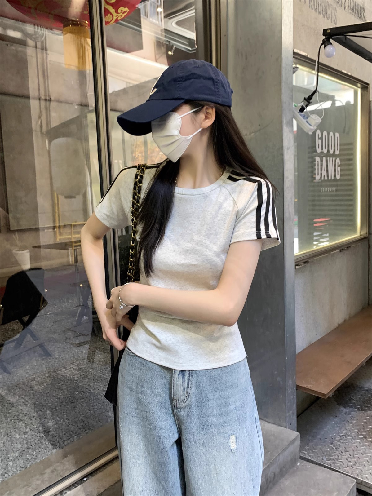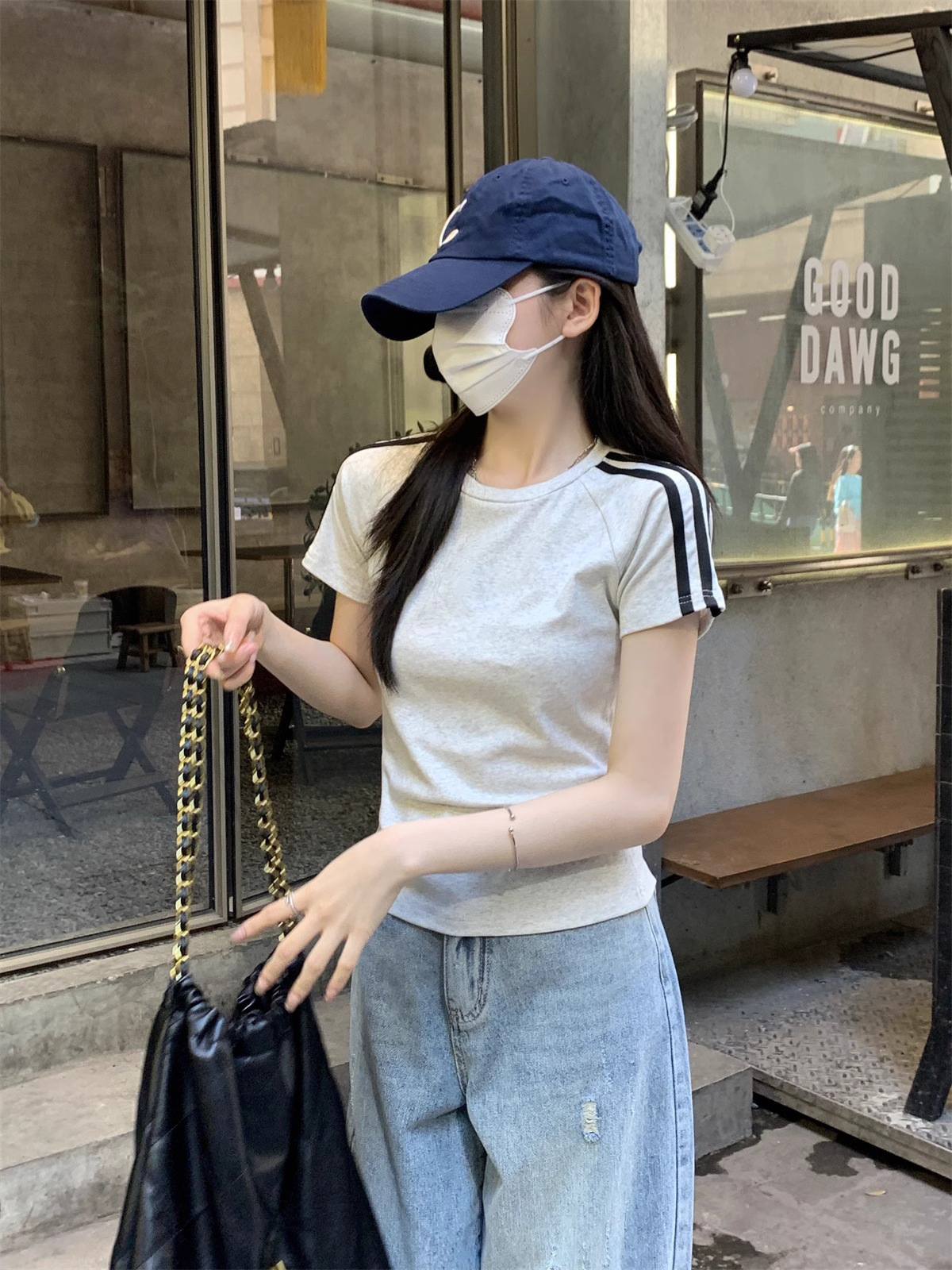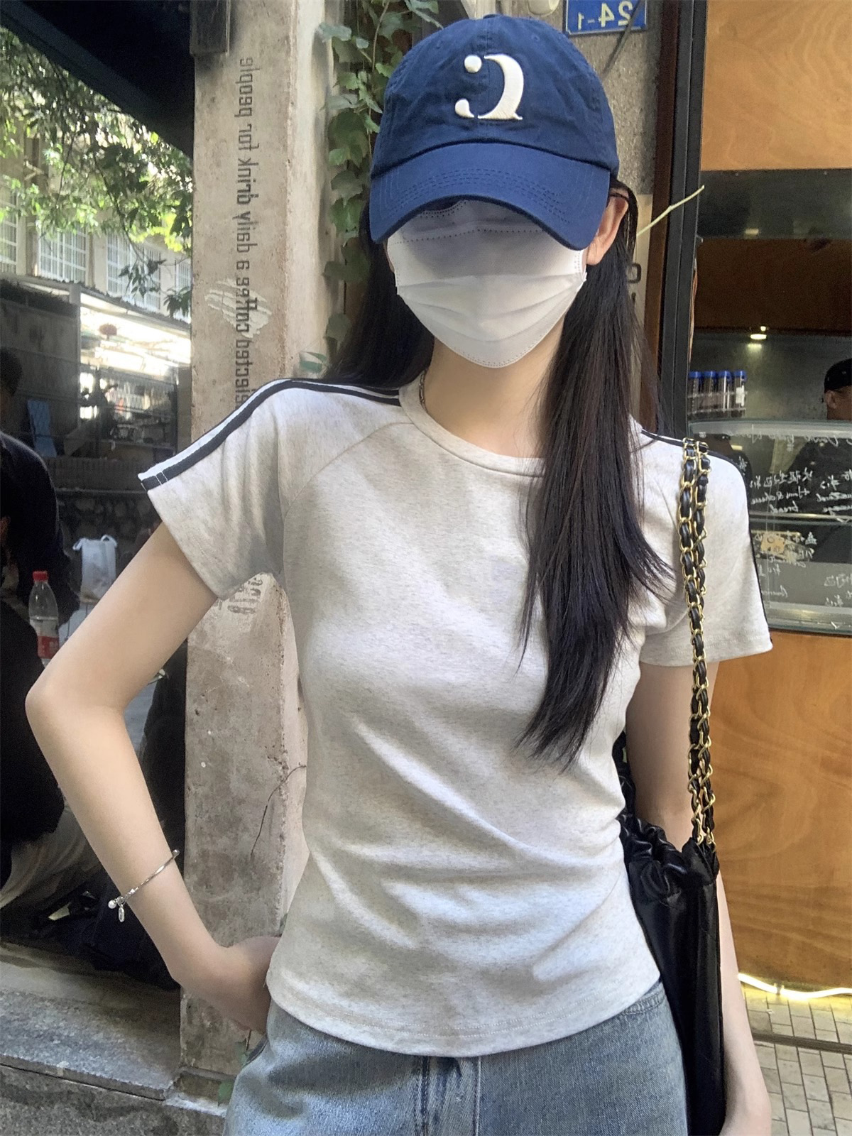 여름 디자인 핫걸 슬림 스트라이프 오른쪽 어깨 반팔 티셔츠 여성용 짧은 탑 작은 슬리밍 바닥 셔츠스토어 가기