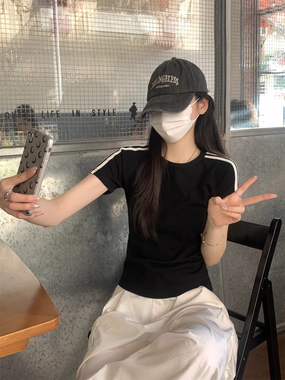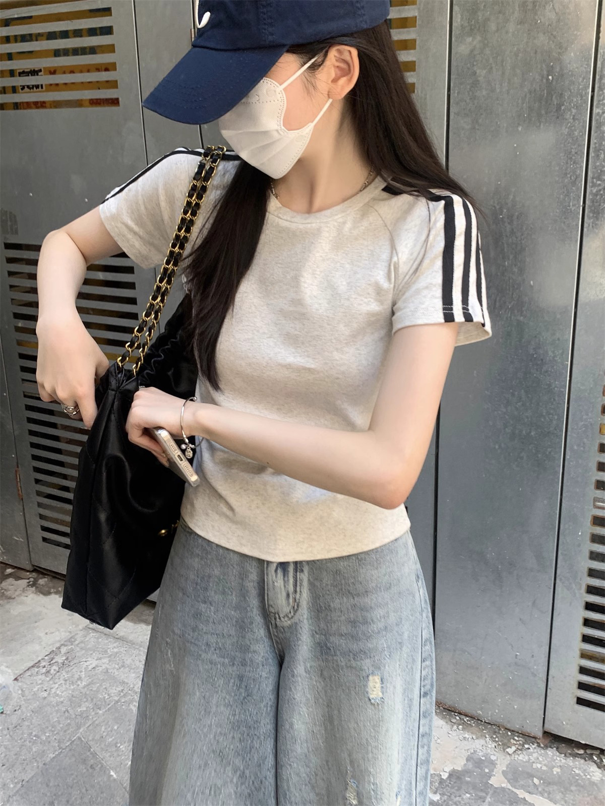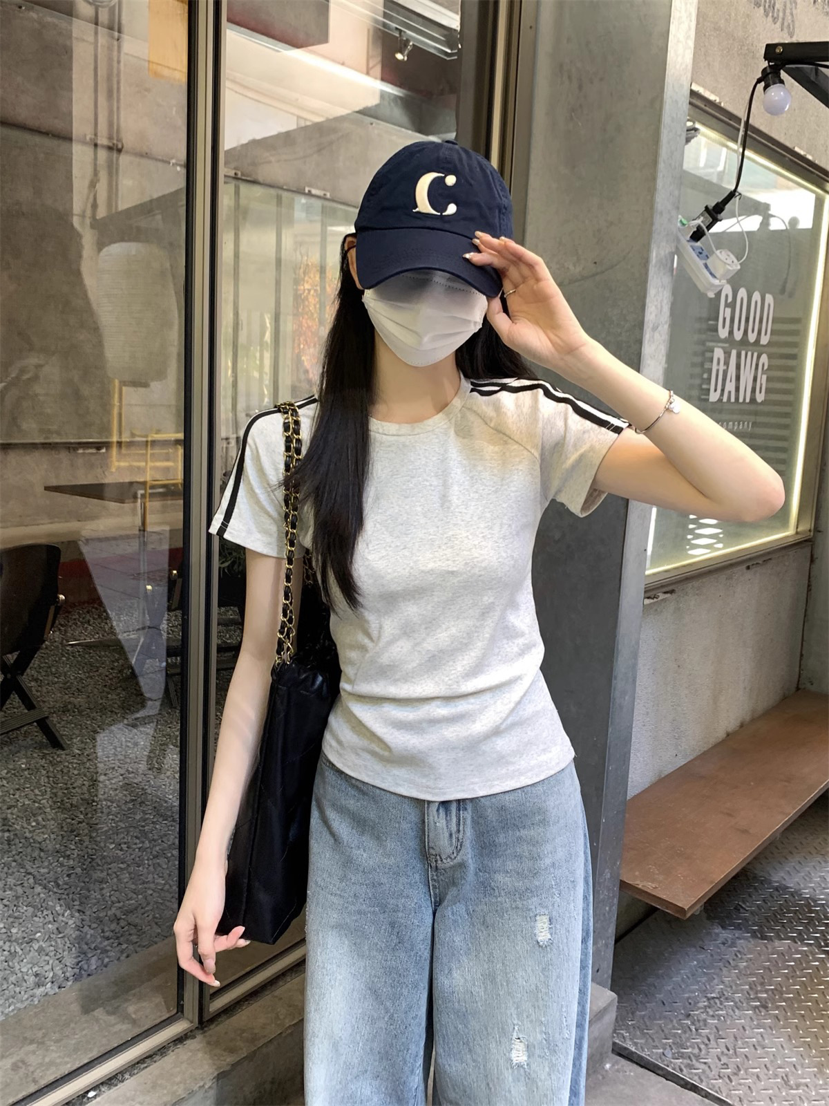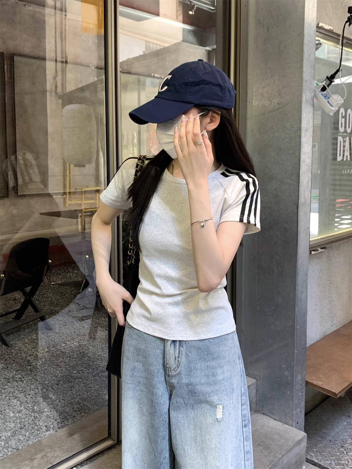 여름 디자인 핫걸 슬림 스트라이프 오른쪽 어깨 반팔 티셔츠 여성용 짧은 탑 작은 슬리밍 바닥 셔츠스토어 가기