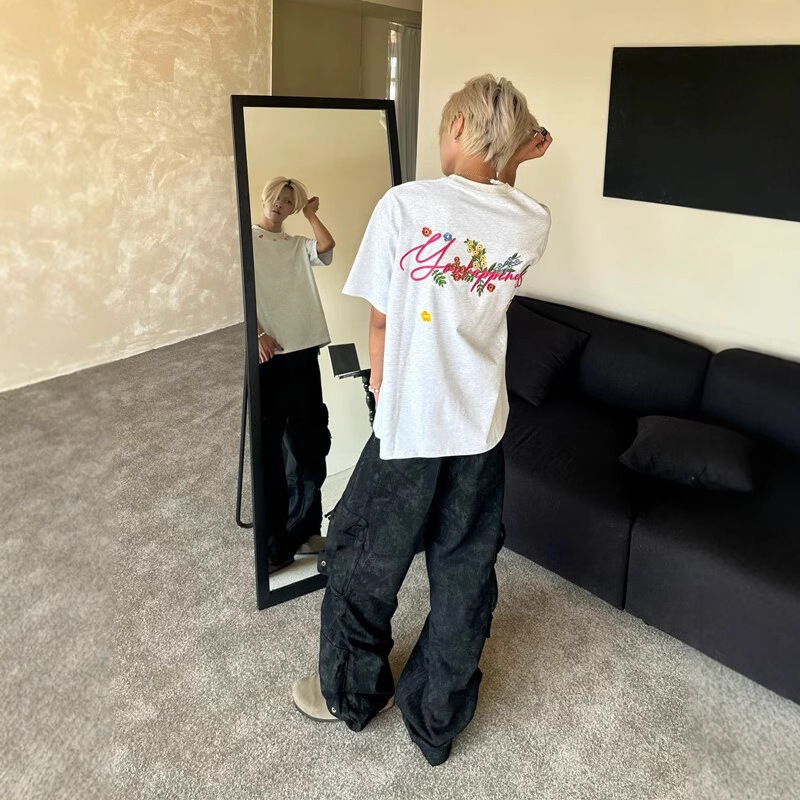 남성과 여성을위한 미국 복고풍 자수 꽃 반팔 티셔츠 2025 새로운 여름 반팔 커플 디자인 5 5 점 소매