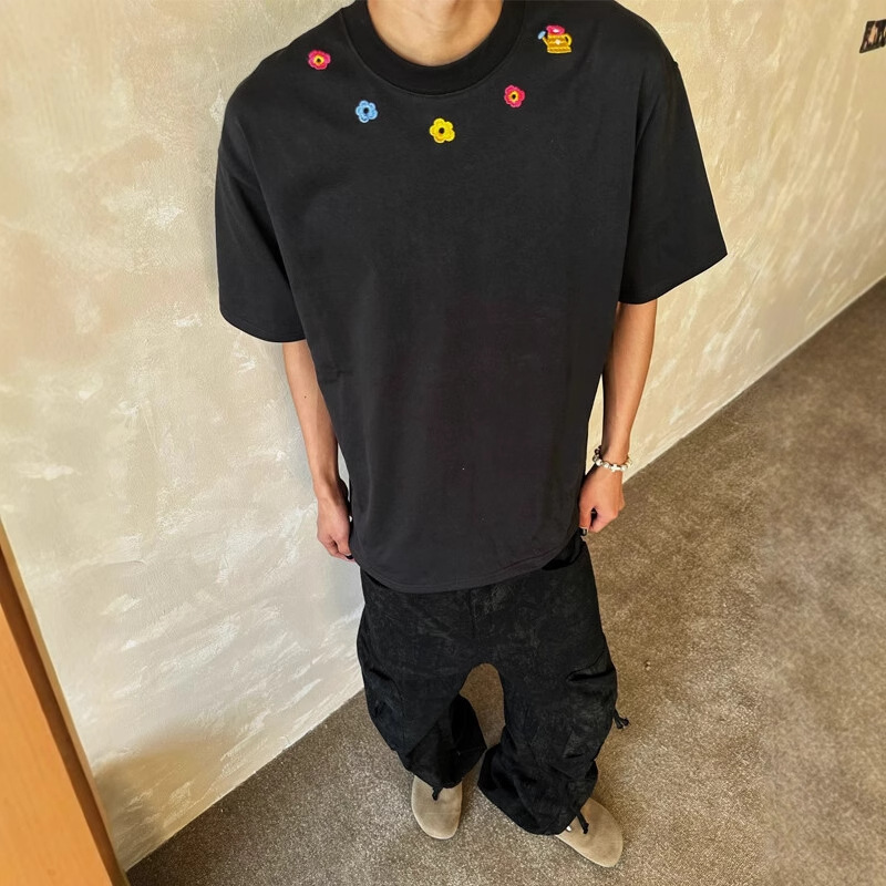 남성과 여성을위한 미국 복고풍 자수 꽃 반팔 티셔츠 2025 새로운 여름 반팔 커플 디자인 5 5 점 소매스토어 가기