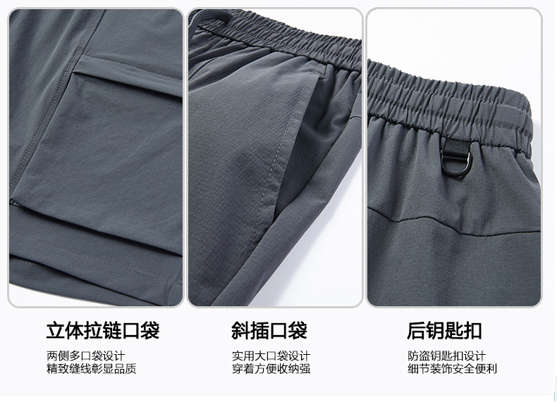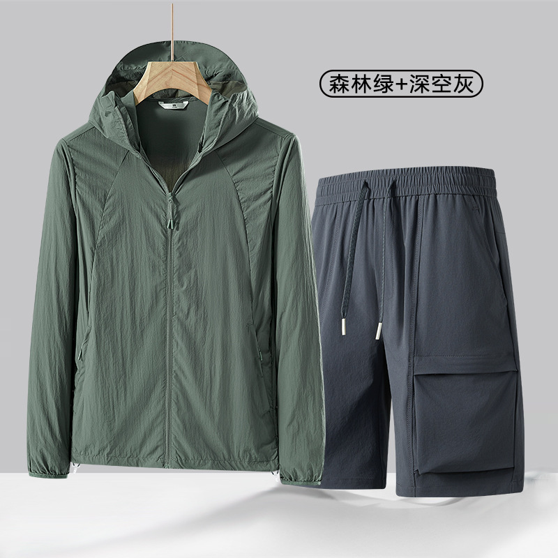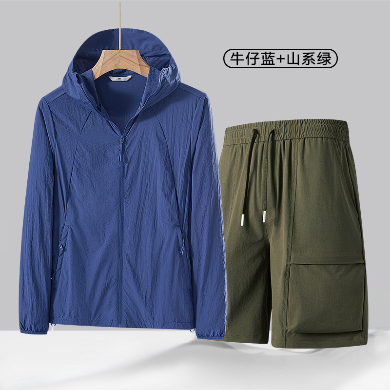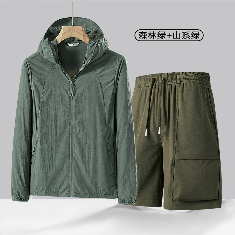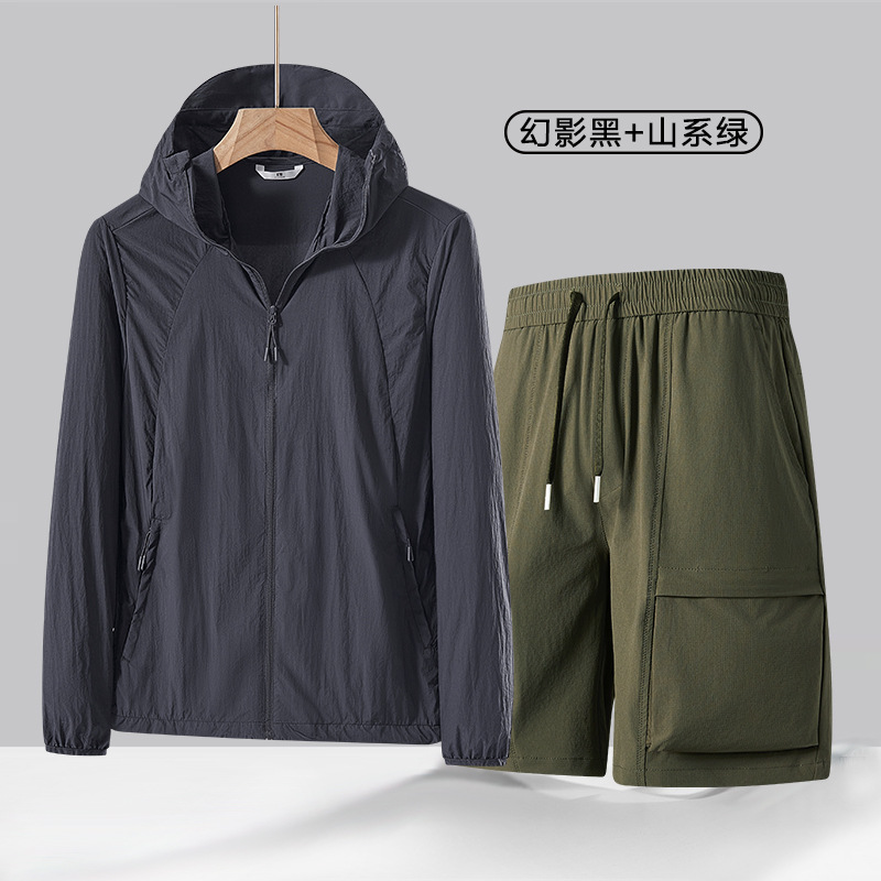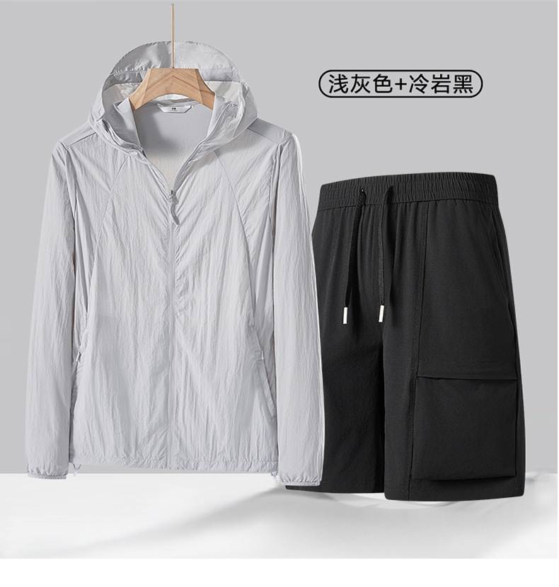 여름 자외선 차단 세트, 아이스 실크 속건성, 가벼운 피부 의류, 후드 자외선 차단 의류, 카고 반바지, 남성용 및 여성용 투피스 세트