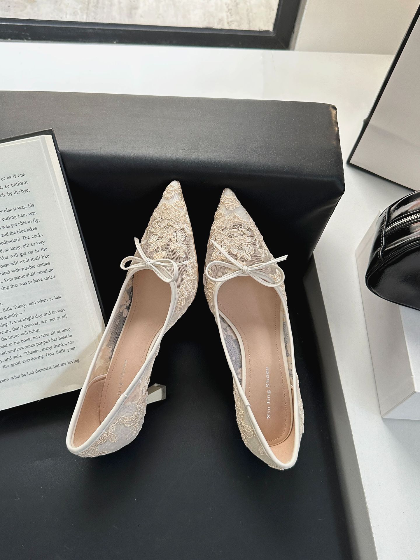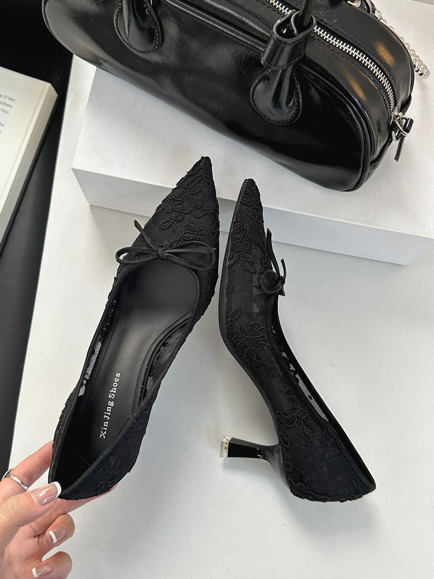 879-6 여성을위한 여름 새 스타일 나비 매듭 섹시한 메쉬 기질 레이스 신발 여성을위한 뾰족한 발가락 펌프 하이힐