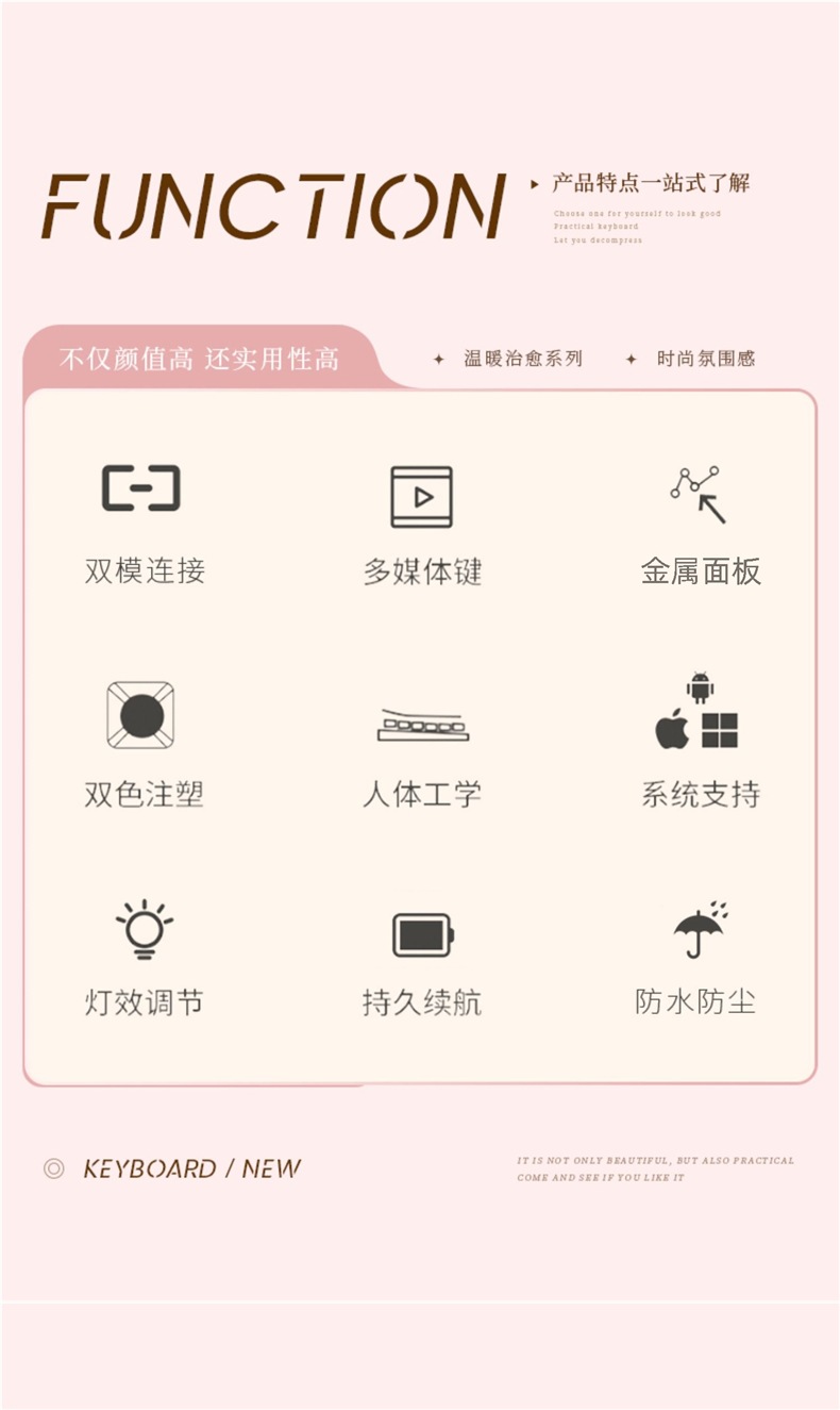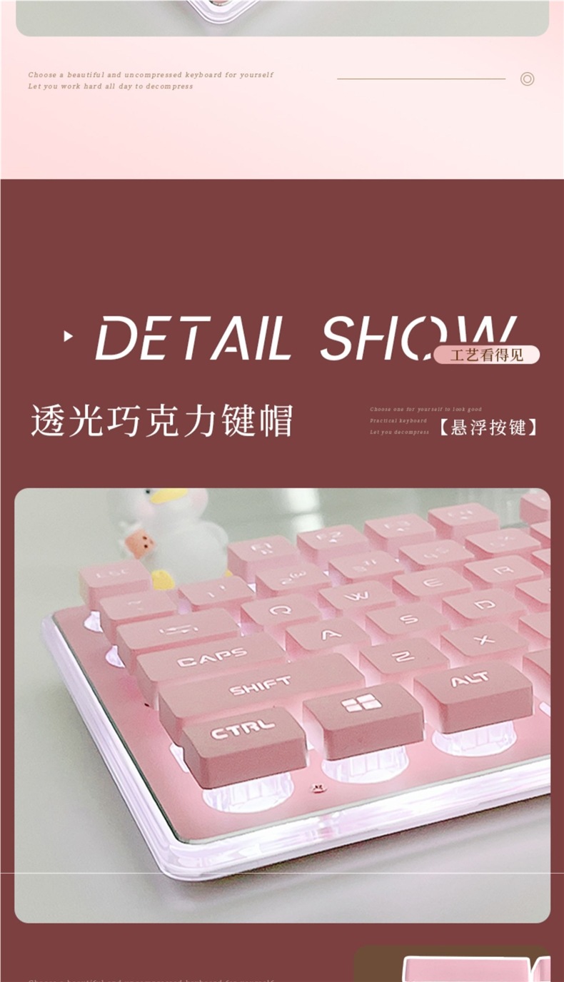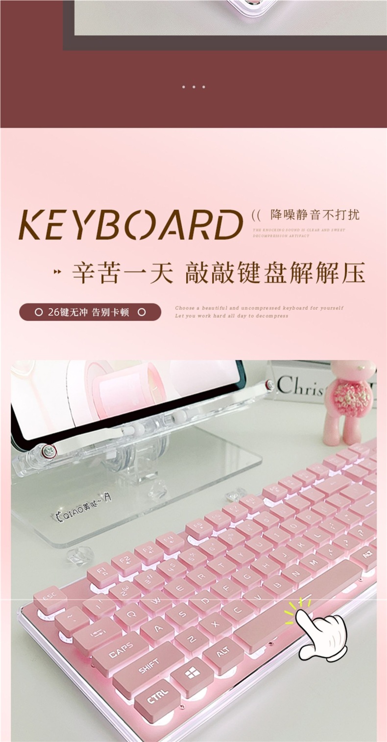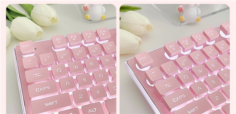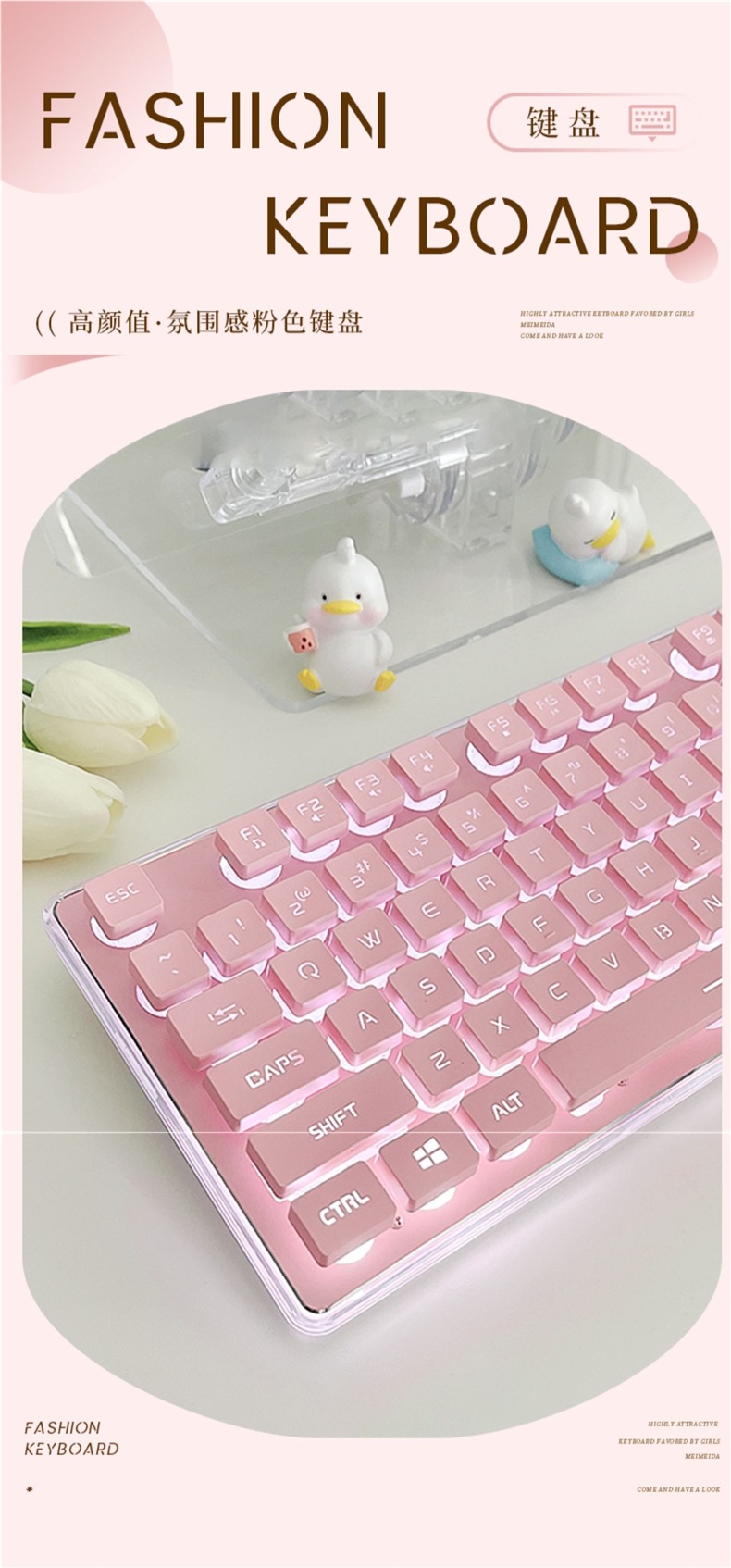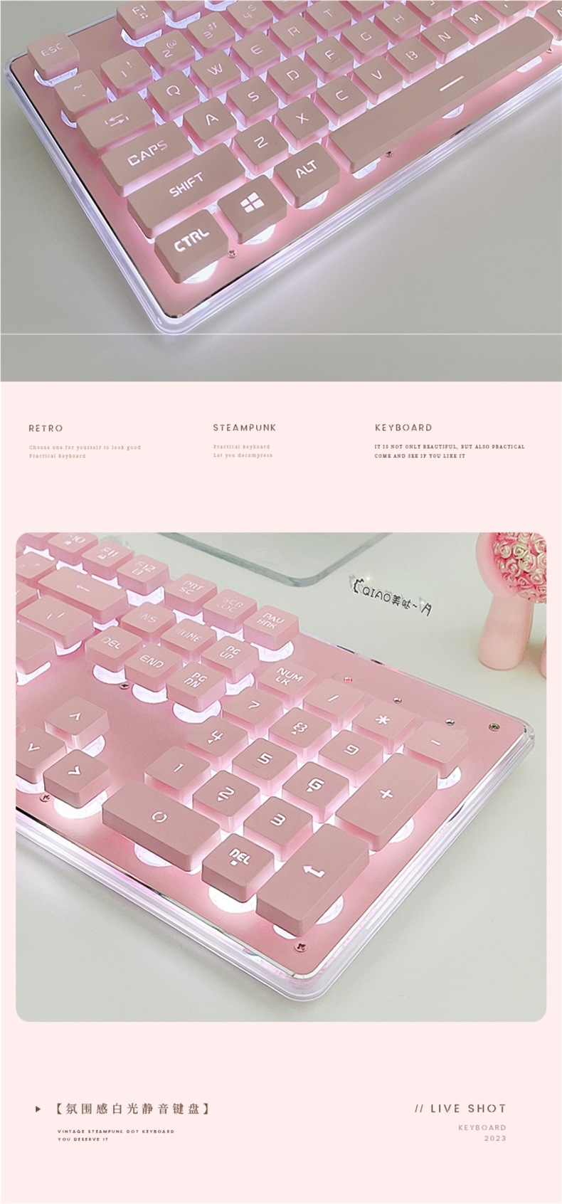• 기계적인 느낌 - 무선 세트 - 핑크 화이트 라이트 + 무선 마우스 [무음 및 충전식]