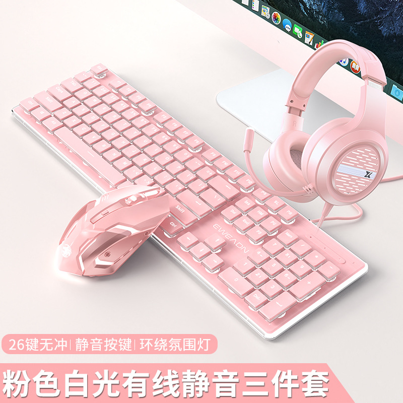 • 기계적인 느낌 - 유선 3종 세트 - 핑크색 백색광 + 마우스 + 헤드폰 [버튼 음소거]
