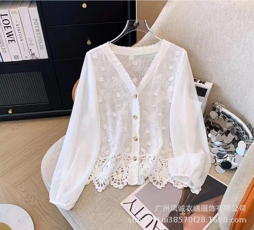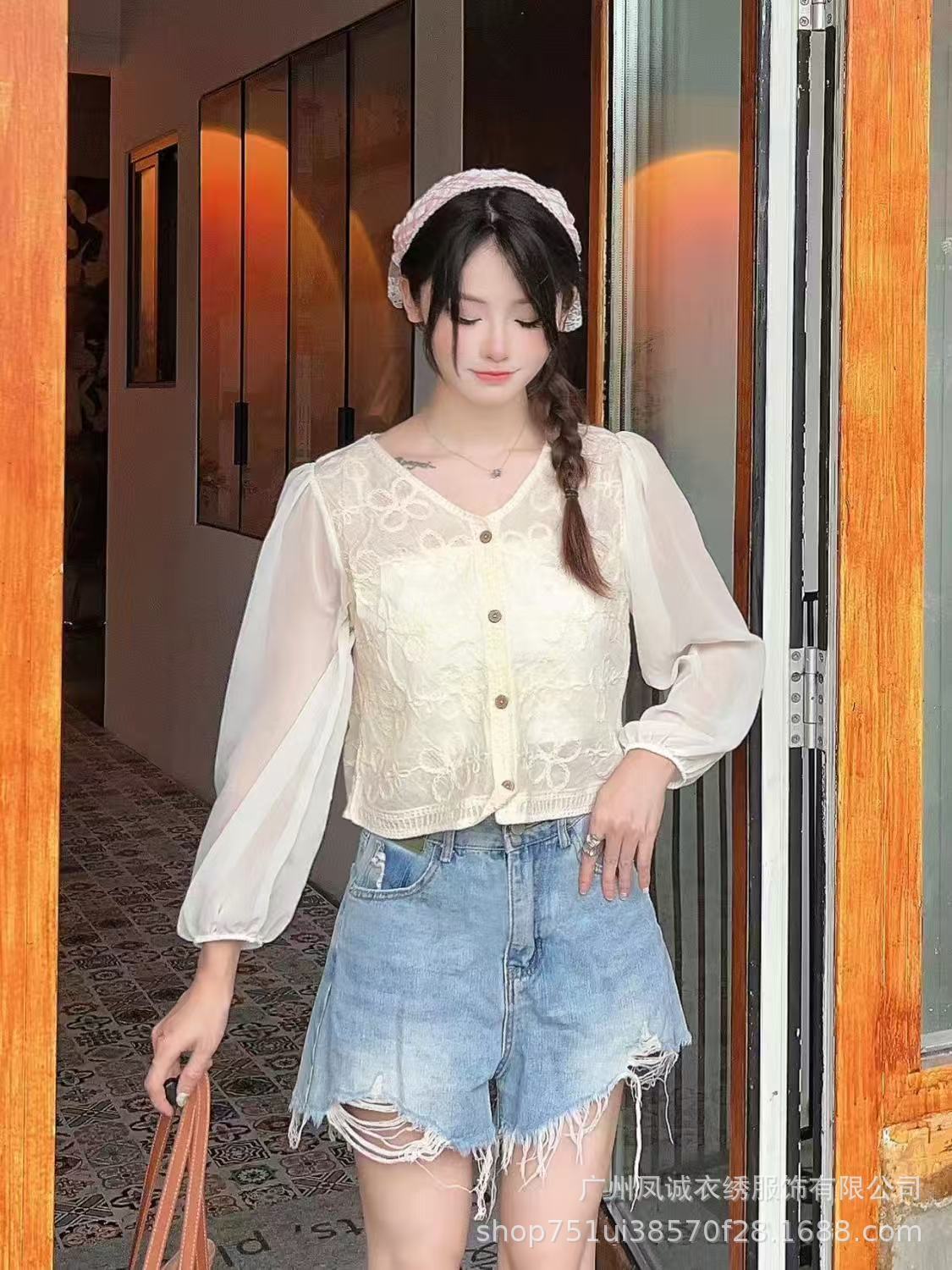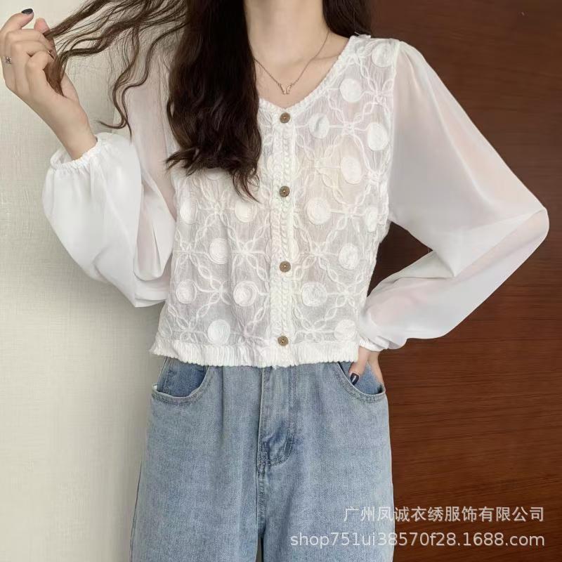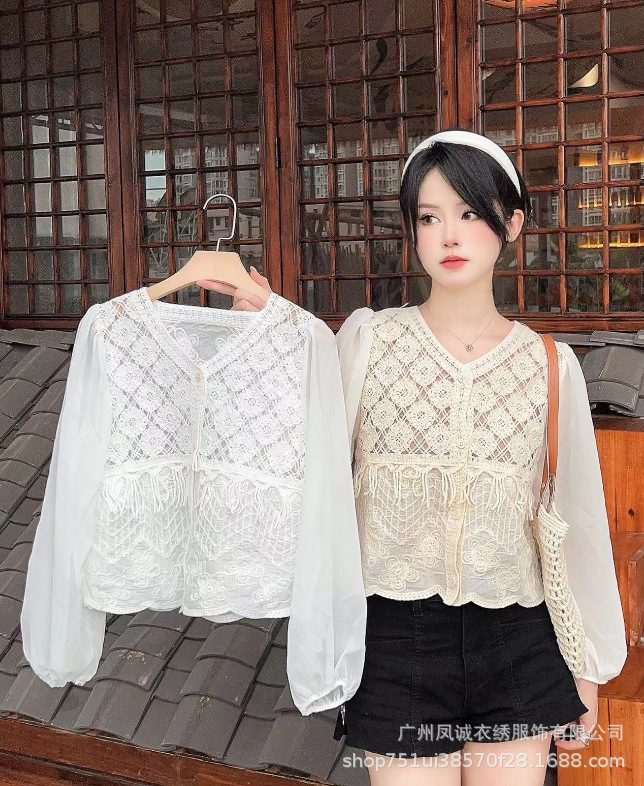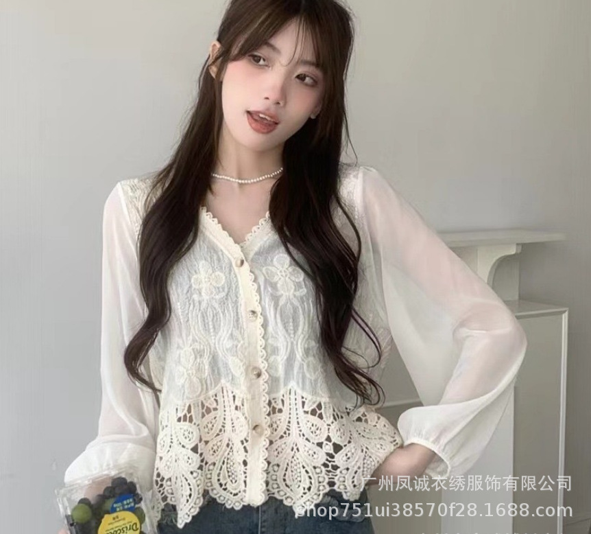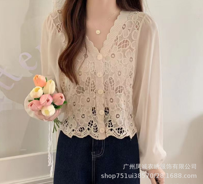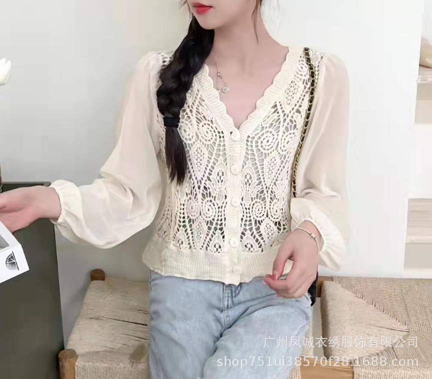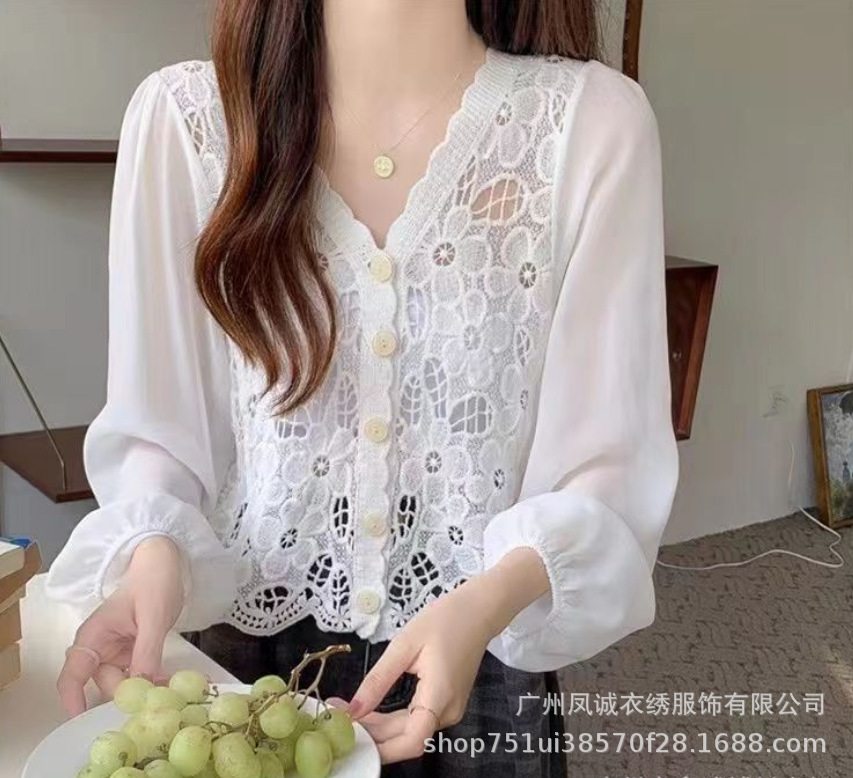 에스닉 스타일 여름 새로운 스플 라이스 v 넥 쉬폰 긴 소매 레이스 셔츠 니트 랜턴 슬리브 얇은 탑스토어 가기
