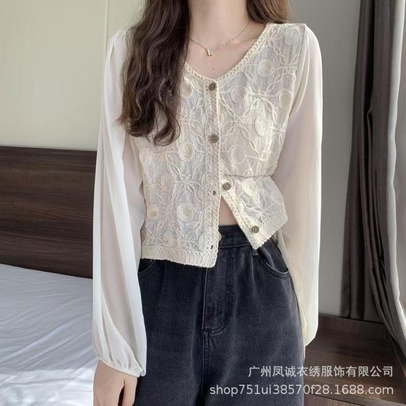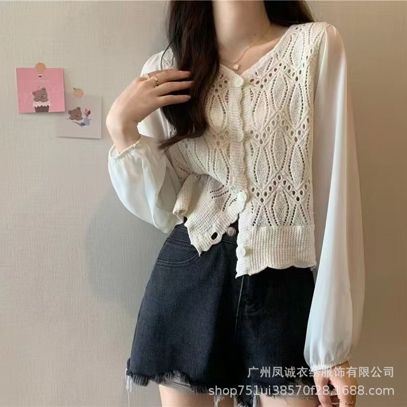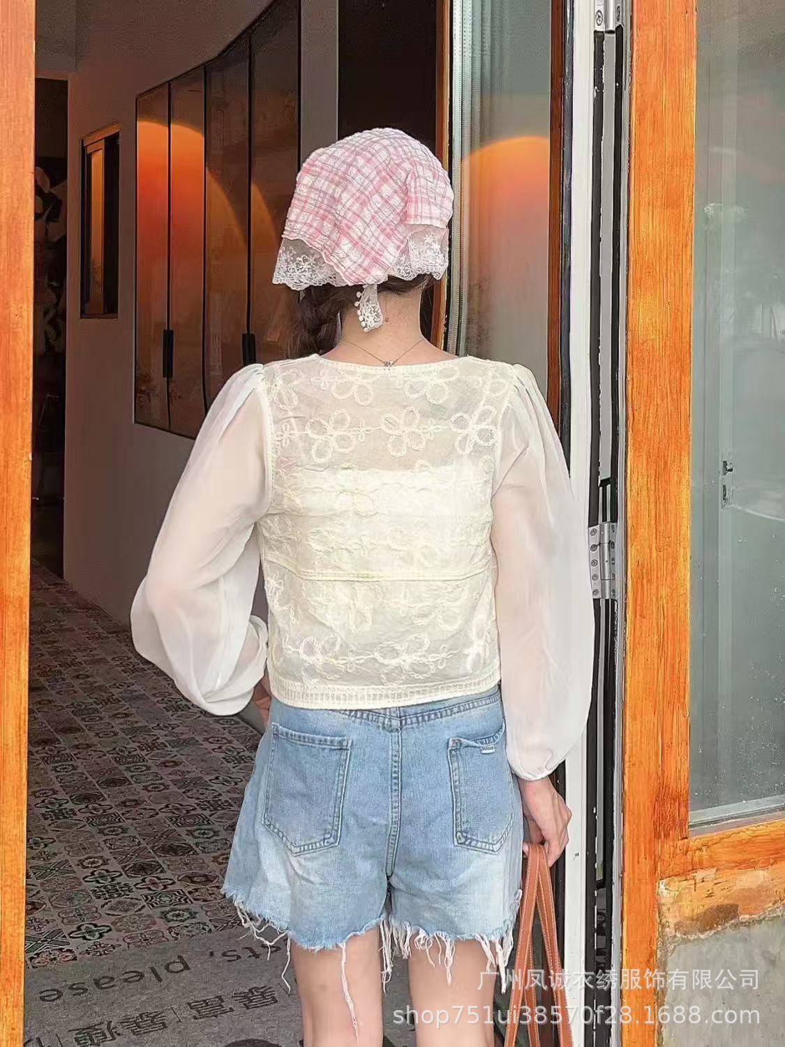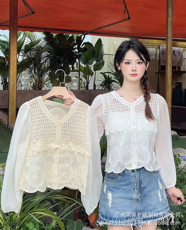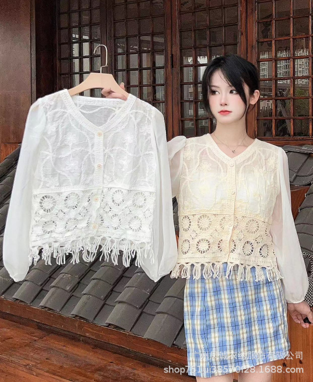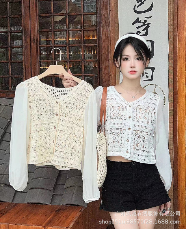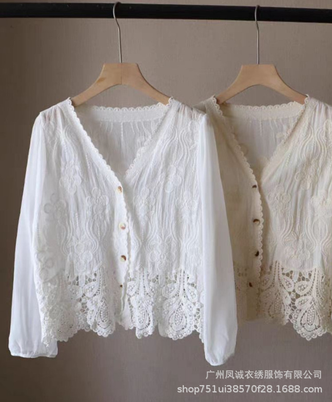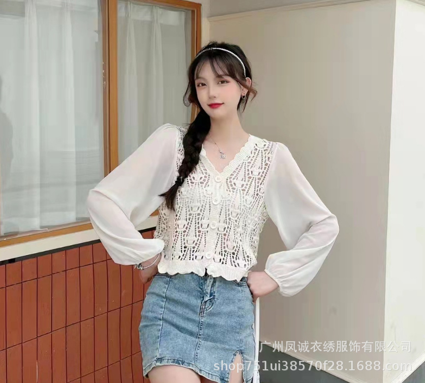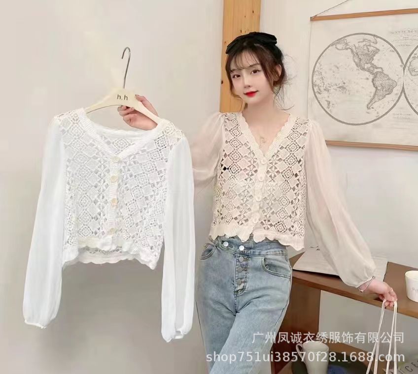 에스닉 스타일 여름 새로운 스플 라이스 v 넥 쉬폰 긴 소매 레이스 셔츠 니트 랜턴 슬리브 얇은 탑스토어 가기